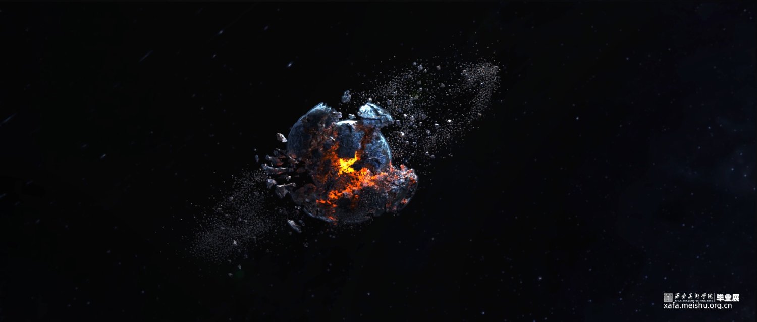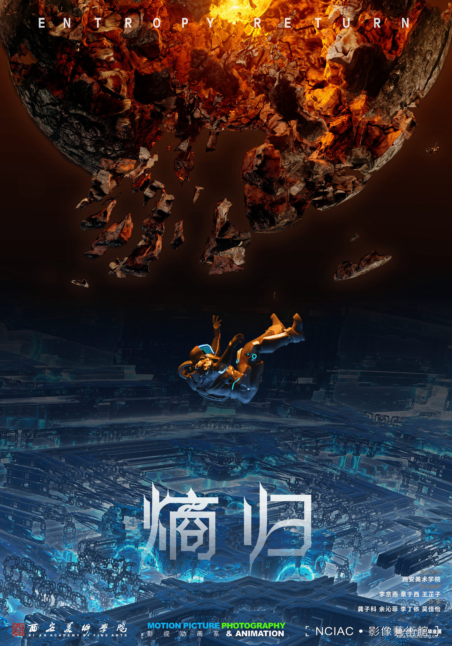 《熵归》作品描述:作品以科学概念“熵”为出发点,讲述了一个高等文明利用“熵减定律”,修复被行星撞碎后的地球的科幻故事。在当今科学理论“熵增定律”的概念下,万事万物都将在时间长河中走向灭亡,文明会消亡,宇宙会陷入死寂,仿佛预示着所有事物都注定会有个悲惨的结局。本作品探讨了一种“熵减”的可能,并将“熵减”以主观影像形式呈现。作品利用了时间的逆向流动,物质的溯源回转等概念辅助表达了抽象无形的“熵减定律”,表现了一个覆水能收,破镜重圆的“熵减”世界。