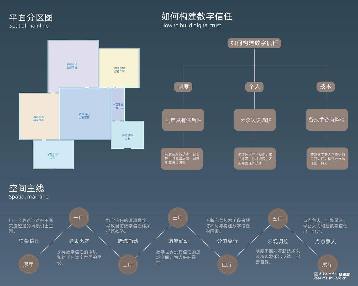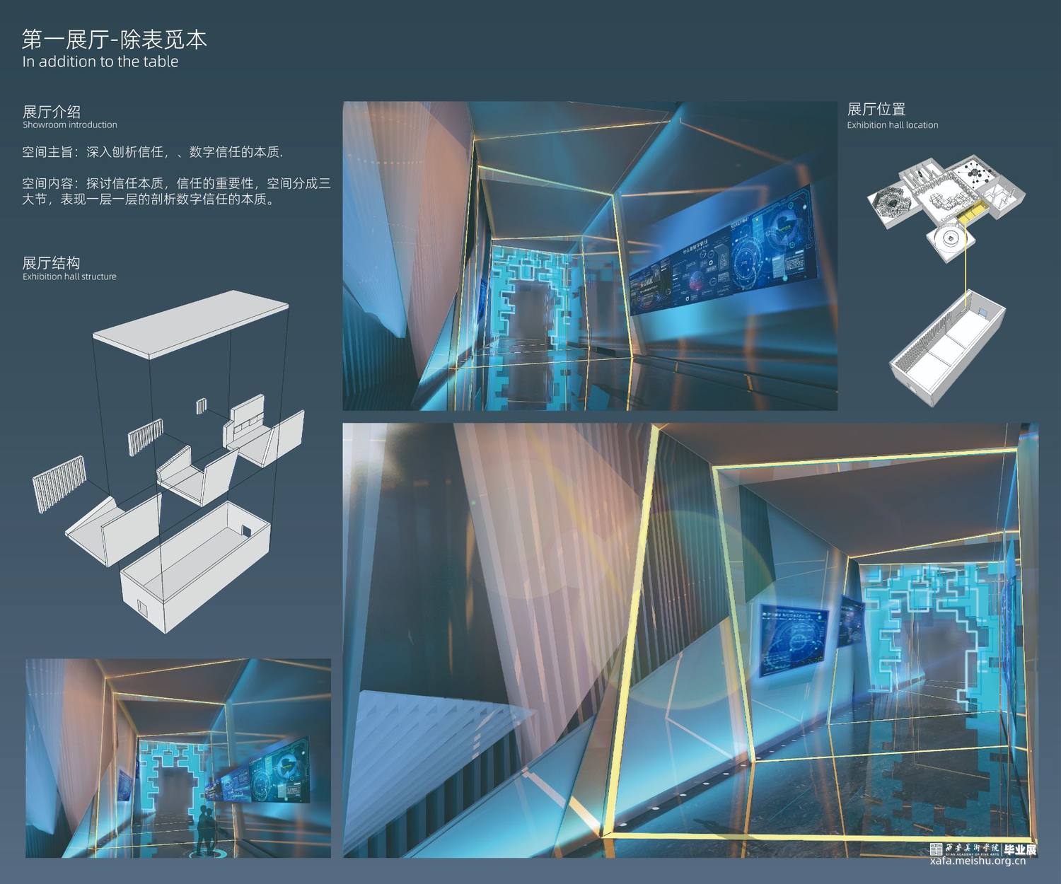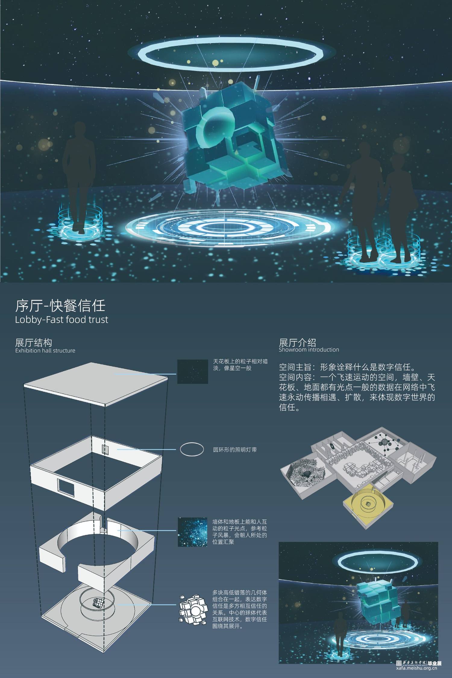 序厅-快餐信任、第一展厅-除表觅本、第二展厅-暗流涌动 、第三展厅-分崩离析、第四展厅-未雨绸缪、第五展厅-宏观调控、尾厅-点点萤火。