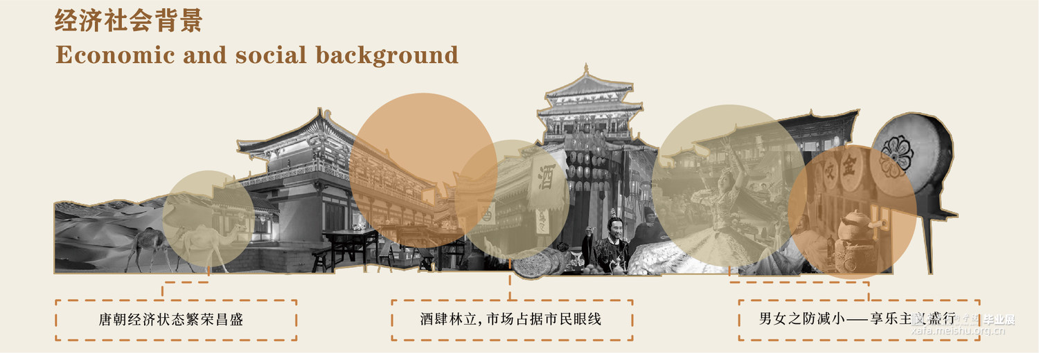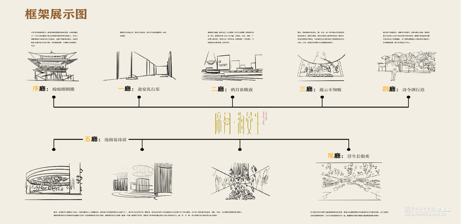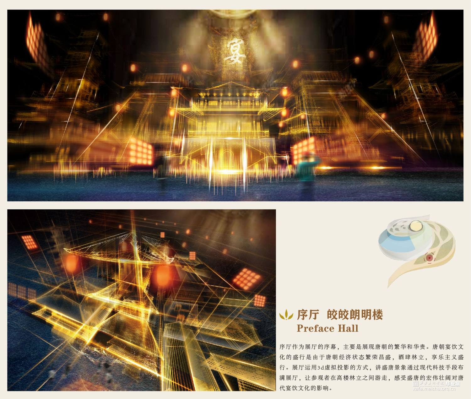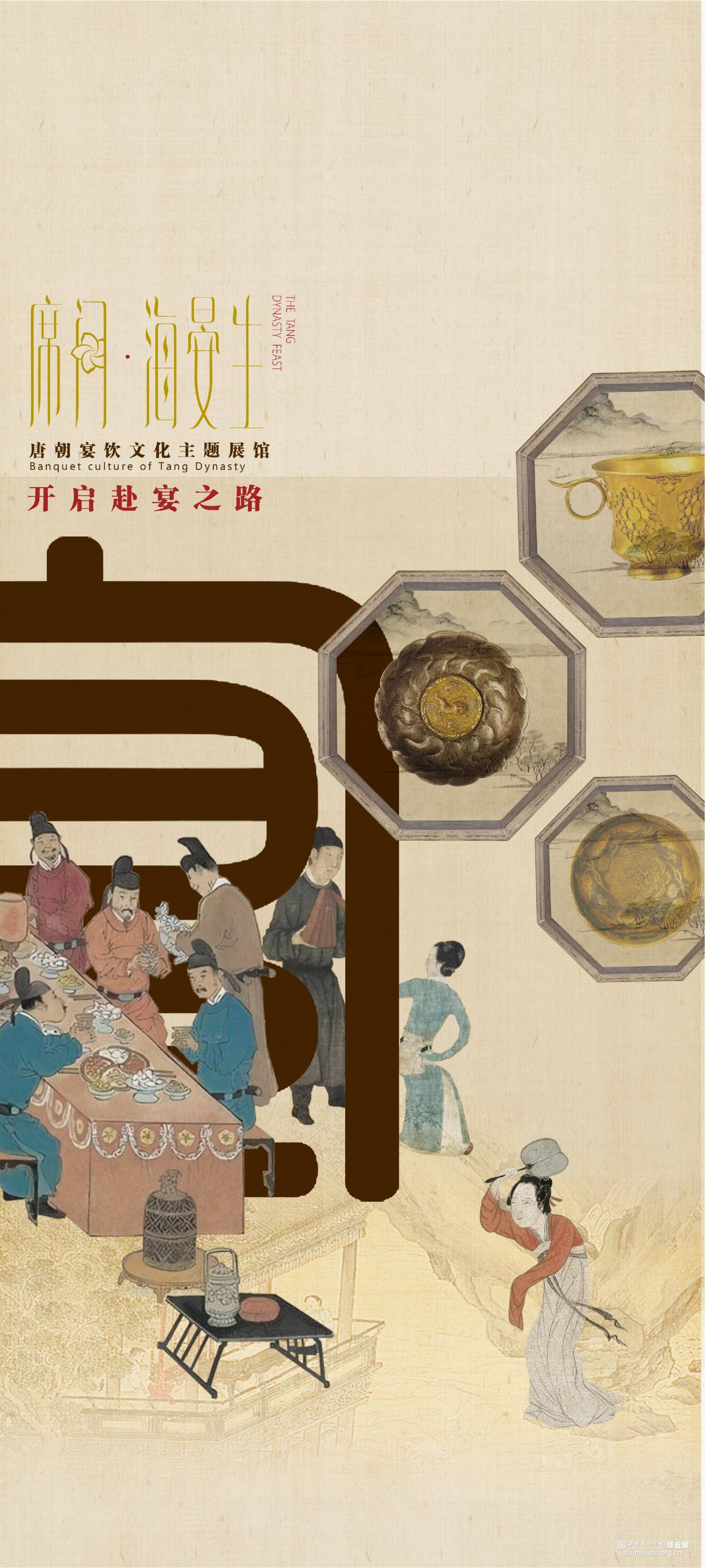 席间·海晏生以唐朝宴饮文化为切入点,运用叙事性空间的设计手法。以唐朝繁盛的经济文化为引,通过“入宴—开宴—闭宴—散宴”明暗两线来串联整个展厅,明线是通过宴的整个流程让参观者体验赴宴之路,“开宴”作为整个展厅的高潮部分。暗线则是贯穿礼仪、饮食、歌舞、行酒令、诗词等部分,让唐朝宴饮文化通过多媒体技术在展厅中得以清晰呈现在观者眼中,加深人们对唐朝宴饮文化的认识。运用展陈形式和技术体验赴宴之路,打造未来展陈空间,革新展陈方式,对传统文化进行传承与保护。