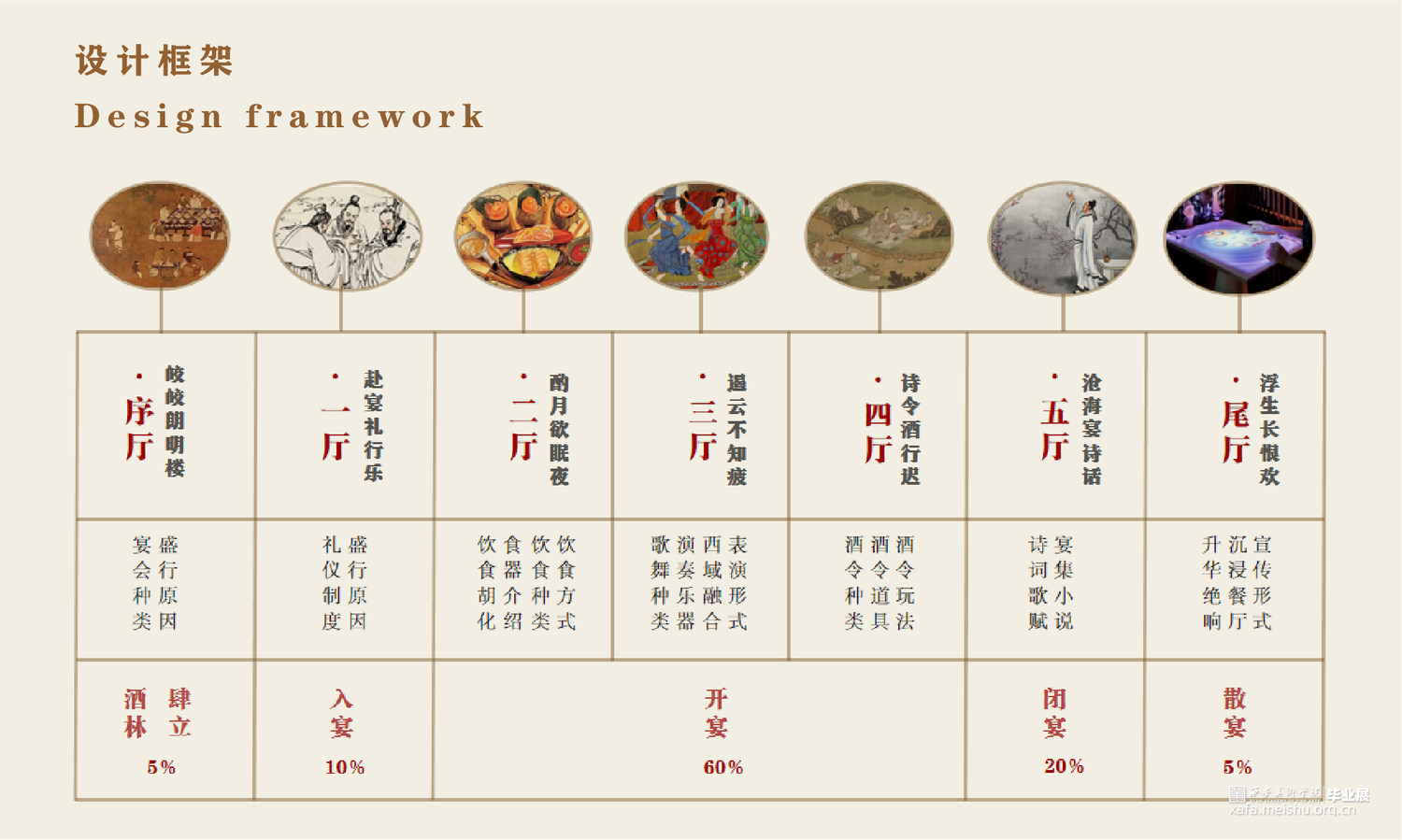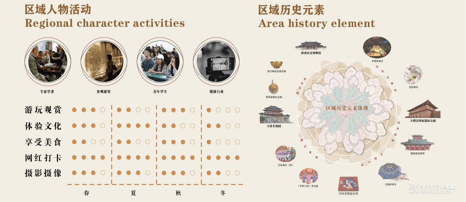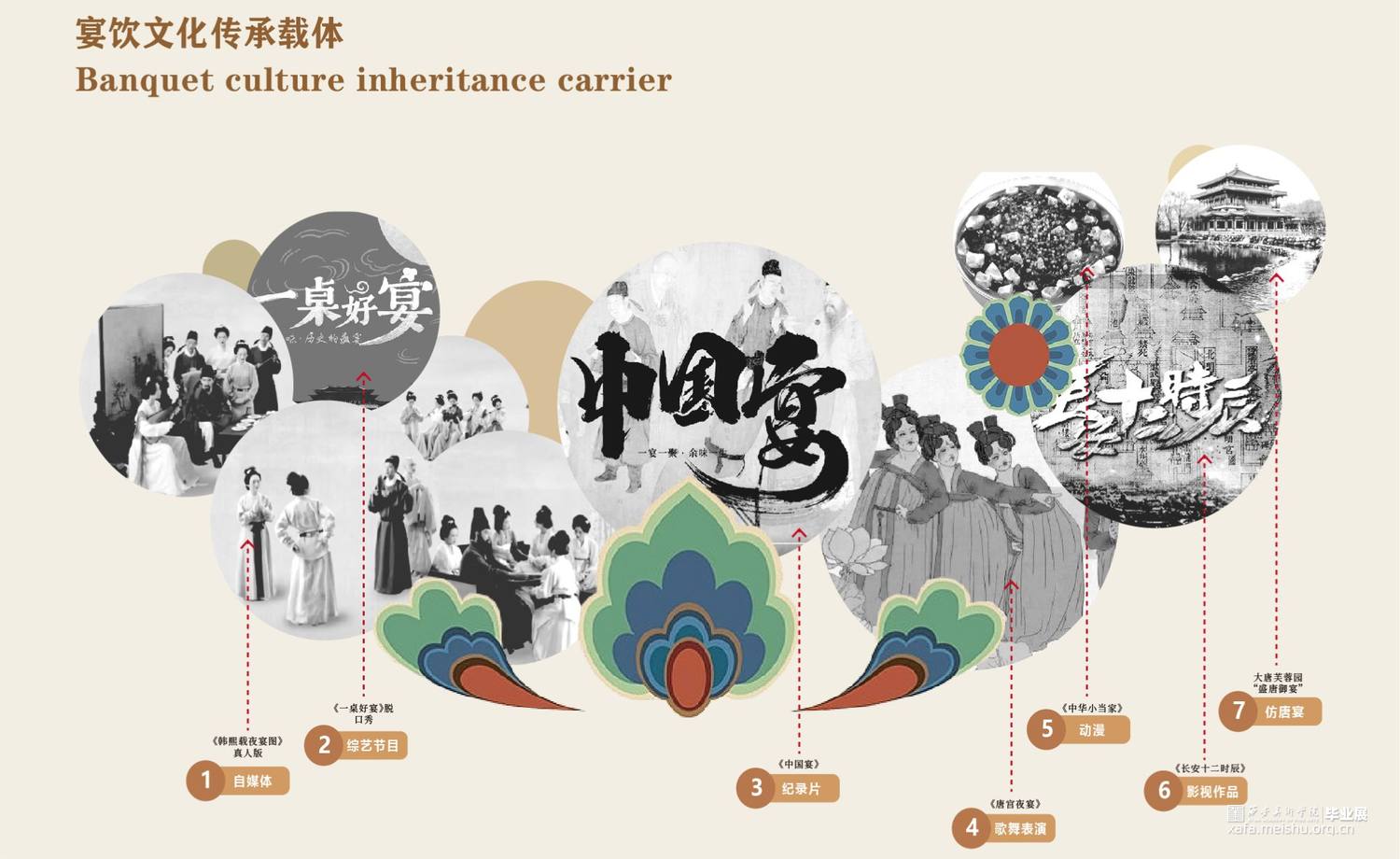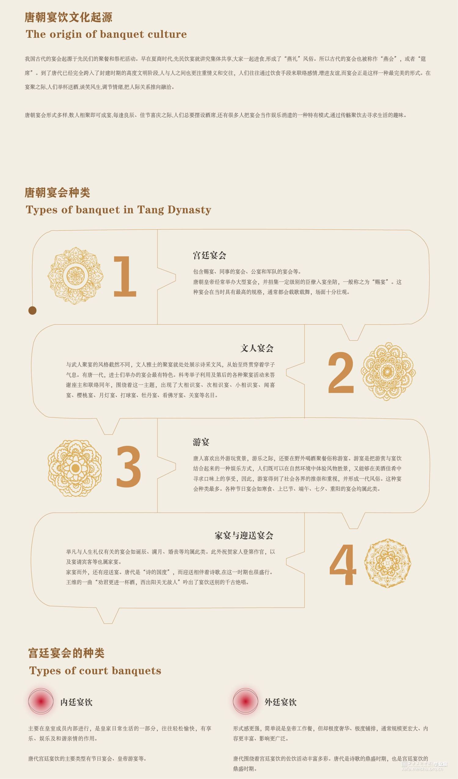 席间·海晏生以唐朝宴饮文化为切入点,运用叙事性空间的设计手法。以唐朝繁盛的经济文化为引,通过“入宴—开宴—闭宴—散宴”明暗两线来串联整个展厅,明线是通过宴的整个流程让参观者体验赴宴之路,“开宴”作为整个展厅的高潮部分。暗线则是贯穿礼仪、饮食、歌舞、行酒令、诗词等部分,让唐朝宴饮文化通过多媒体技术在展厅中得以清晰呈现在观者眼中,加深人们对唐朝宴饮文化的认识。运用展陈形式和技术体验赴宴之路,打造未来展陈空间,革新展陈方式,对传统文化进行传承与保护。
