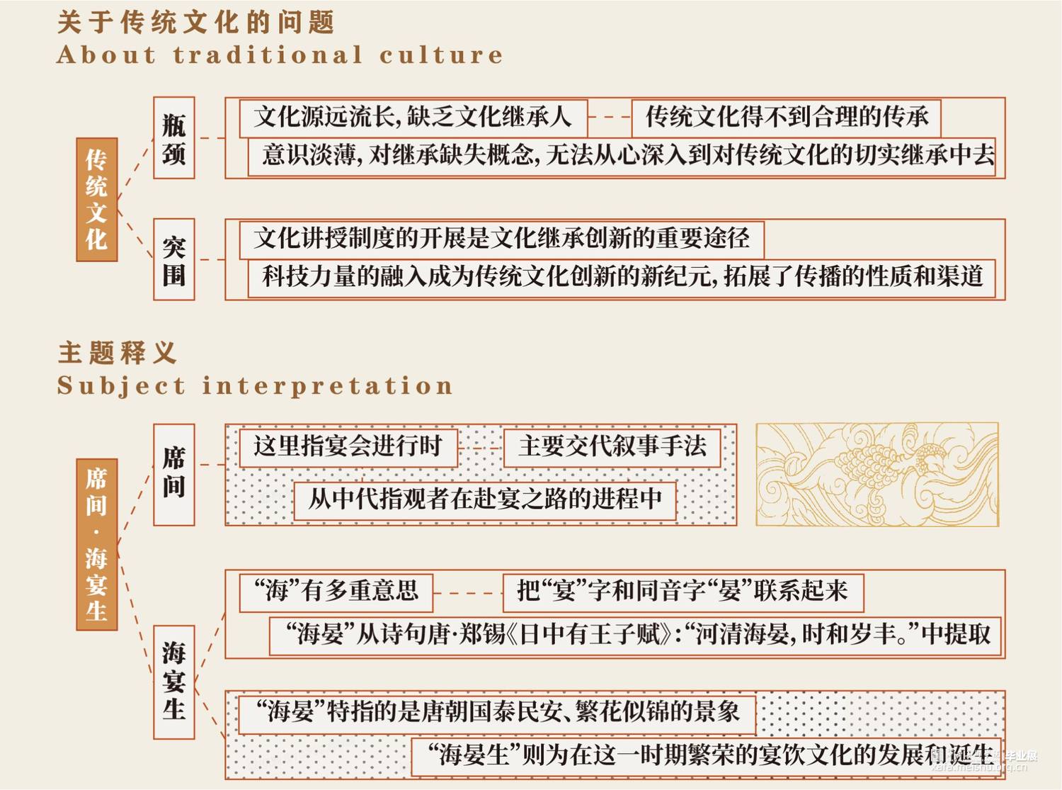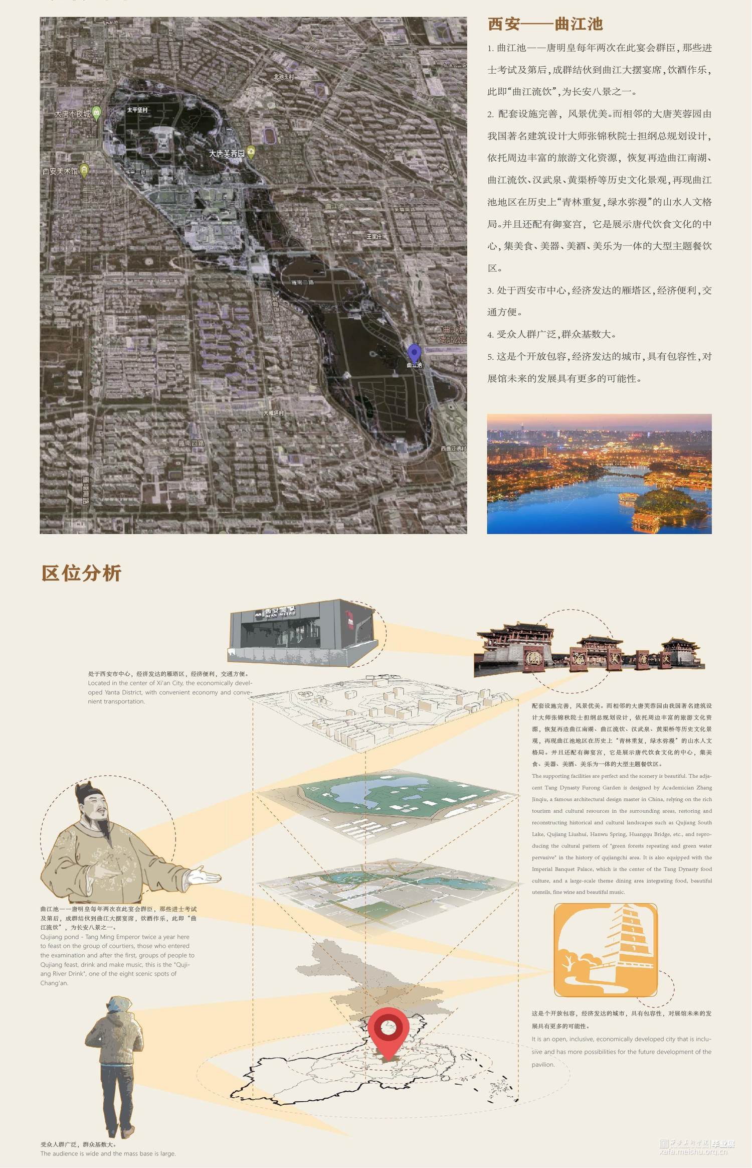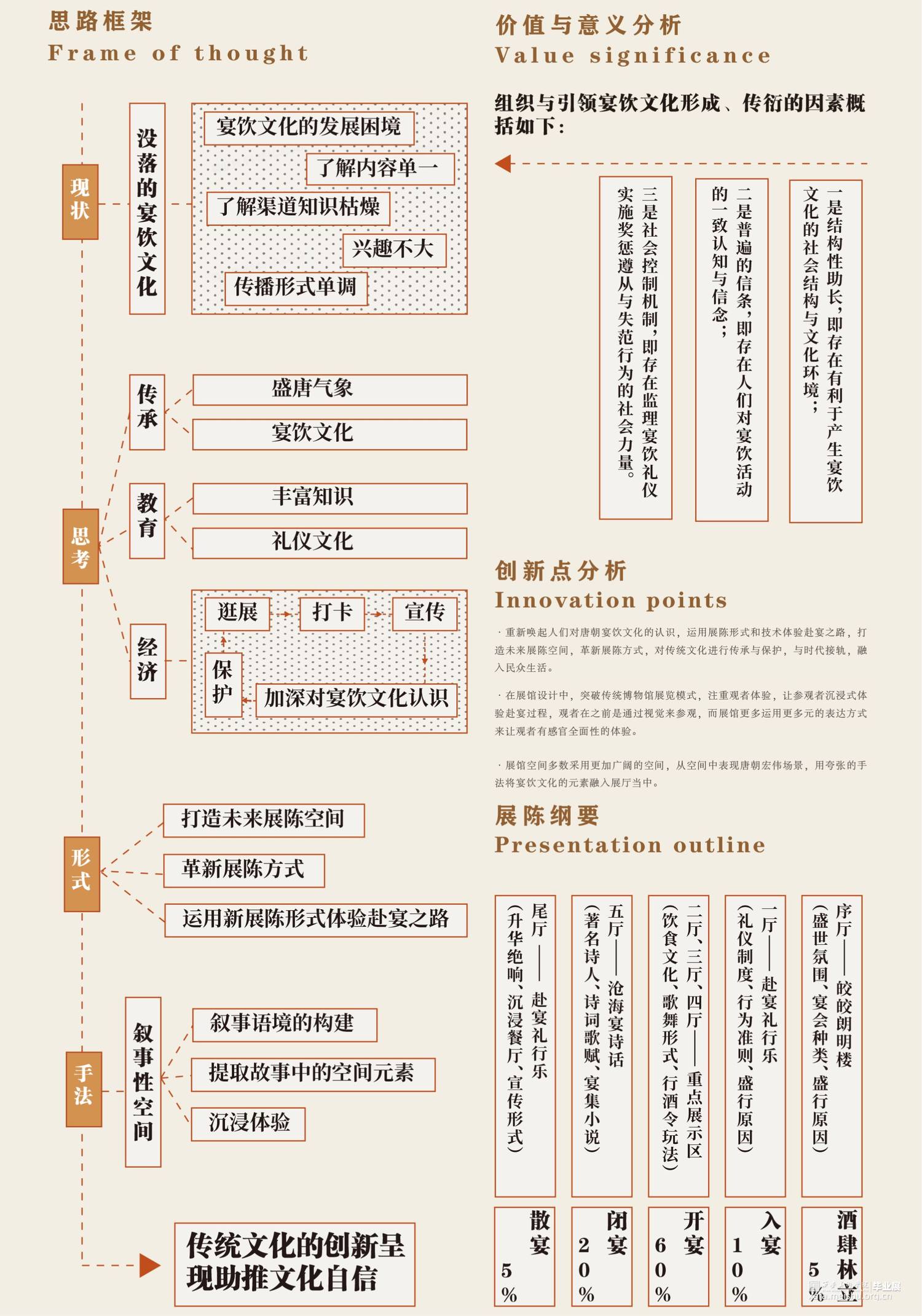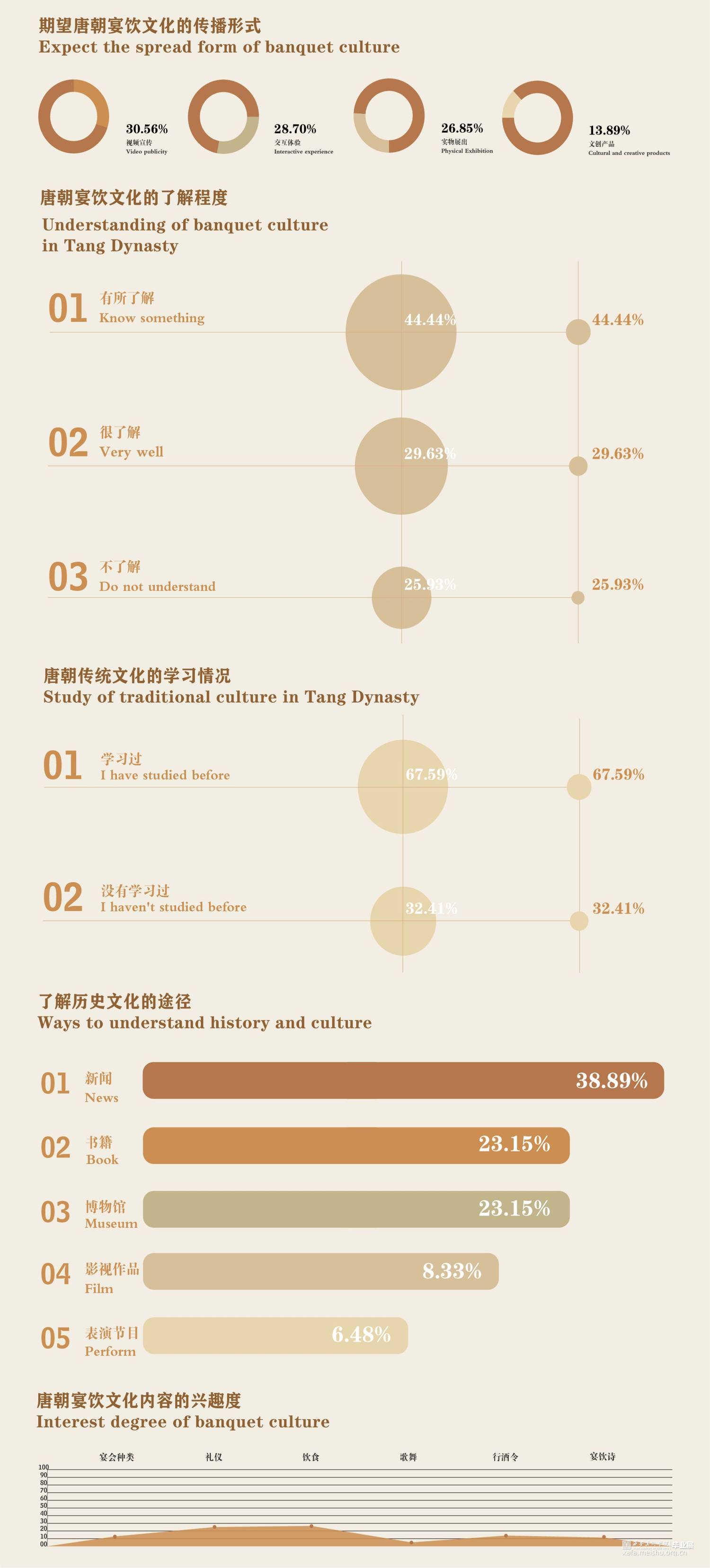 席间·海晏生以唐朝宴饮文化为切入点,运用叙事性空间的设计手法。以唐朝繁盛的经济文化为引,通过“入宴—开宴—闭宴—散宴”明暗两线来串联整个展厅,明线是通过宴的整个流程让参观者体验赴宴之路,“开宴”作为整个展厅的高潮部分。暗线则是贯穿礼仪、饮食、歌舞、行酒令、诗词等部分,让唐朝宴饮文化通过多媒体技术在展厅中得以清晰呈现在观者眼中,加深人们对唐朝宴饮文化的认识。运用展陈形式和技术体验赴宴之路,打造未来展陈空间,革新展陈方式,对传统文化进行传承与保护。