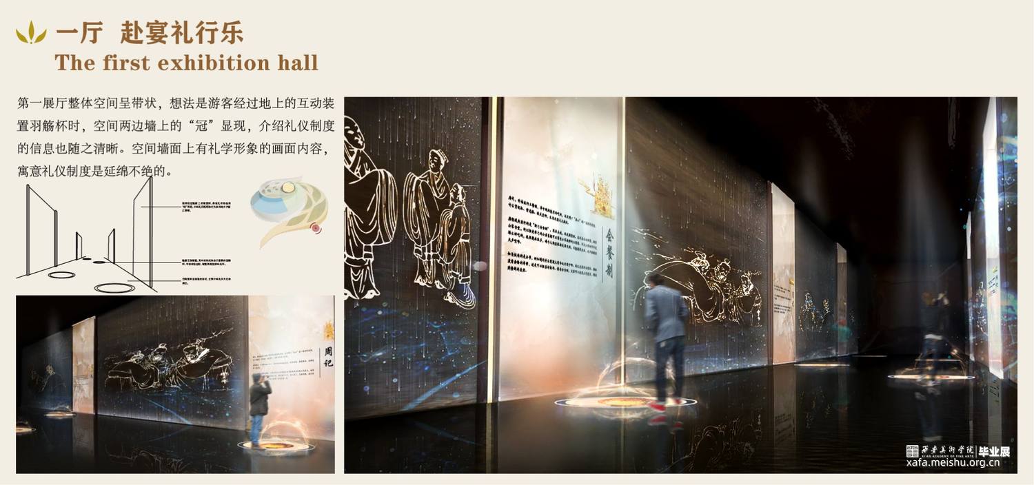 第一展厅中整体空间呈带状,通过羽觞杯的元素与观者产生互动从而介绍唐朝宴饮的礼仪文化。