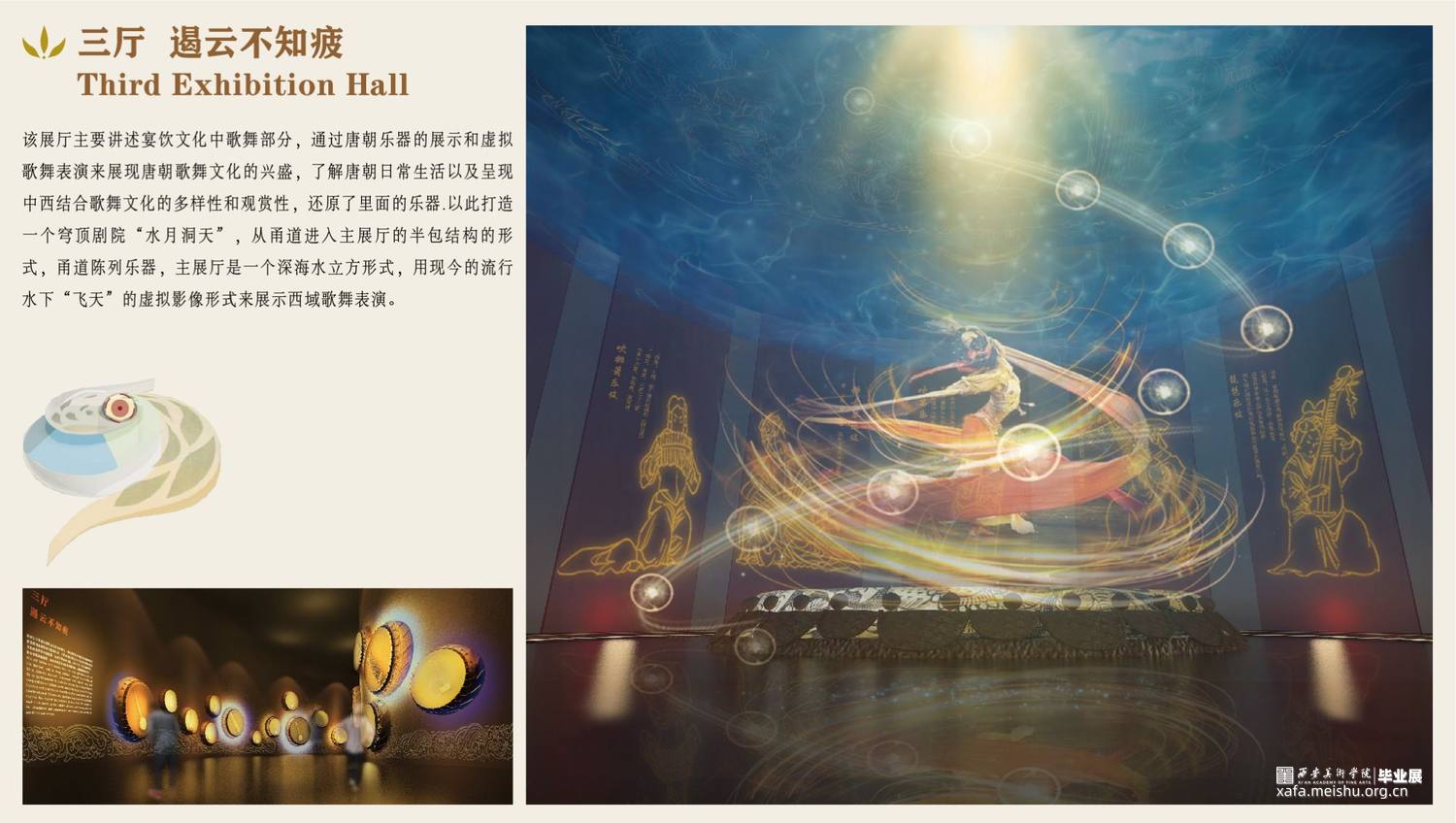 第三展厅中,该展厅主要讲述唐朝宴饮文化中歌舞环节,通过唐朝乐器的展示和虚拟歌舞表演来展现唐朝歌舞文化的兴盛和中西文化的融合,了解中西结合歌舞文化的多样性。