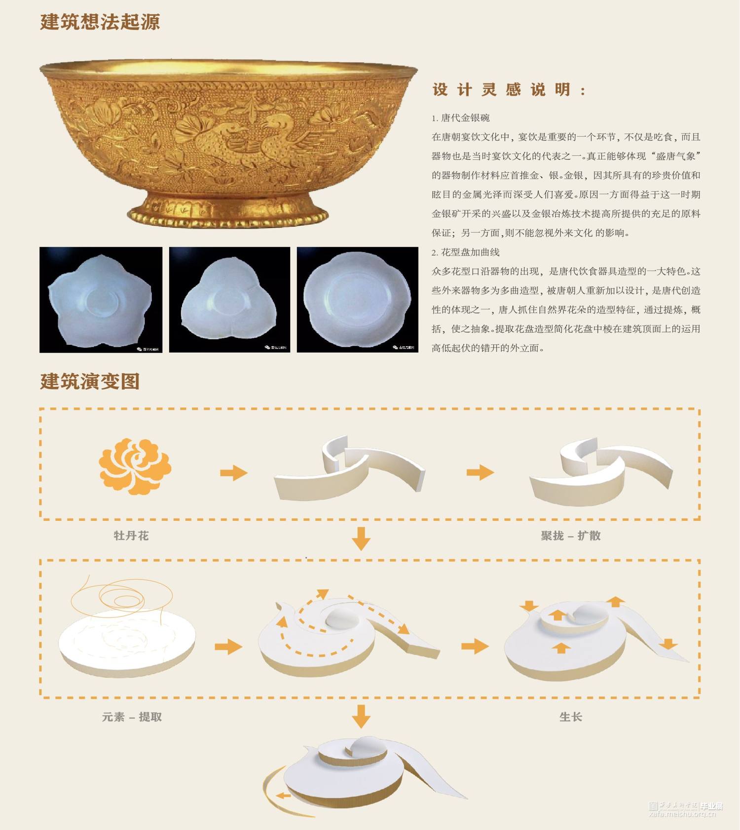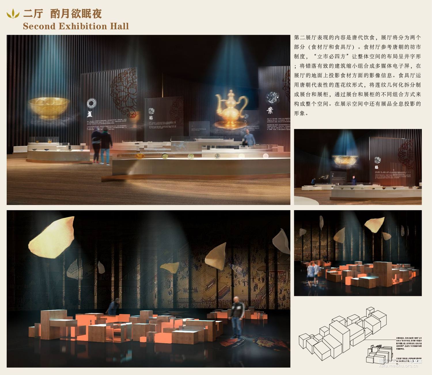 第二展厅表现的内容是唐代饮食,展厅将分为两个部分,通过多媒体投影以及异形展柜和展台的方式介绍唐代食材食具。