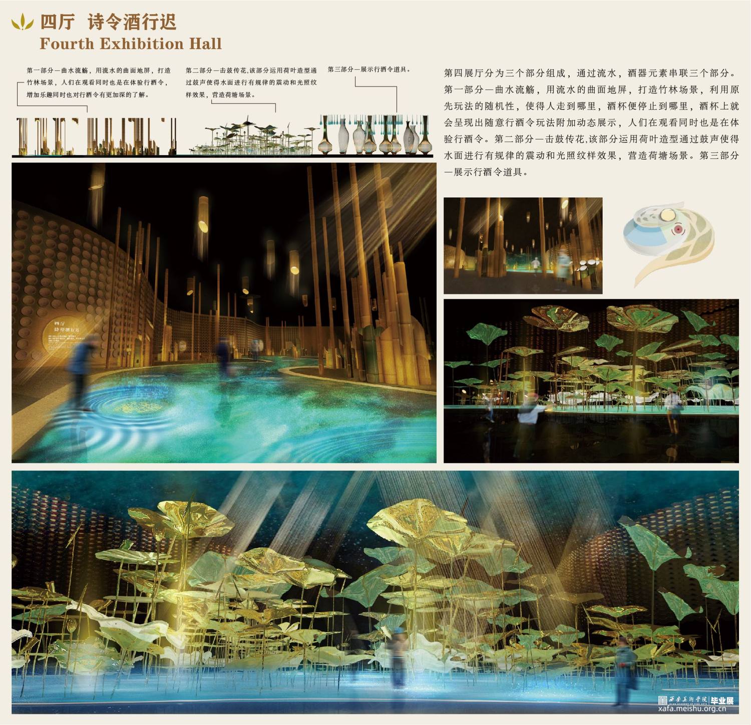 第四展厅中分为三个部分组成,通过流水,酒器元素串联三个部分。以夸张大胆的设计手法体验唐朝酒令之乐。