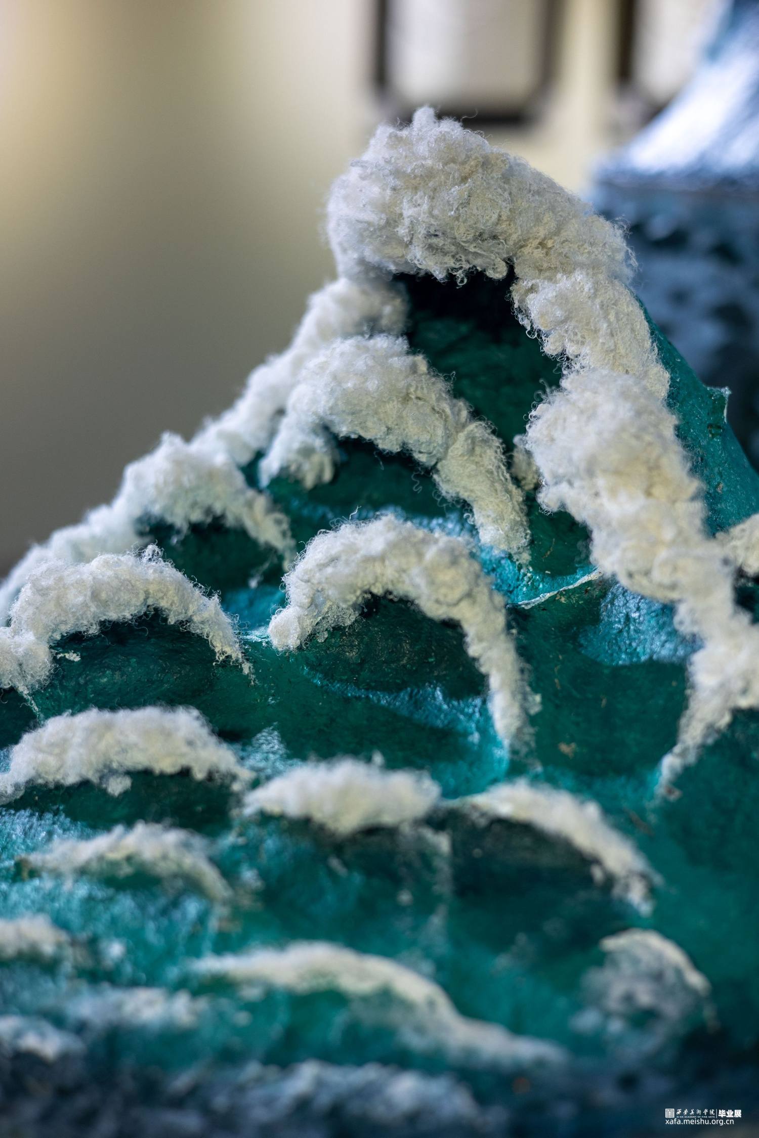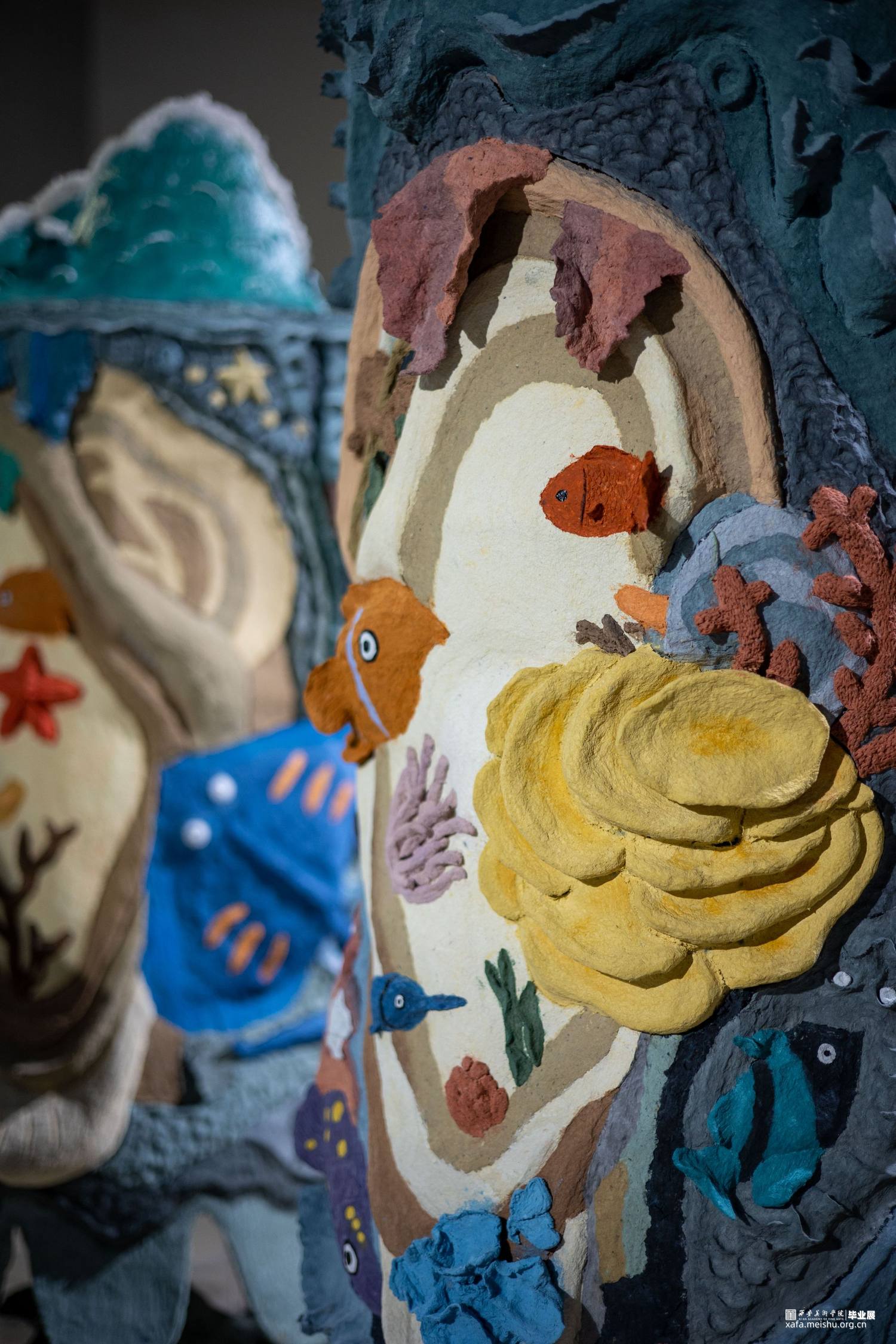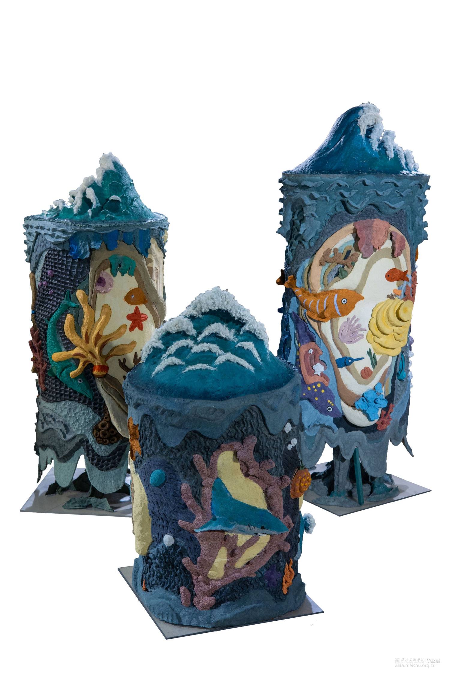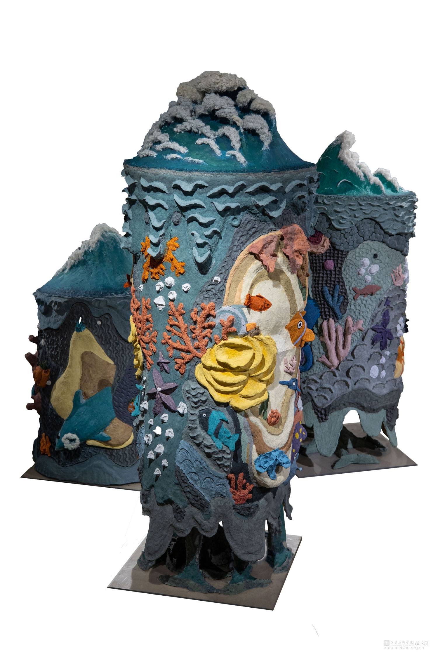 该创作2022年3月中旬开始构思,并用电脑及iPad设计绘制,立体以圆柱为造型,图案由耳朵,海洋,海洋生物组成。以蓝色为主。2022年4月25日开始着手制作,到2022年5月26日制作完成,历时一个月完工。工艺上使用纸浆,用童真的思维以具体形象为主,尝试用儿童语言来进行制作这个立体作品,“大人做不出来儿童的东西”,但都忘了“大人曾经也是儿童”。在实现这个立体纸浆工艺之前,要打下底座基础,做好底座,备好大量的报纸、白纸、白乳胶等所需的材料,一个桶每一道工序都需要纯手工制作,从大的面积到小的珊瑚,至少需要十天的时间。每一个纹理,形状都根据图案需要。海浪为衬托作用。浪高在20厘米左右。海浪的起伏而起伏。为达到白浪花的效果,于是采取棉花+白乳胶来塑造成白浪花。本组独创在导师指导下,独立进行创作制作获取的真实成果。