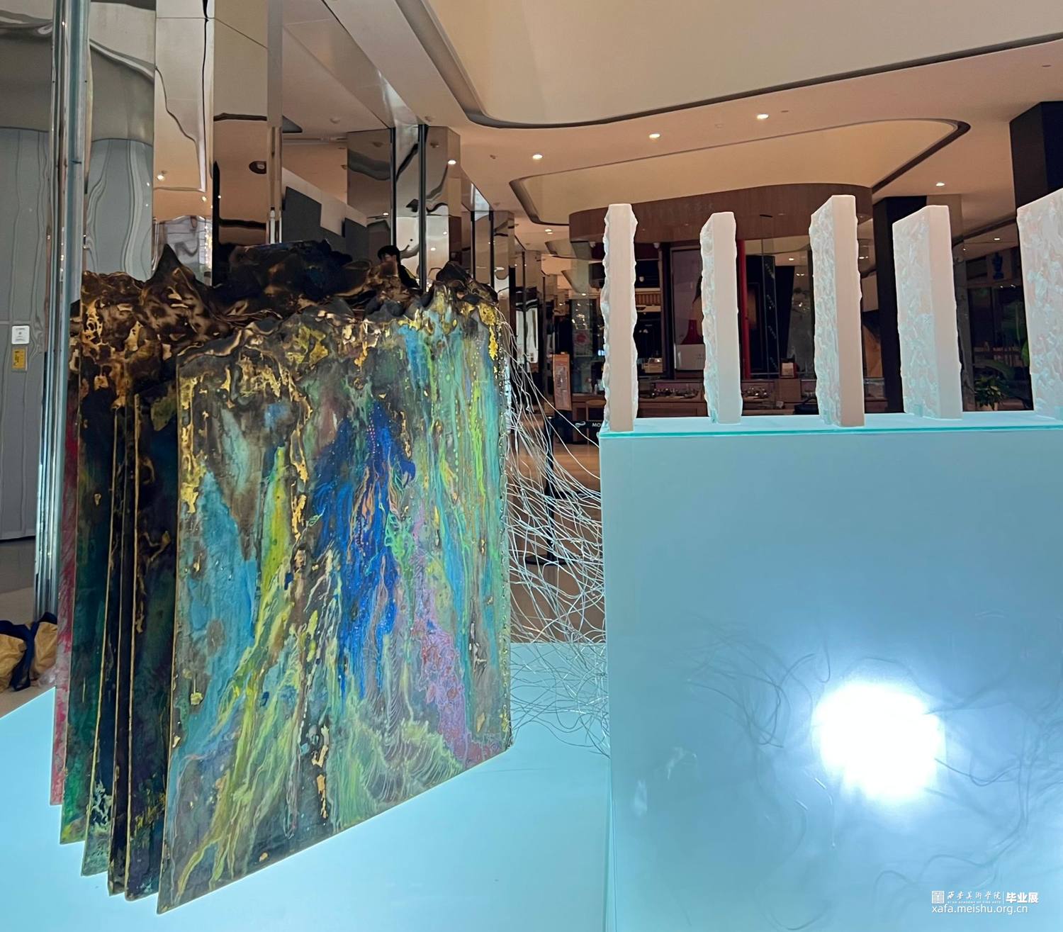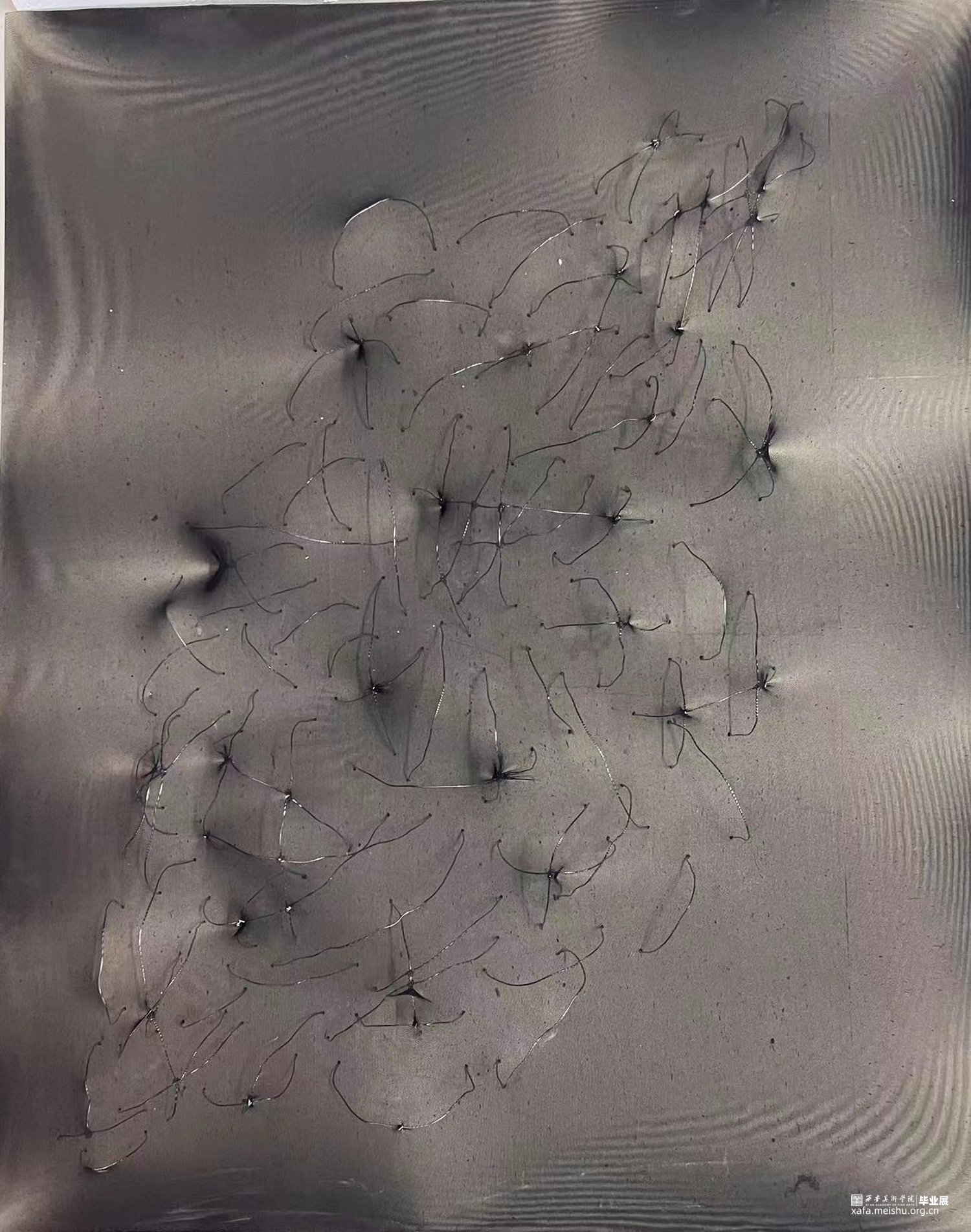 张妍:“我的这个部分是我理解的痕,这里的痕更多的是指伤痕,我产生创作这个作品的想法是因为我发现随着年纪的增长,我们心灵承受的东西越来越多,就像大家说的心累,身体遭受的是可以被看见的伤,伤好了之后有时也会留下一道清晰的疤痕,但是在心灵中的精神上的伤痕是无法被看到,甚至有时是无法开口诉说的,于是我就想通过不同的材料,不同的创作手法来表现这些无法被看到的伤痕,在材料选择上,我是比较贪心的,因为伤痕不是一种样子,它是多种多样的,同时考虑到观赏的趣味性,希望每一页带给大家不同的感受。"
