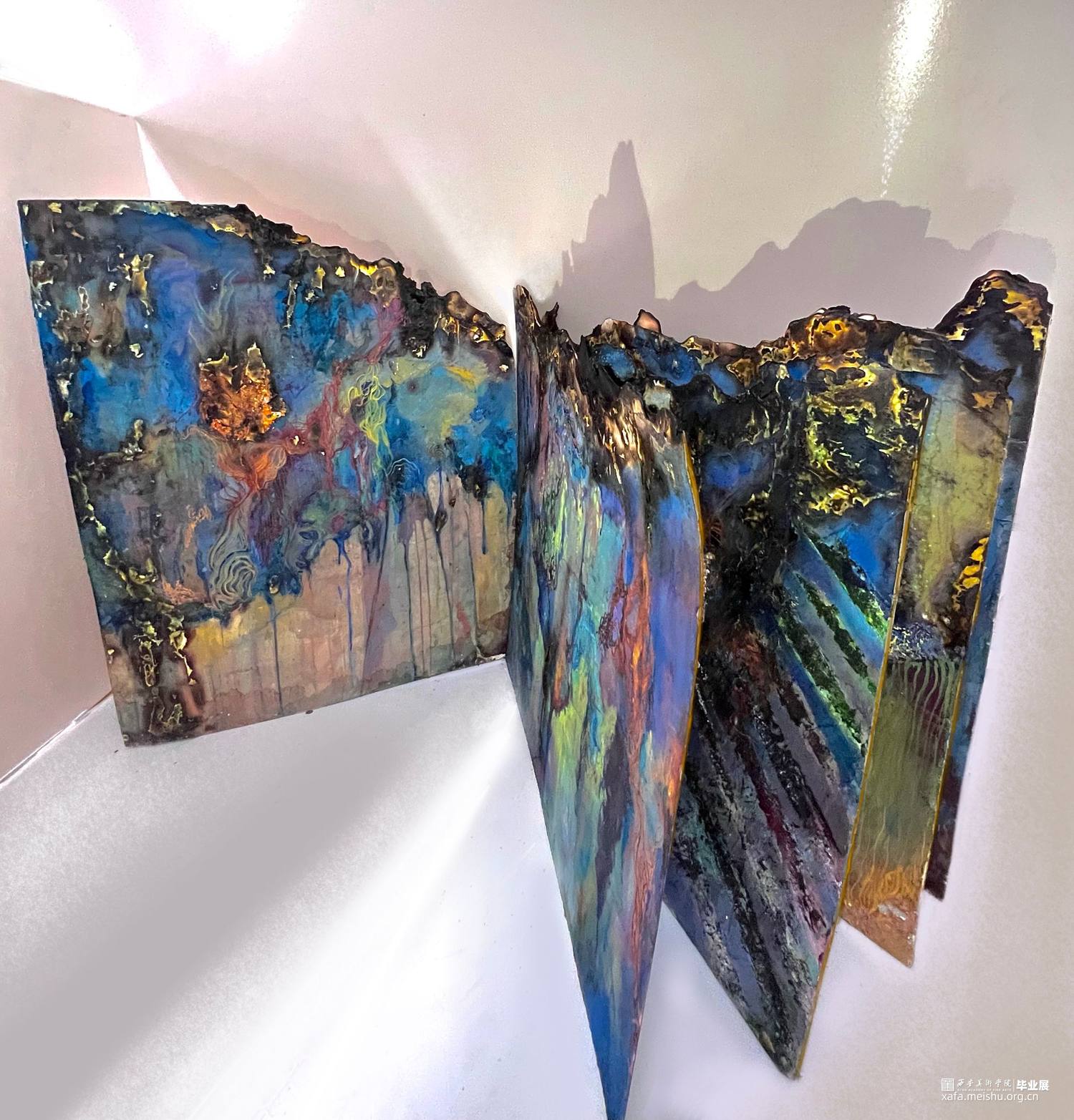 焦石宣琦:“和我的partner使用不同的表现手法制作属于自己的书,展现出我们各自对于痕这一主题的理解,最终再将两本书进行连接,互相关联。在我的这一部分中,用自己的语言符号表达过去的、当下的心情与情绪的波动,那些抽象的色彩与形状是记忆中深刻回忆的隐秘表达。或平淡、或喜悦、或忧郁、或愤怒、或激烈热情似火,每一面不同的我都是真实的我,最终组成了一个完整的立体的我。在从小到大的历程中,有一些性格特质慢慢被放大,一些渐渐被磨平,这件作品也是对自己的一个记录。记忆会逐渐变得模糊直至淡忘,但漫长的时光中留下的那些痕迹证明曾经存在过,也仍在潜移默化的塑造着我。转首回望,那些留下的才愈发显得弥足珍贵。“