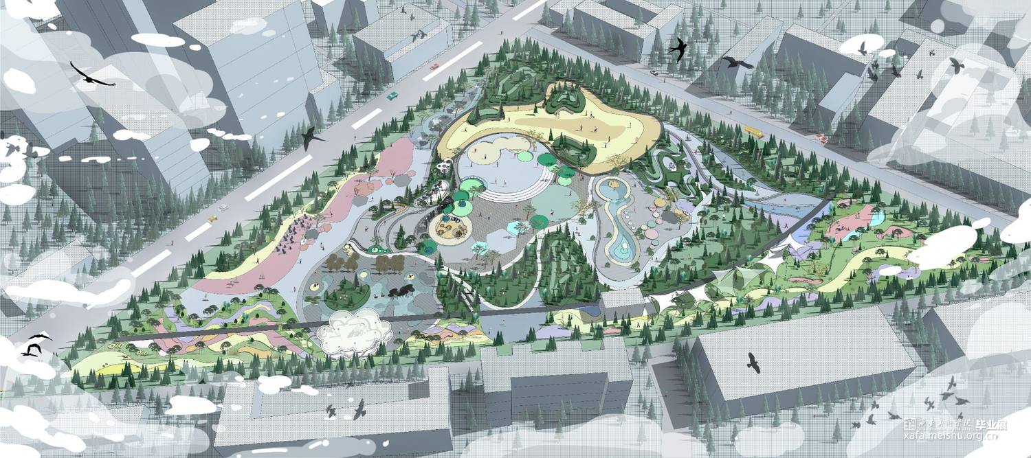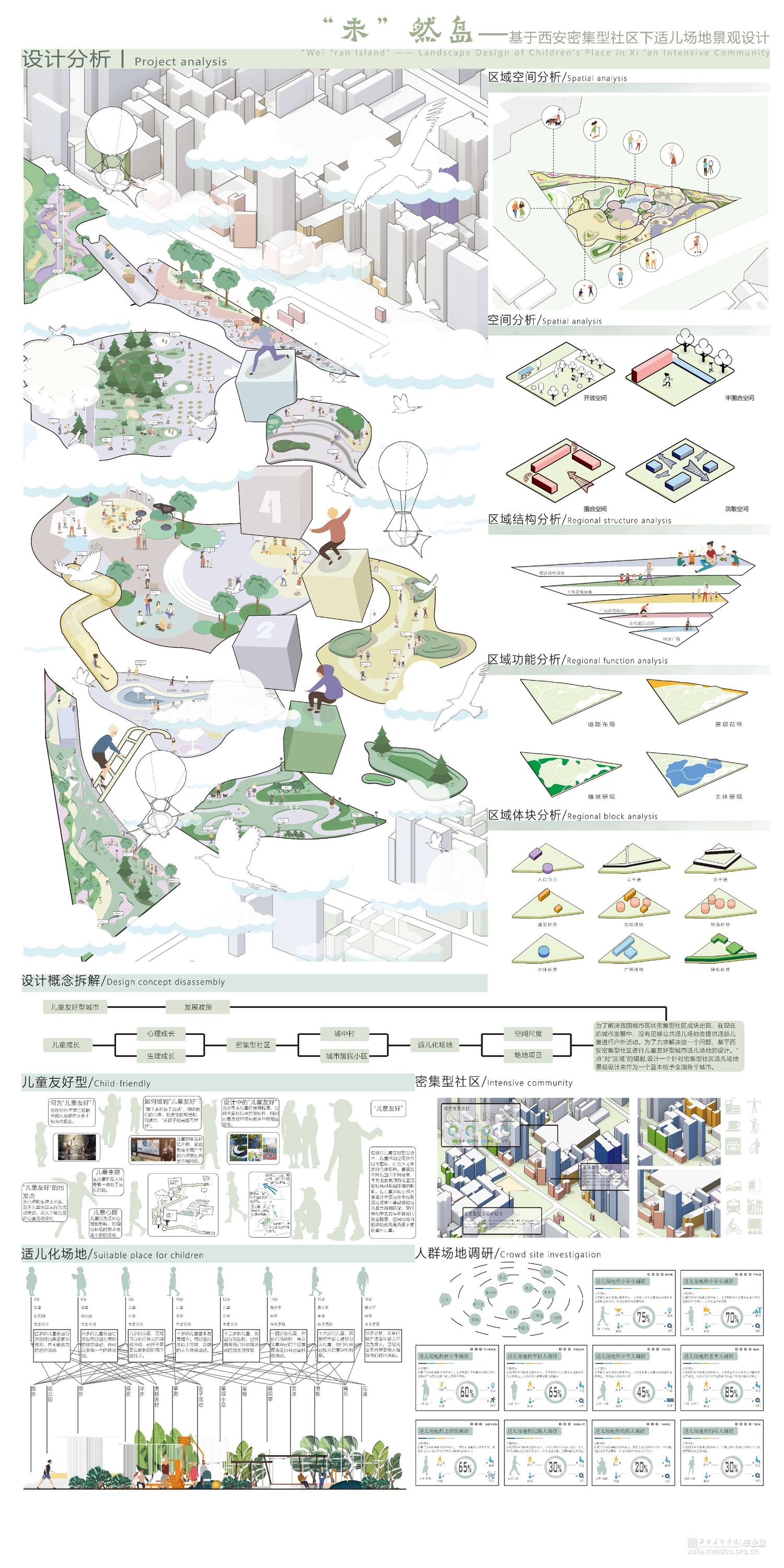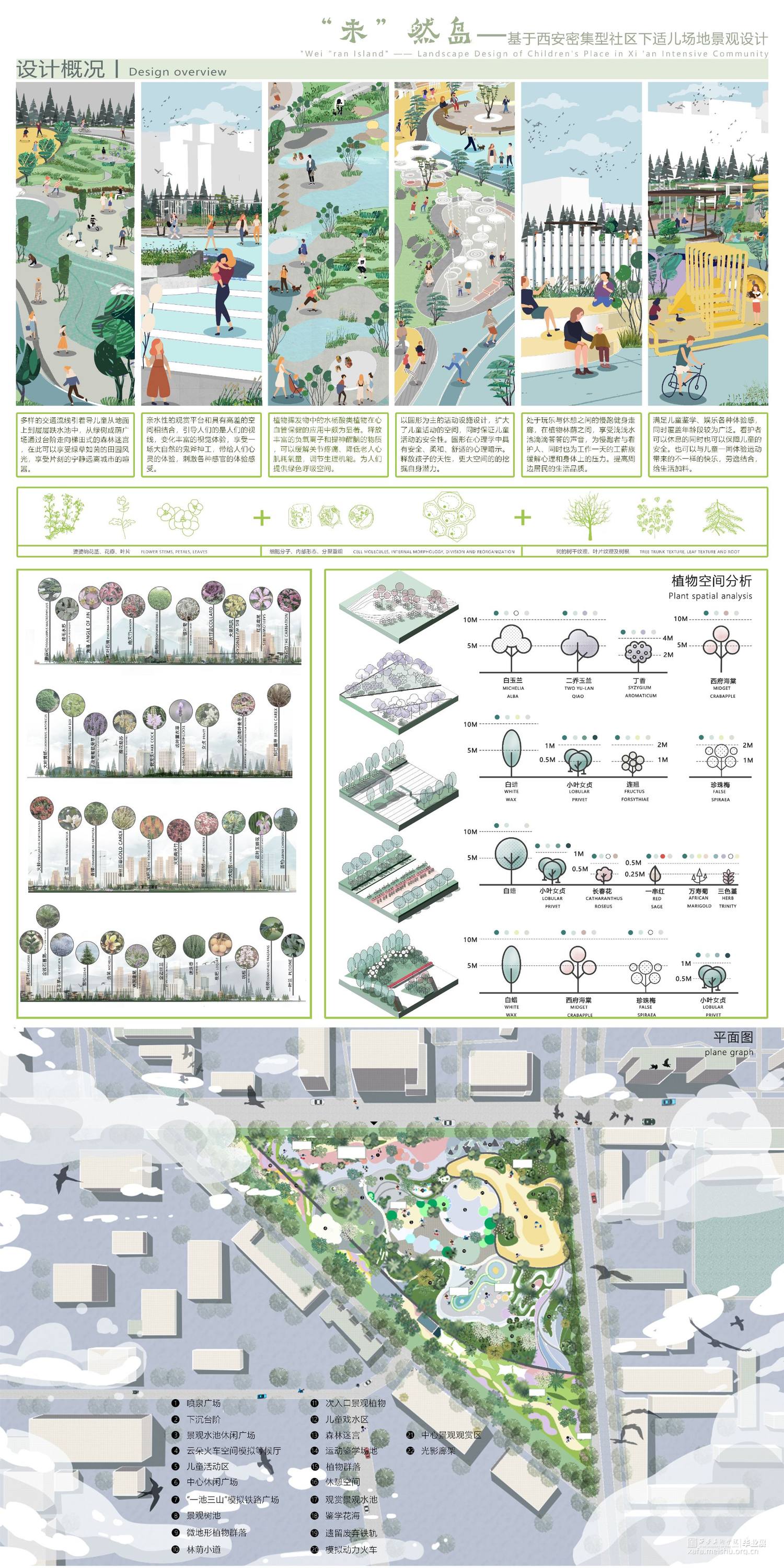 该场地位于西安市大寨路以北,丈八路以西。随着西安高新区的迅速发展,鱼化工业园的发展更为神速,位于西安市主城区边缘,东邻西三环,西连绕城高速,北至昆明路,南至科技西路,园区区位明显,交通使捷,充满无限商机,对儿童的成长环境与发展关注更为密切。设计理念以婆婆纳花茎、花瓣、叶片为元素,同时结合细胞分子、内部形态、 分裂重组等生命体特征表达一种生长、 向上的力量,还结合了树的树干纹理、叶片纹理及树根的绿色生机的元素设计适儿场地景观设计,满足儿童成长、活动、学习等综合发展同时优化该片区的生活品质,改善城市环境,为周边居民提供更优质的生活。同时在当代中国,以经济为驱动的儿童业态已经呈现快速发展的势头,但对城市和社区中儿童活动空间的重视程度还远远不够。大到儿童友好的城市生态与公共卫生安全,小到儿童场所中可供嬉戏的沙石, 都需要我们精心呵护。密集型社区是城市的有机组成部分,是城市活力的源泉。孩子是社区活力的源头,只有对“儿童友好”, 为他们创造合适的活动空间,才能更好的激发社区,乃至城市的活力,最后“末”然岛是儿童蓬勃发展的一个新空间、新未来。