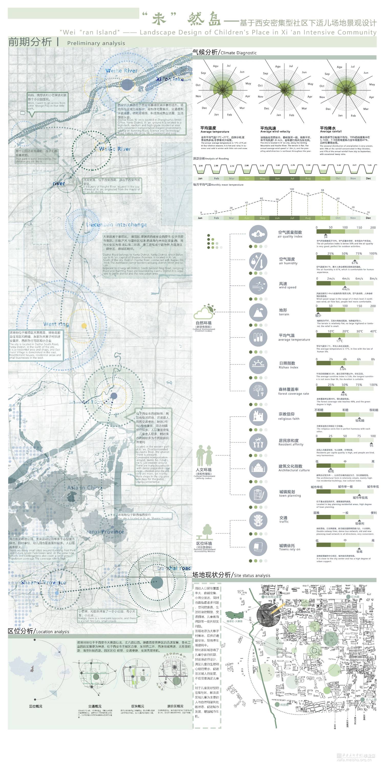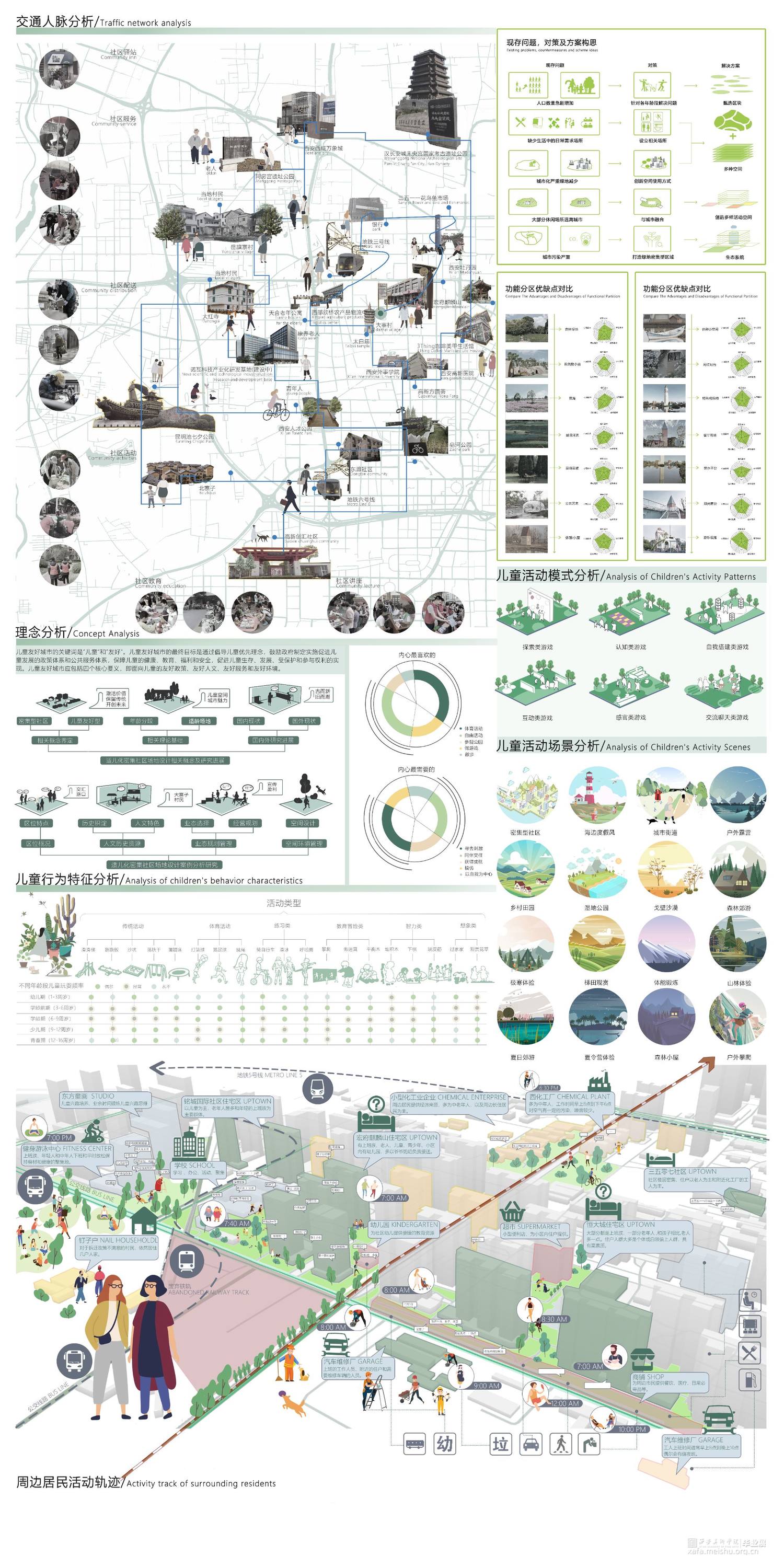 “最好的城市应该是最受孩子们喜爱的城市。儿童友好城市作为城市化发展的趋势之一,在 全世界快速推进的城市化进程中,儿童作为人类的未来却常常被忽略。社区作为儿童友好城市建设的基本单元,也是儿童日常生活的主要领域,却没有发挥应有的作用。针对该问题,我们选择了西安市大寨路以北,文八路以西,该场地社区密集,不同年龄段儿童人数较多。小组以适儿场地设计为主线,以改善儿童成长生活的主要目的,同时满足当地居民、老人、上班族等 不同人群的需求,提高该片区人们的生活质量,勾勒出儿童未来发展的蓝图。