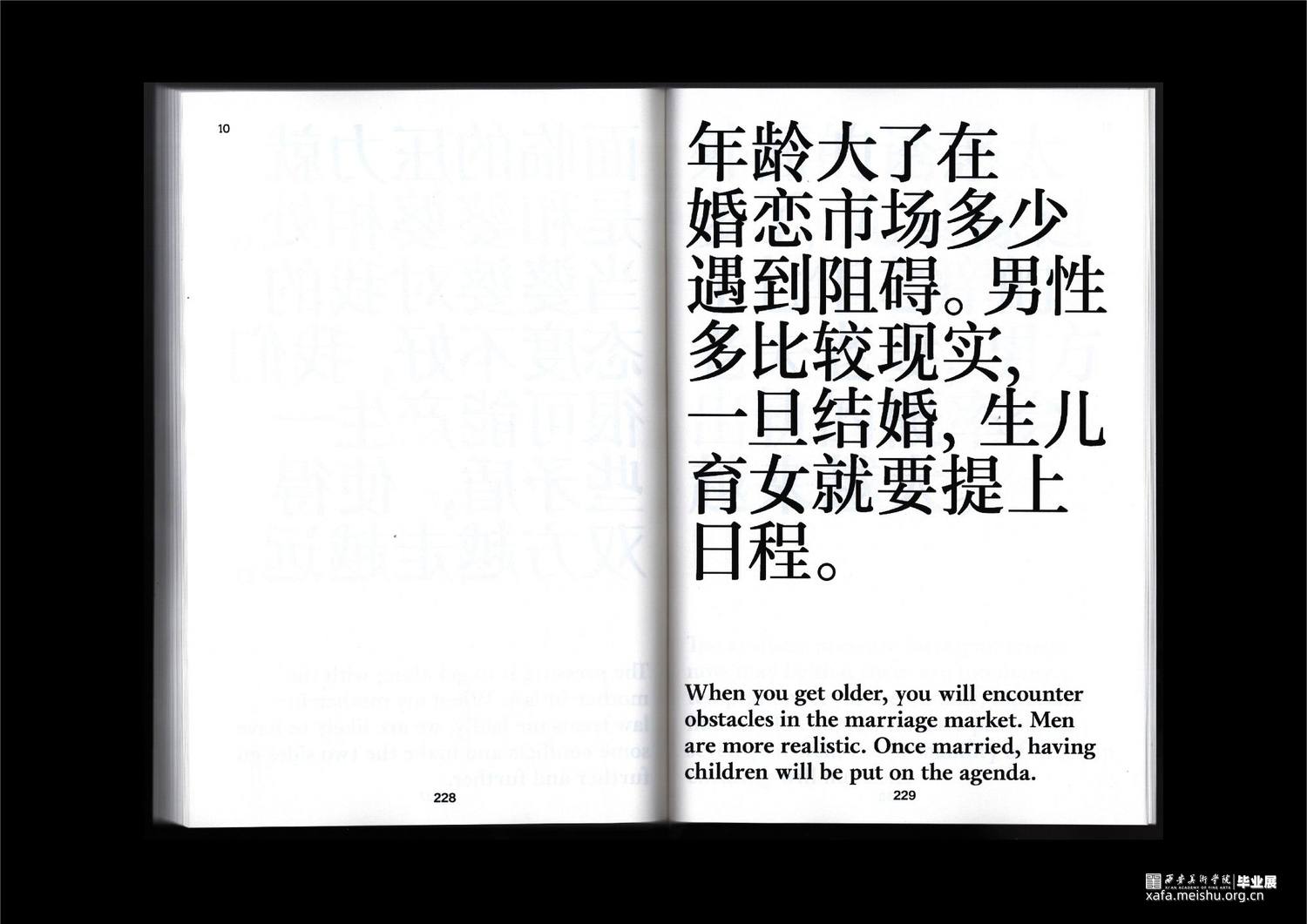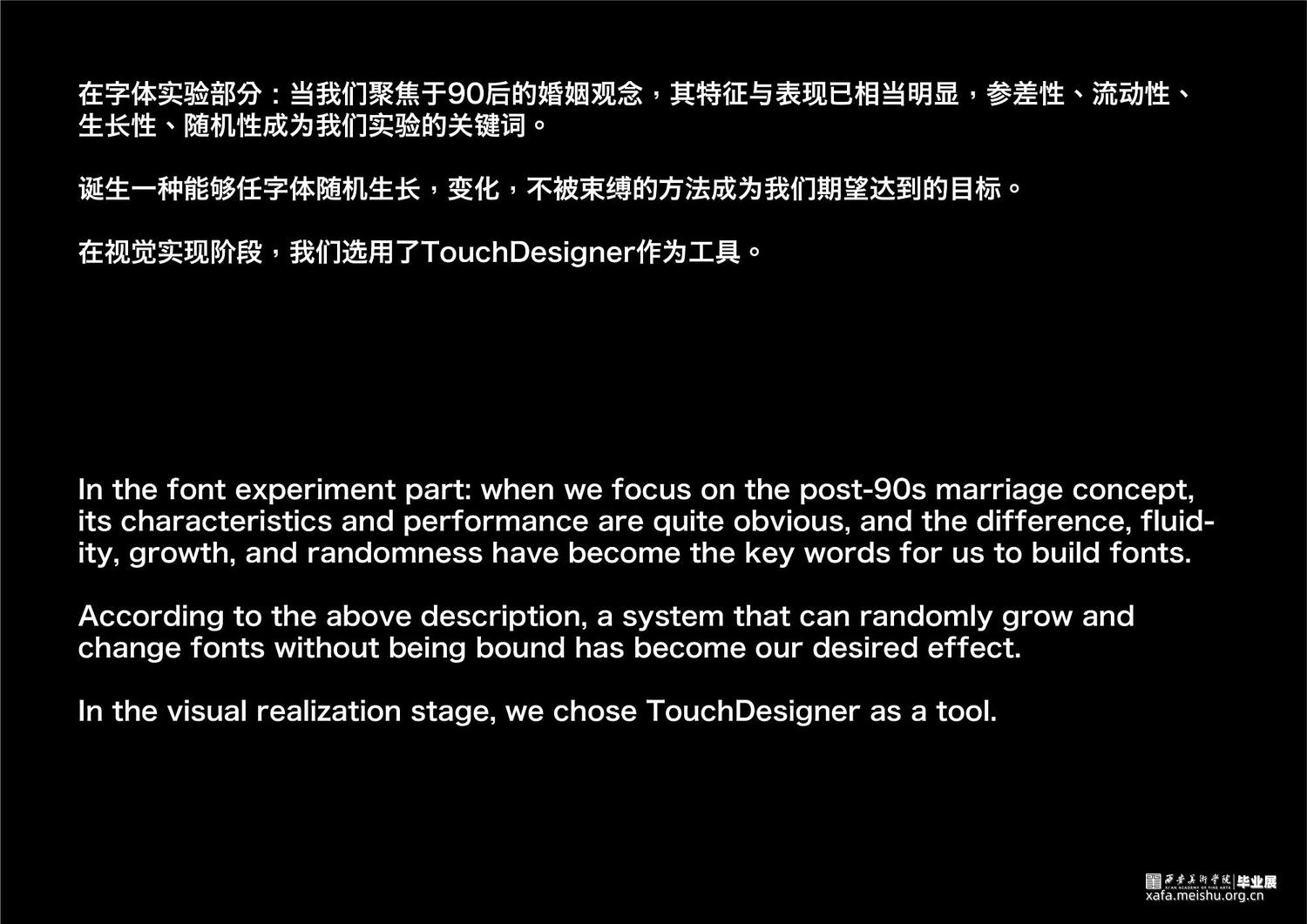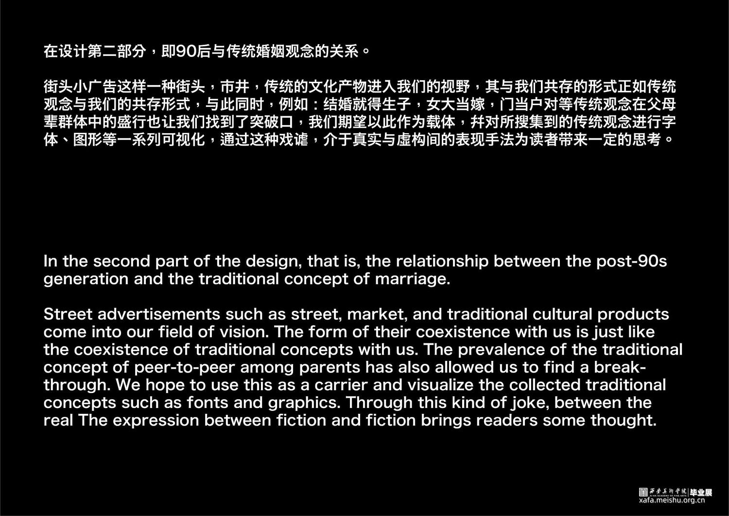 项目通过传统平面设计、数字媒体以及编程交互三个领域下的书籍、字体实验、动态海报、编程交互、数字空间构成的综合场域表现,以温和、富有隐喻的视觉形式,化解消极情绪。希望以设计之力,引发大众的对于婚育问题的重新思考。