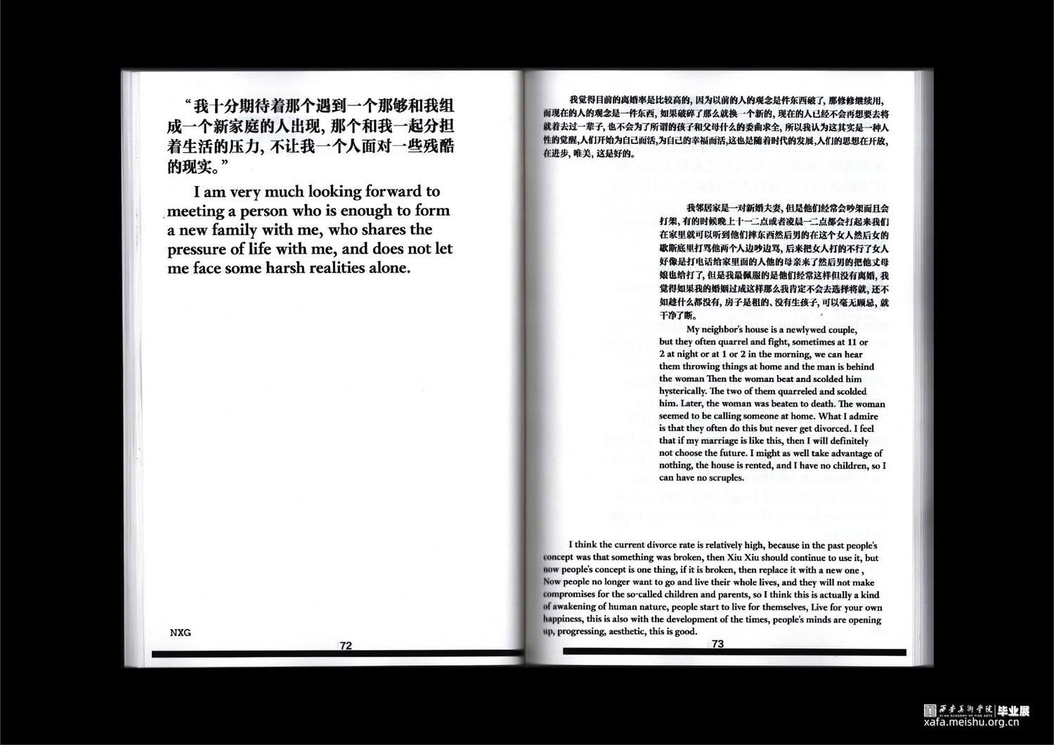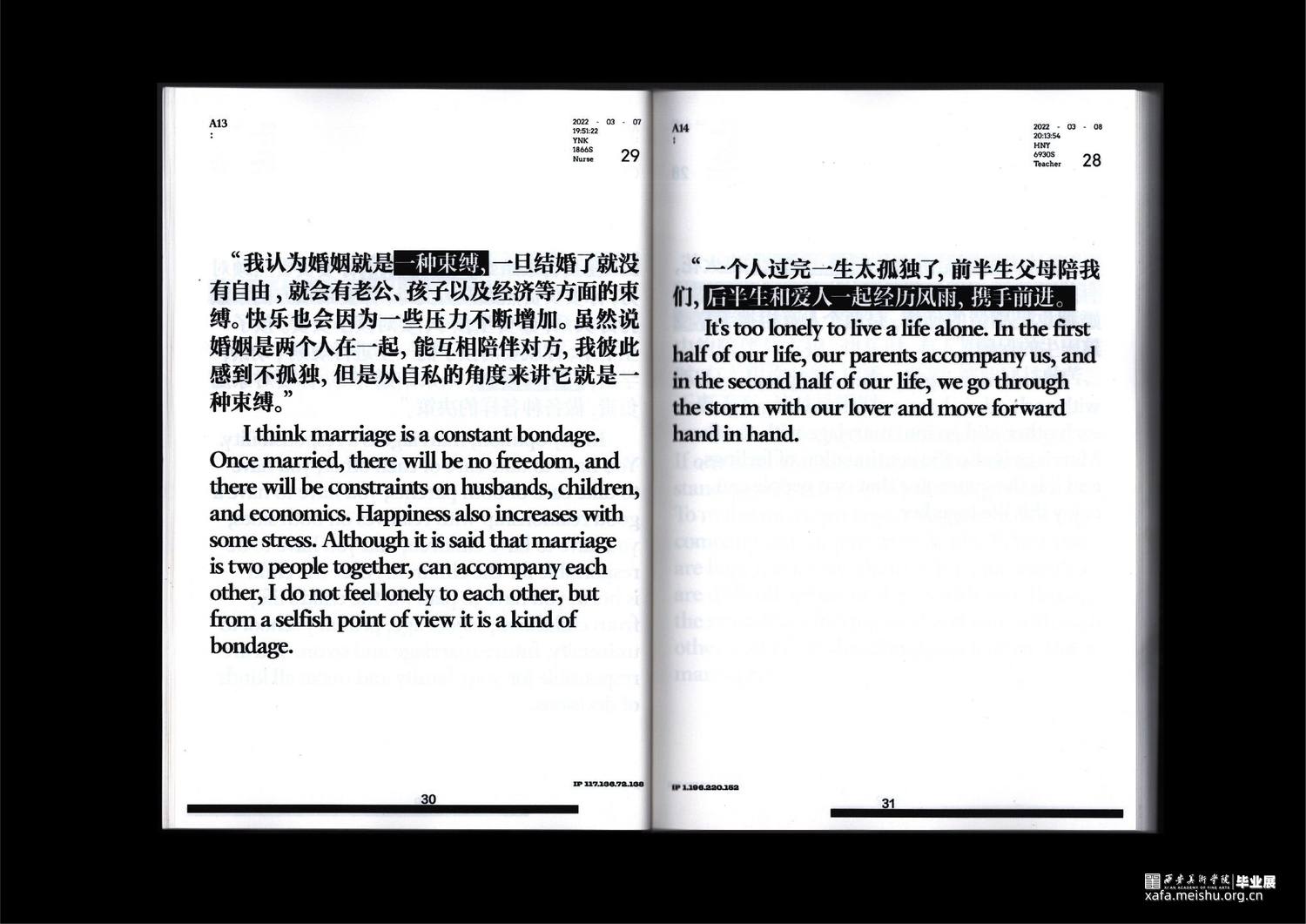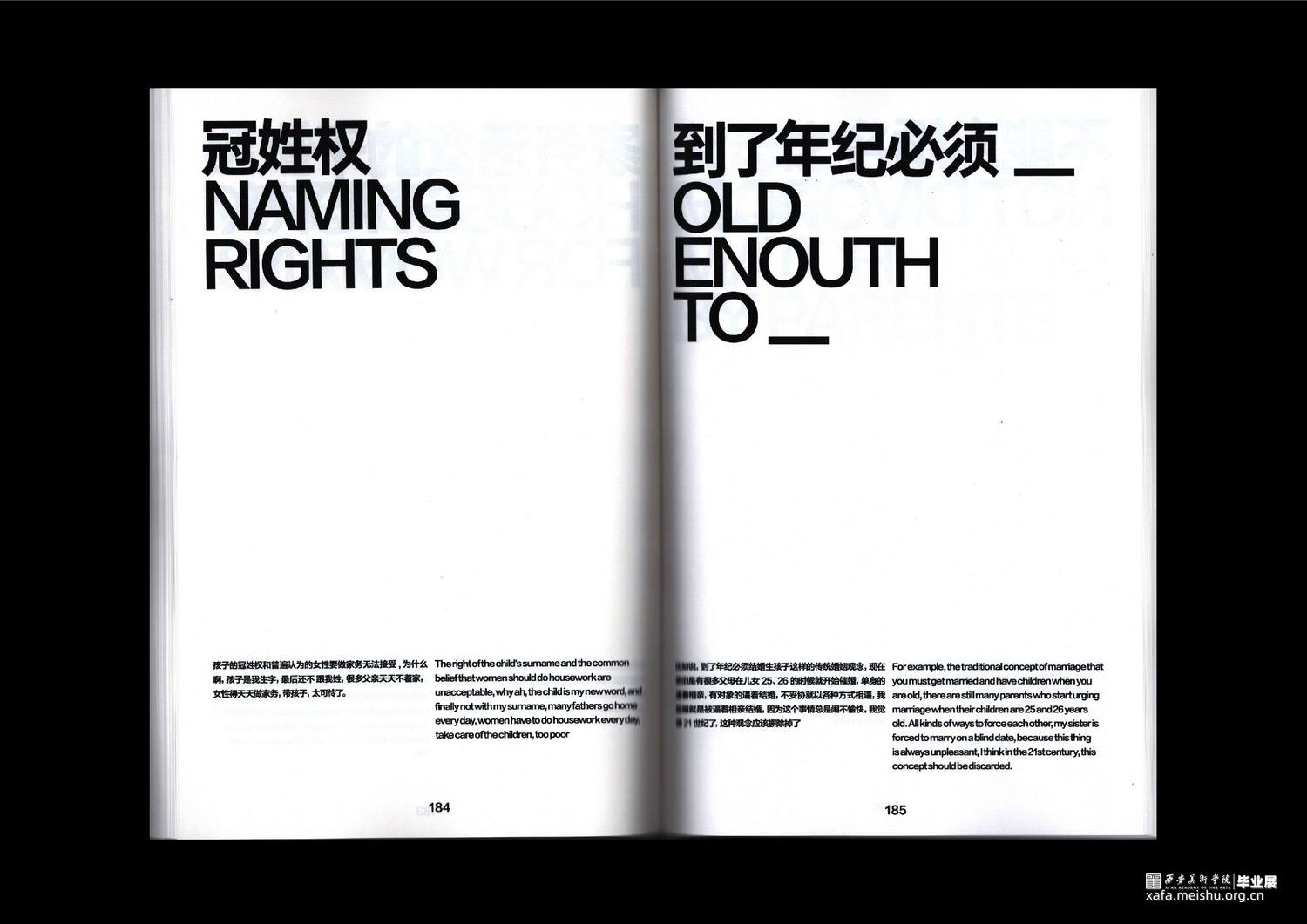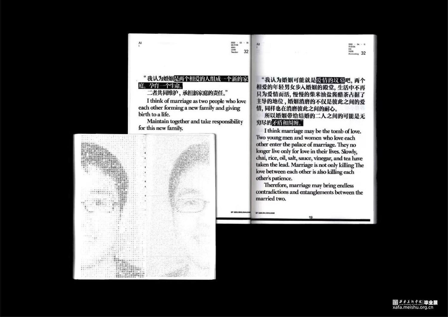 项目通过传统平面设计、数字媒体以及编程交互三个领域下的书籍、字体实验、动态海报、编程交互、数字空间构成的综合场域表现,以温和、富有隐喻的视觉形式,化解消极情绪。希望以设计之力,引发大众的对于婚育问题的重新思考。