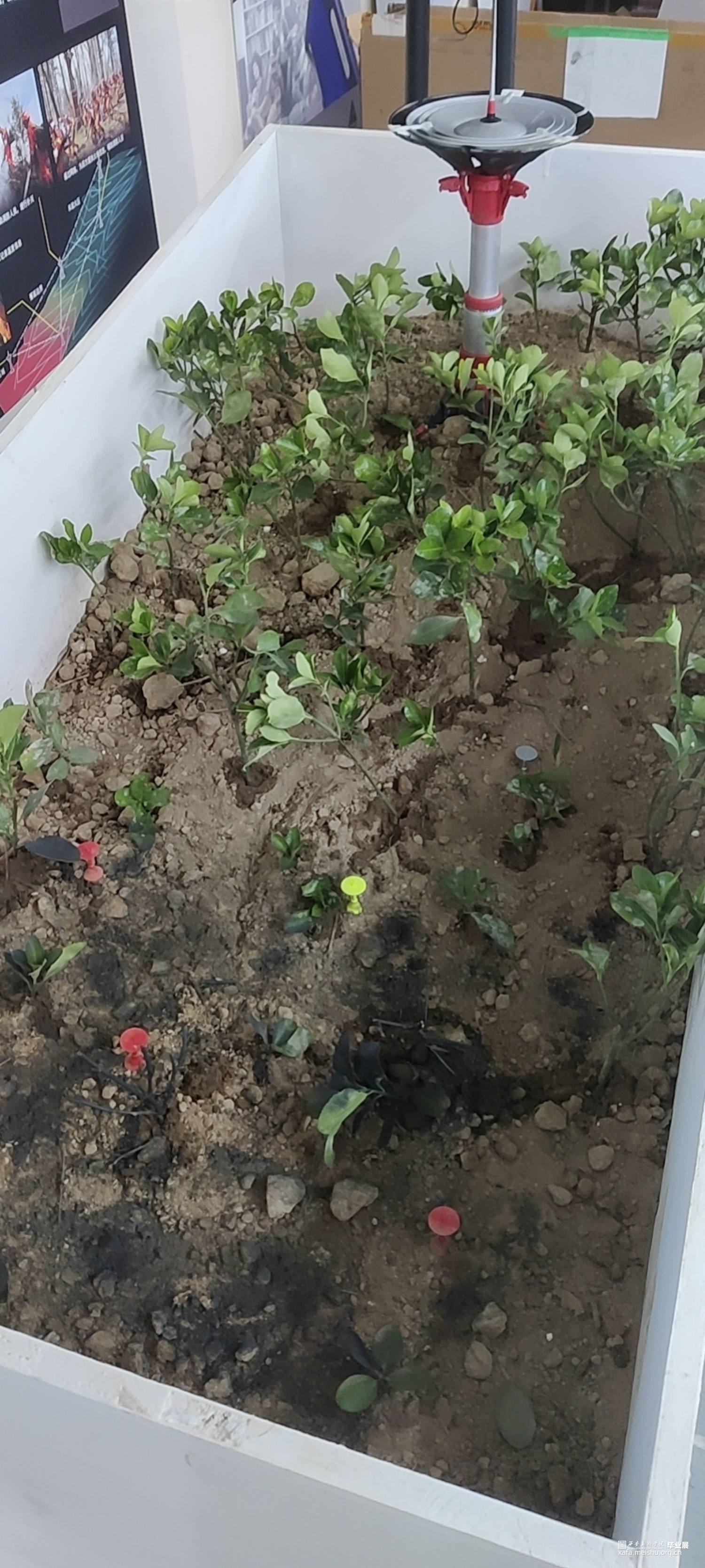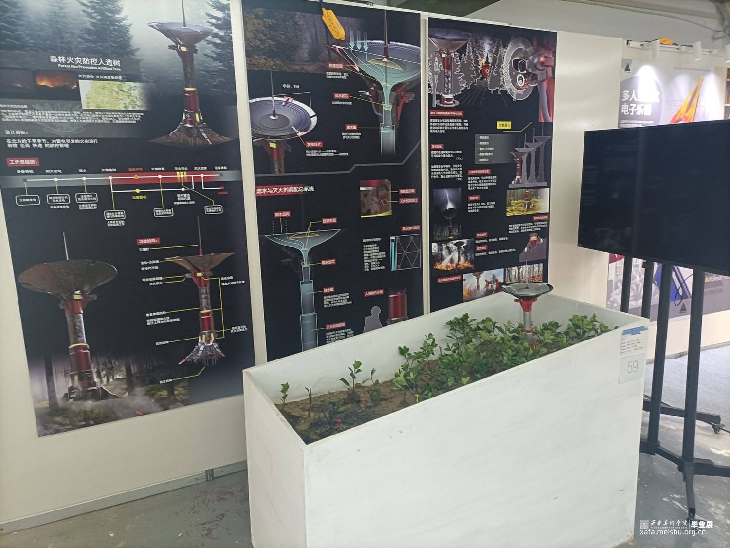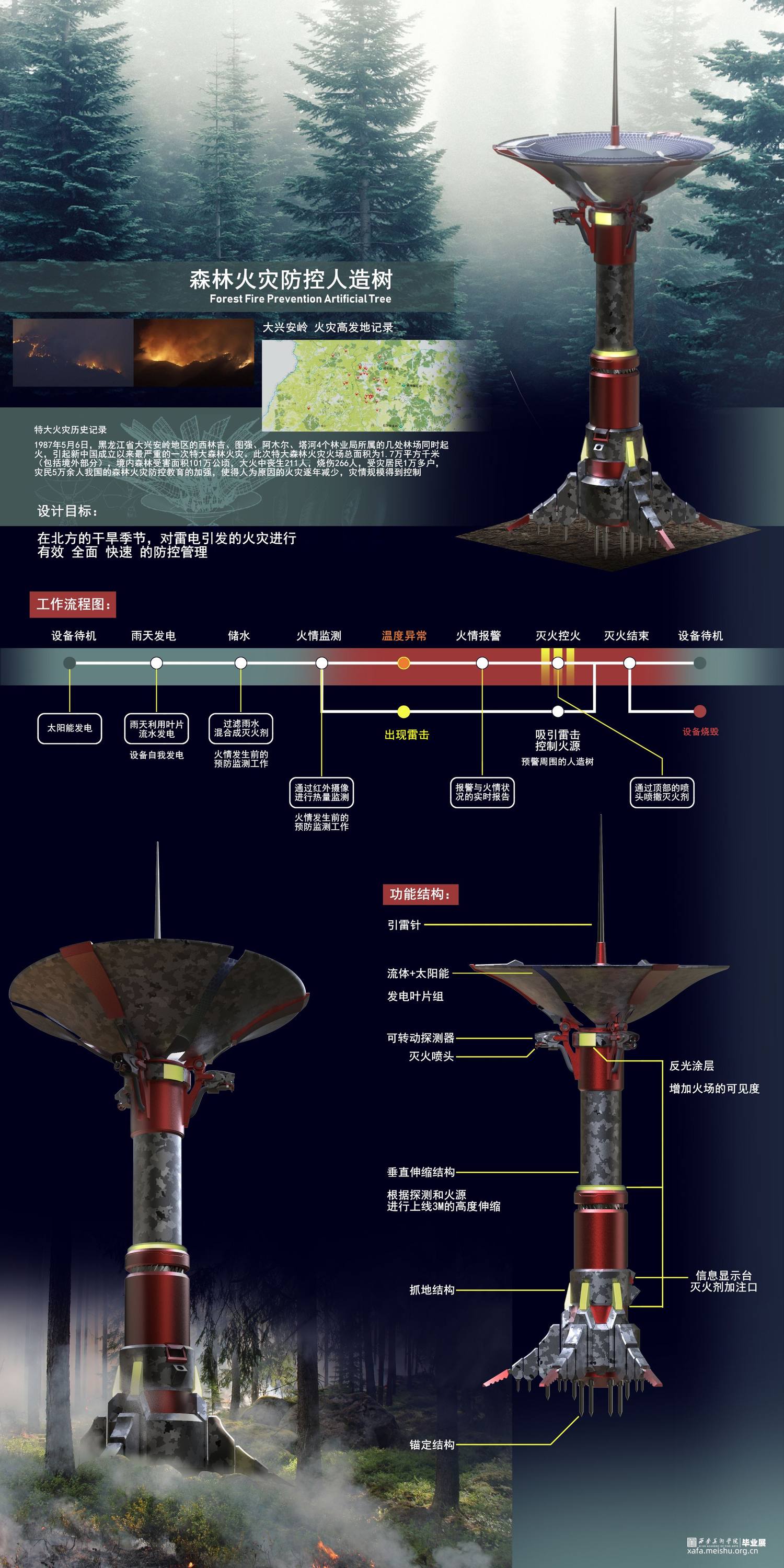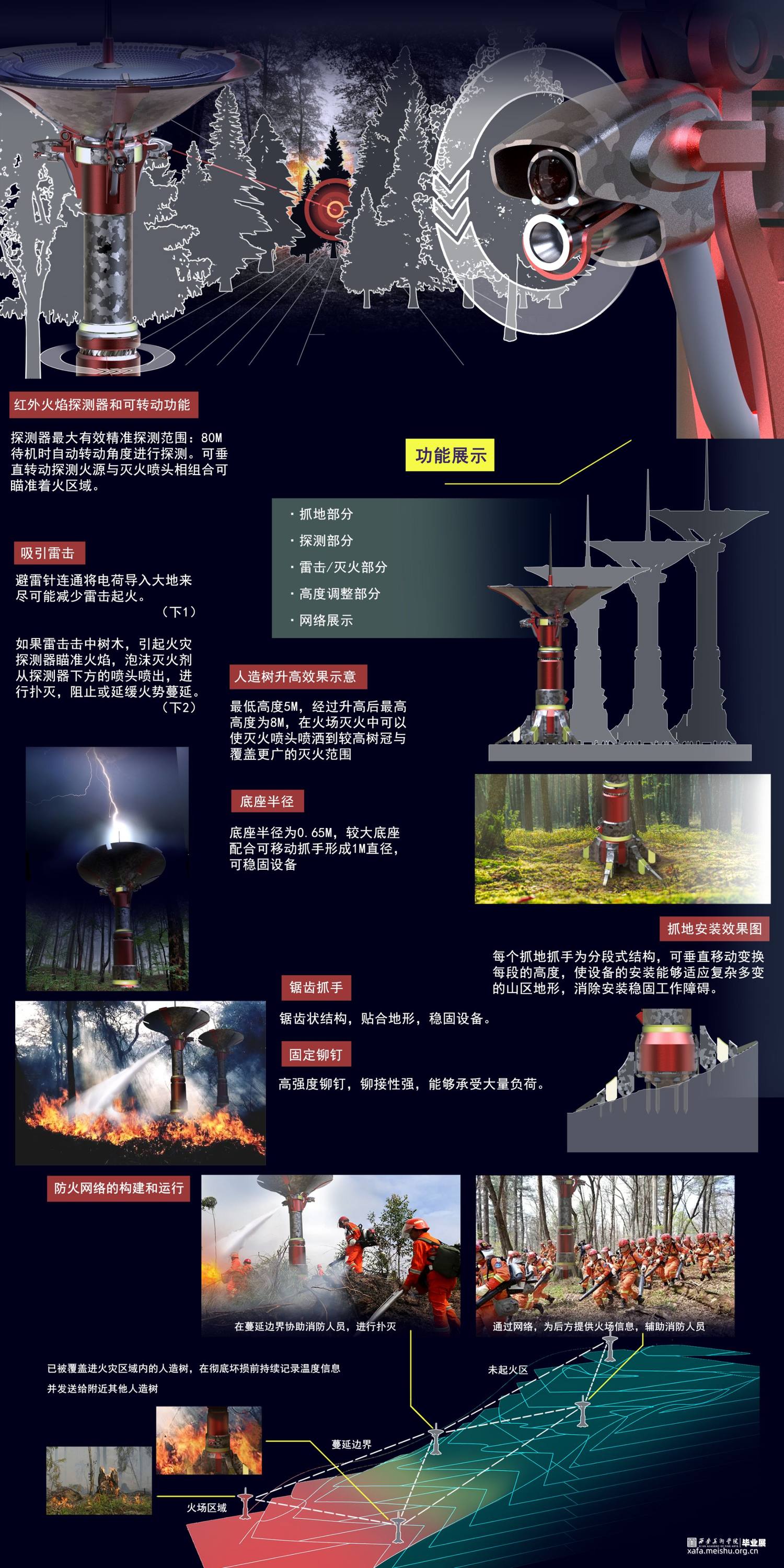 森林火灾防控人造树,装备有引雷针,发电叶片组,可转动火焰探测器,灭火喷头。中部主干部分有垂直伸缩结构,和信息显示台,底部为抓地固定结构