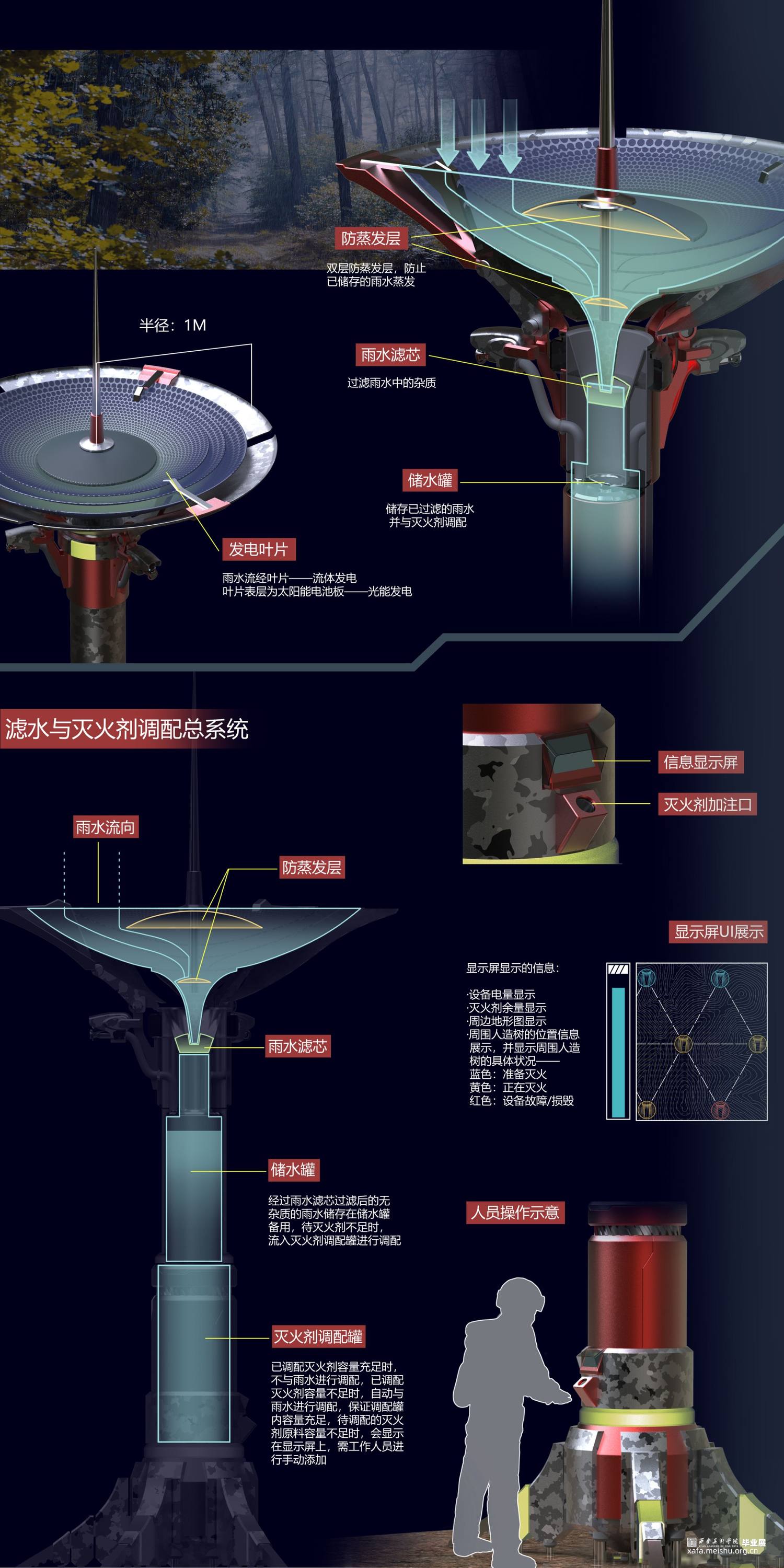 可以做到通过太阳能和流体发电,在野外维持监测功能的运行。通过收集的过滤好的雨水,与内部的泡沫灭火剂原料混合,制成灭火剂并储存。信息显示台上会展示附近其他人造树的位置和火情信息。引雷针可以吸引雷击,直接减少雷击火源。反光图层在夜间或烟雾浓重火势凶猛的火场增加可见性。底部的抓地结构可以适应并贴合复杂的森林地形,在斜坡上也可以保持稳定。