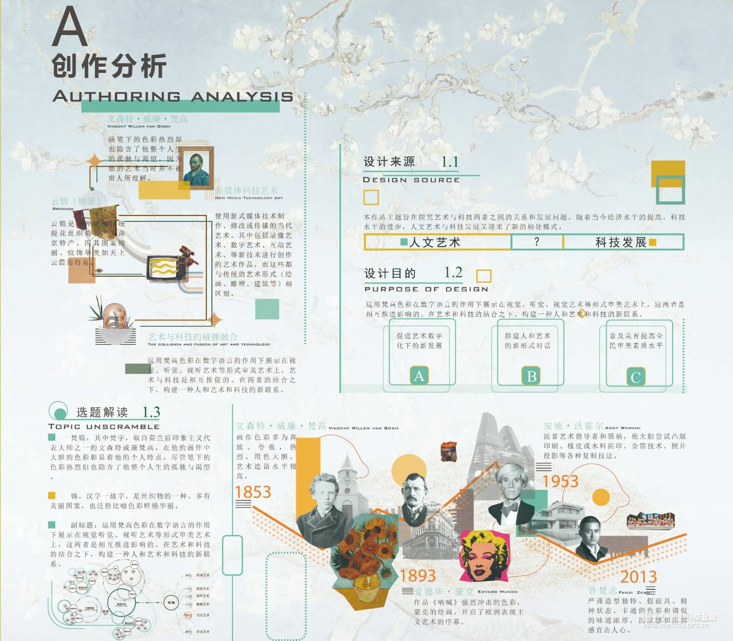 在这次设计中我们受到后印象大师文森特·威廉·梵高终其一生对色彩的追逐精神的影响。它画作中对色的运用从前期的沉重暗淡,到后期的热烈灿烂,仿佛是在用欢快的颜色来鼓舞世人的精神,用色彩牵引着人的心灵。我国古来就有锦为丝织物的一种,其寓意色彩鲜艳华美。我们试想西方色彩艺术代表与中国代表性色彩文化在科技的作用下相遇时,又会绽放出哪般绚烂与感受?