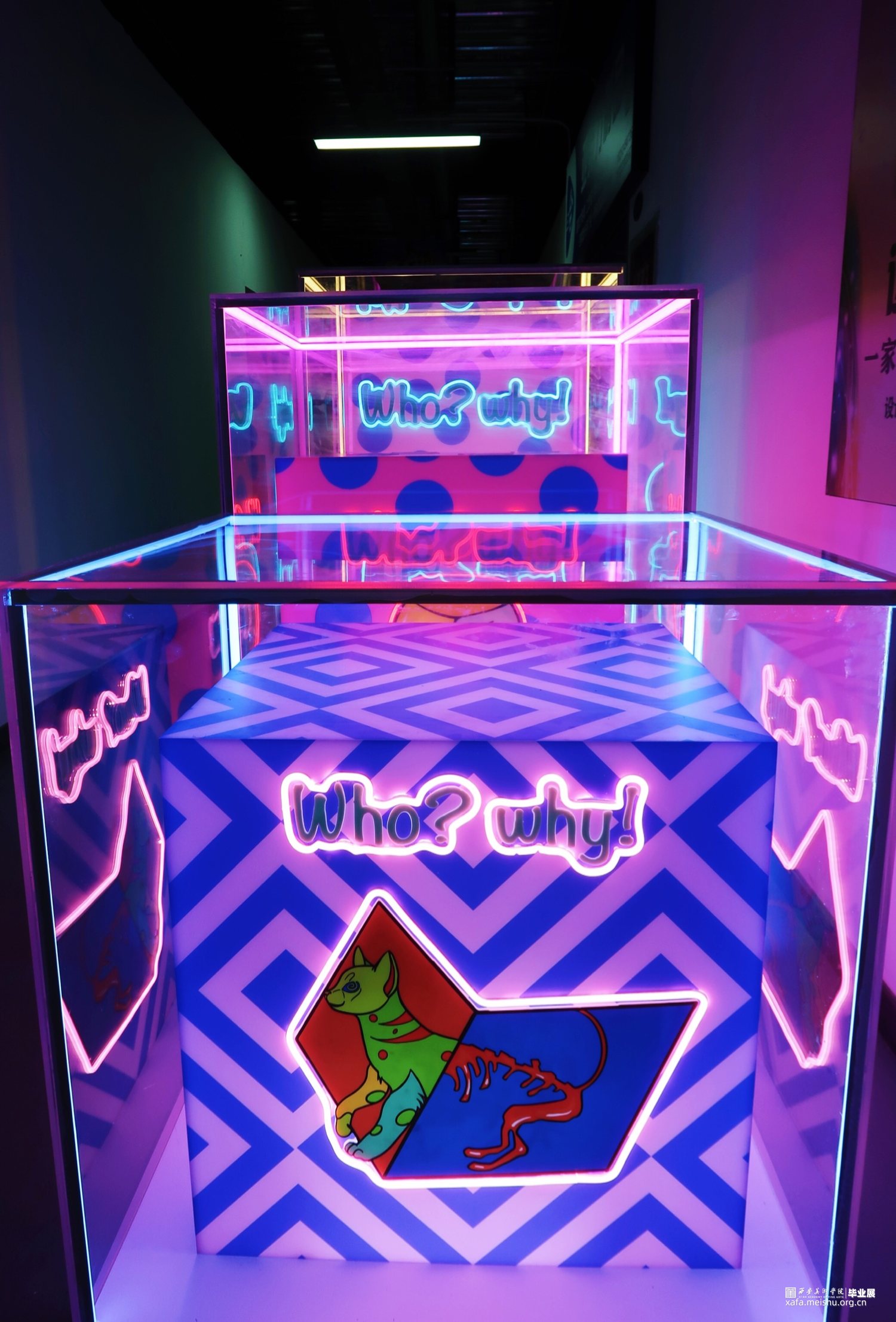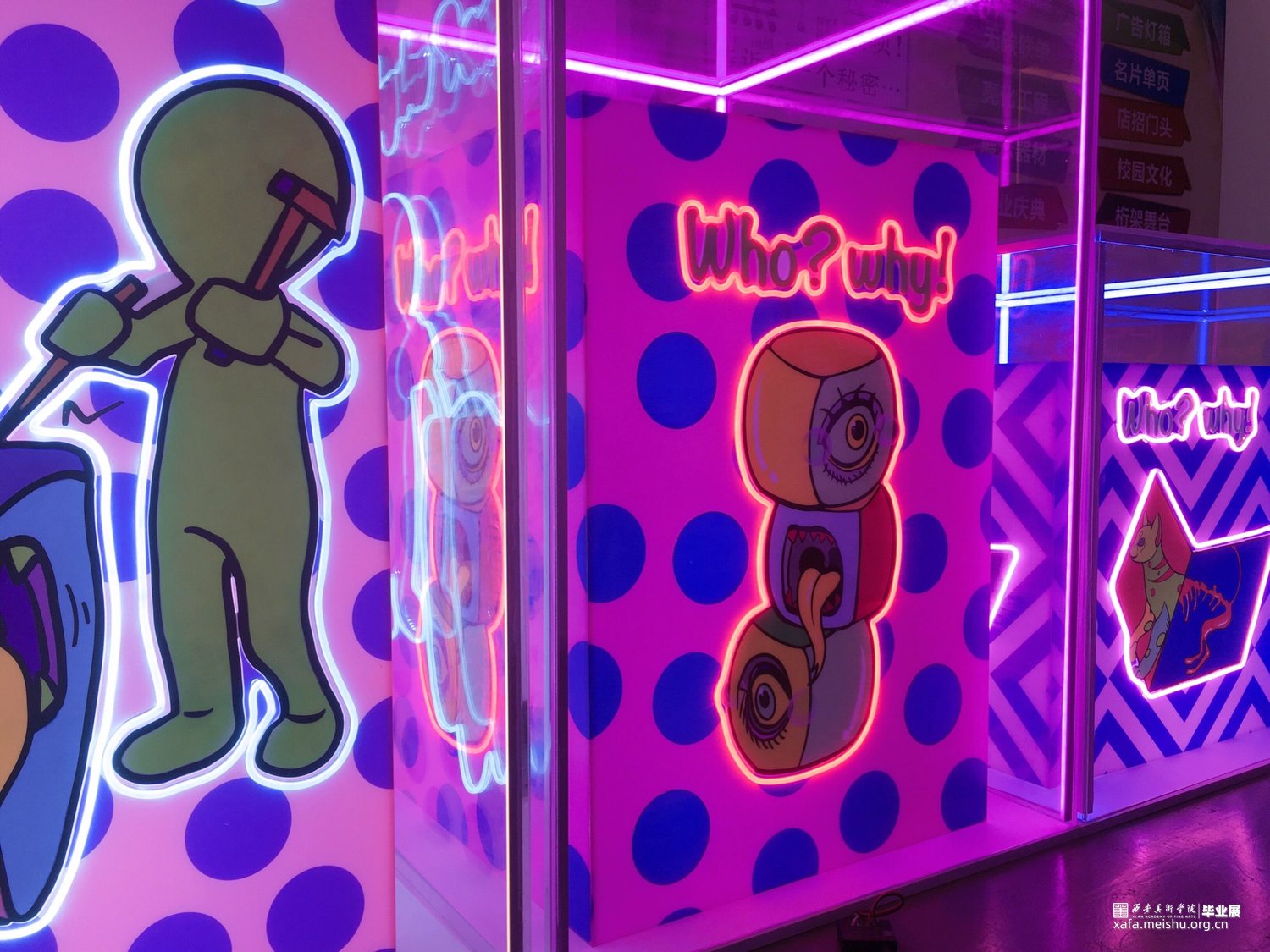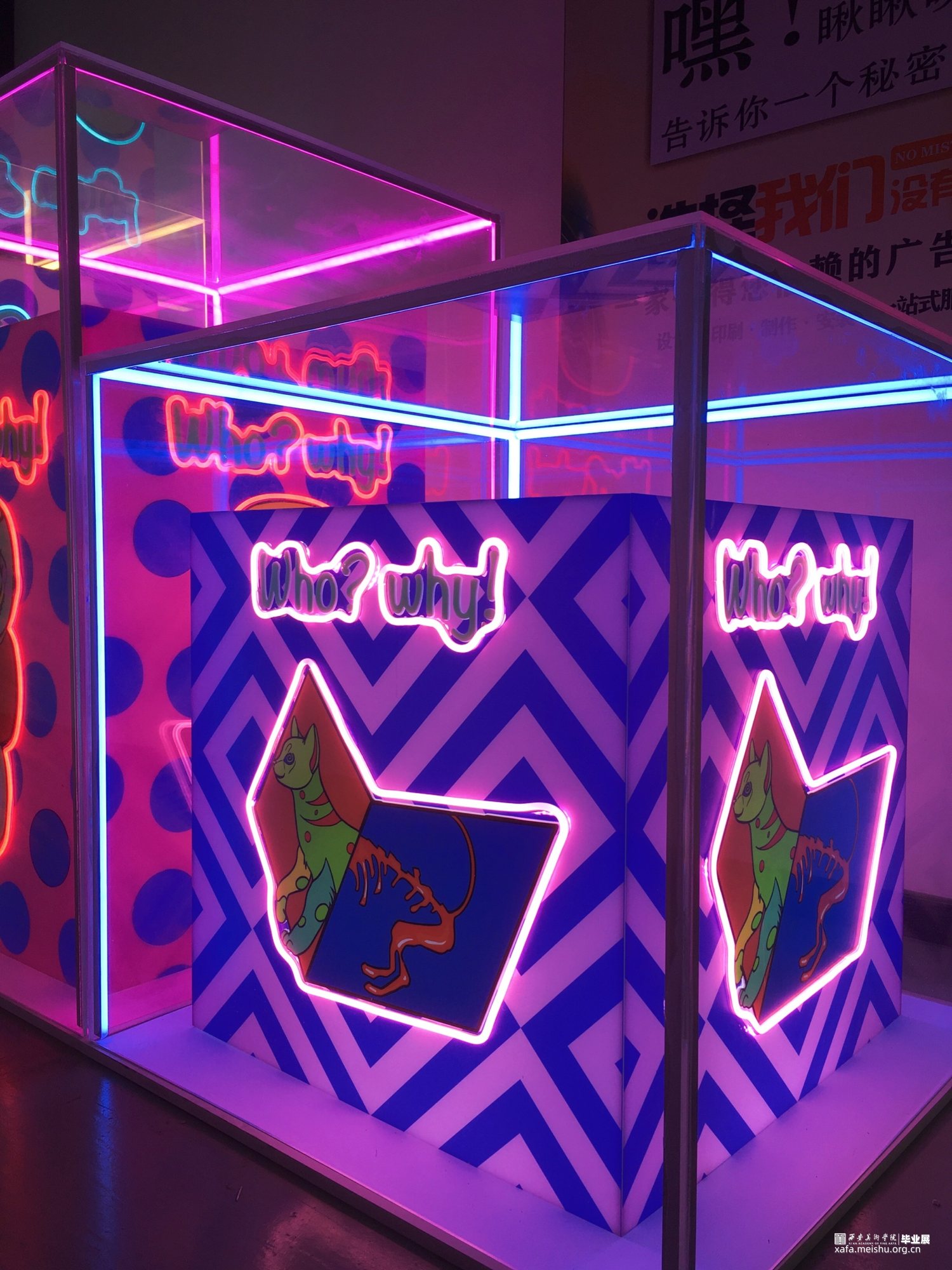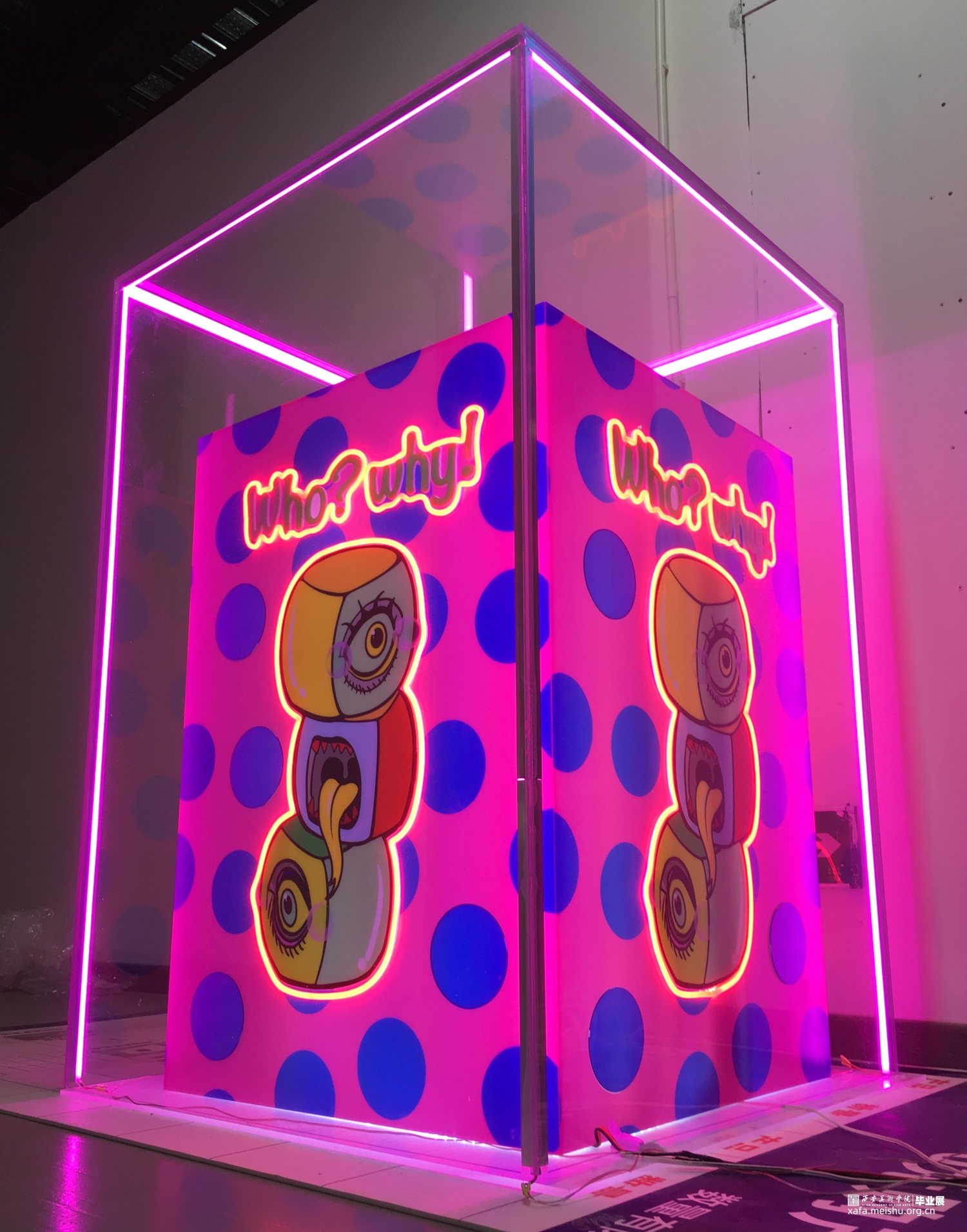 作品在材料方面采用亚克力与霓虹灯管的结合,将图案利用uv印刷工艺打印到白色亚克力板上轮廓用灯管围绕,在最外层用透明亚克力将整个作品笼罩在里面。