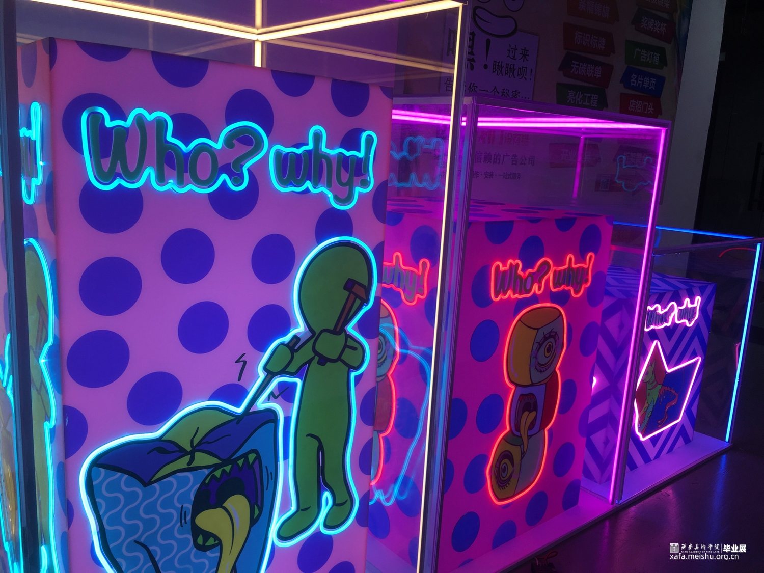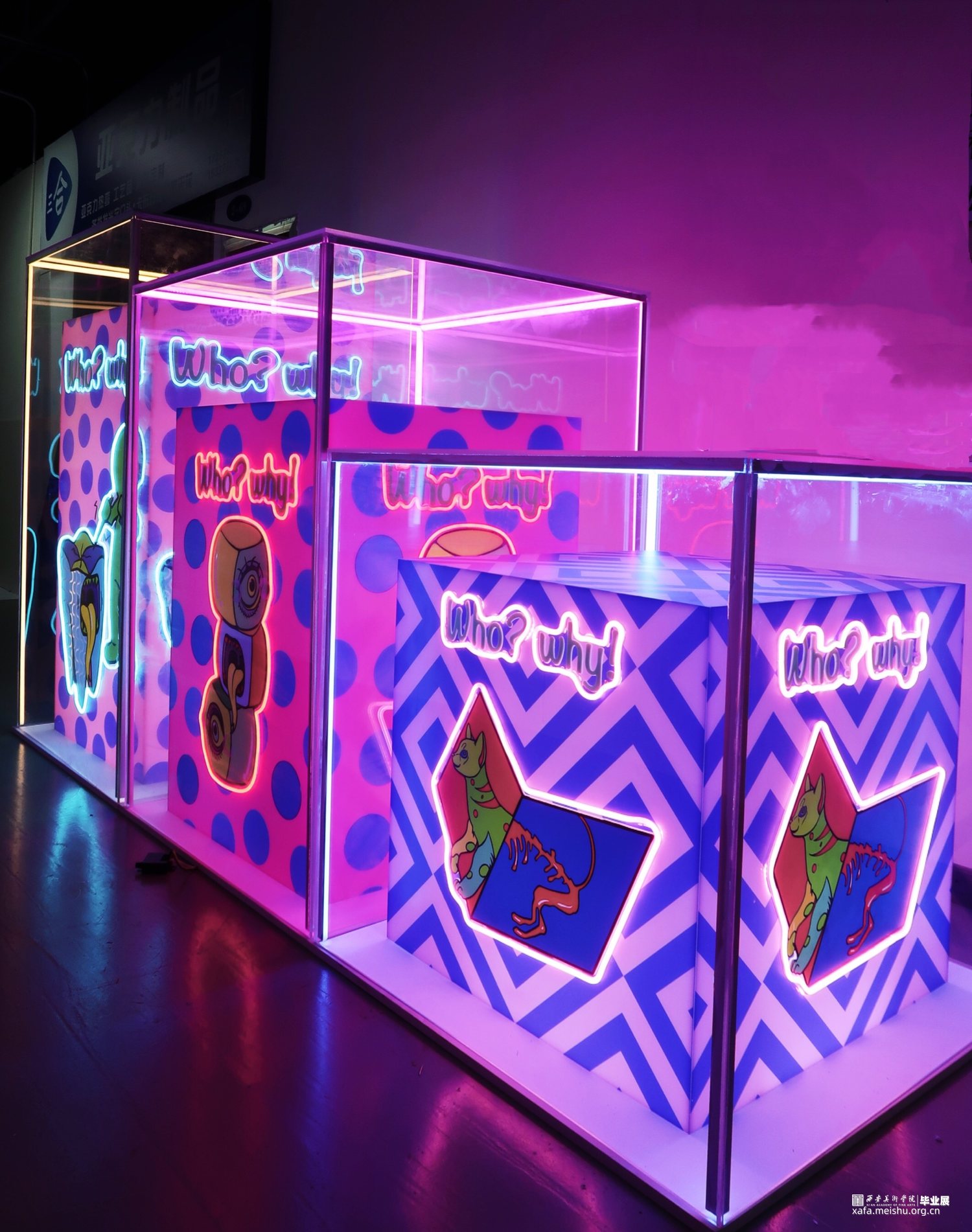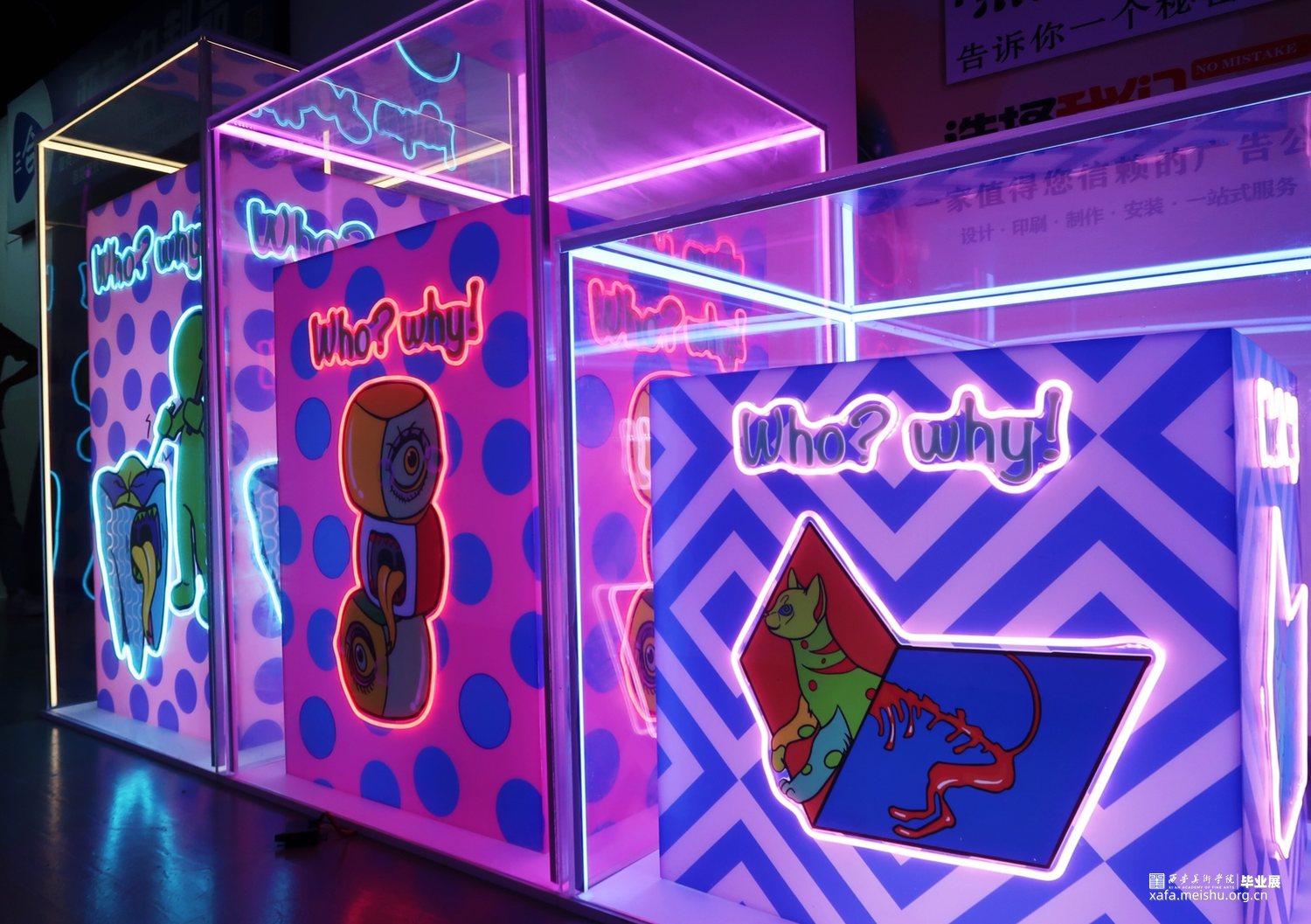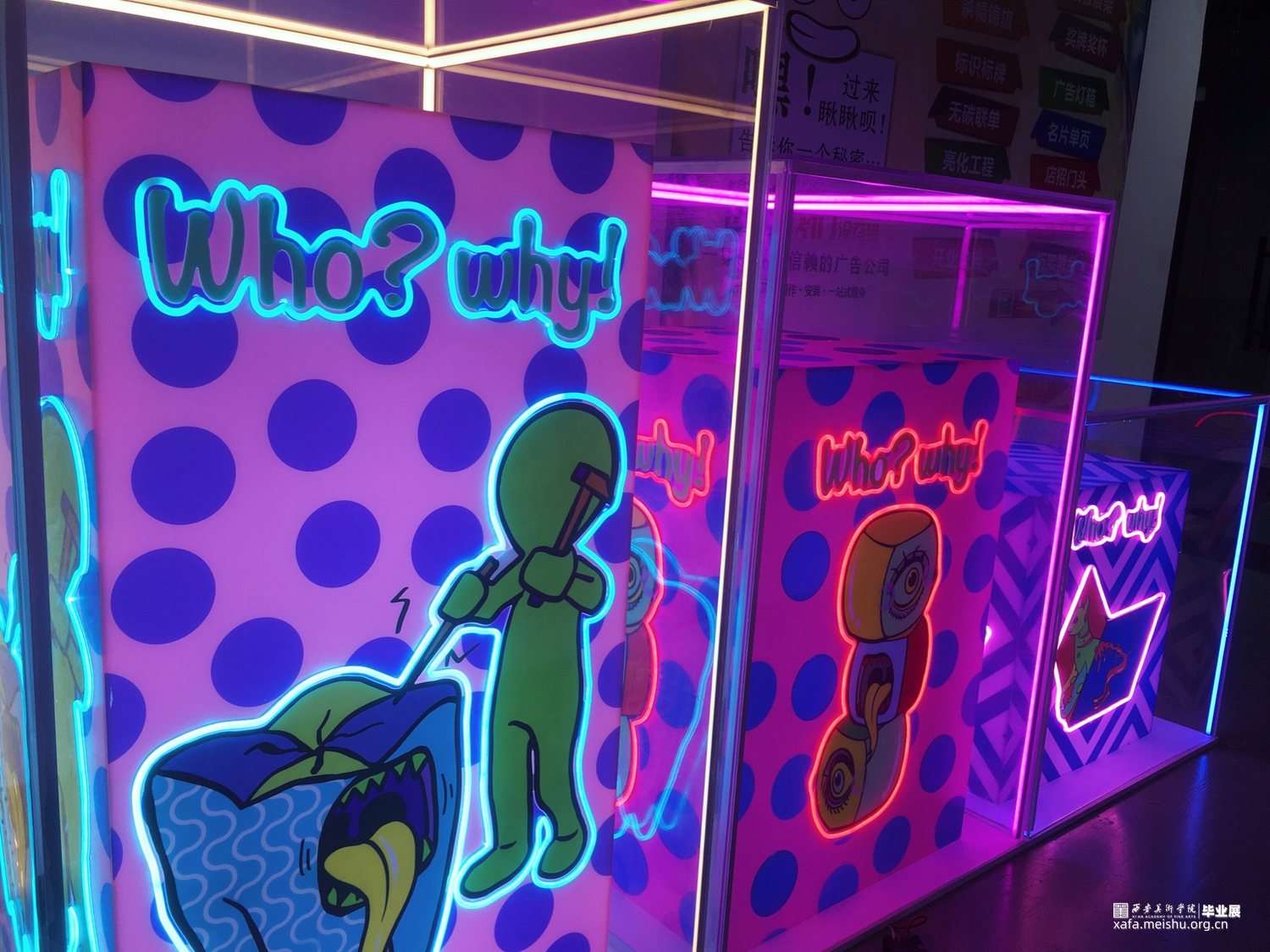 作品在材料方面采用亚克力与霓虹灯管的结合,将图案利用uv印刷工艺打印到白色亚克力板上轮廓用灯管围绕,在最外层用透明亚克力将整个作品笼罩在里面。