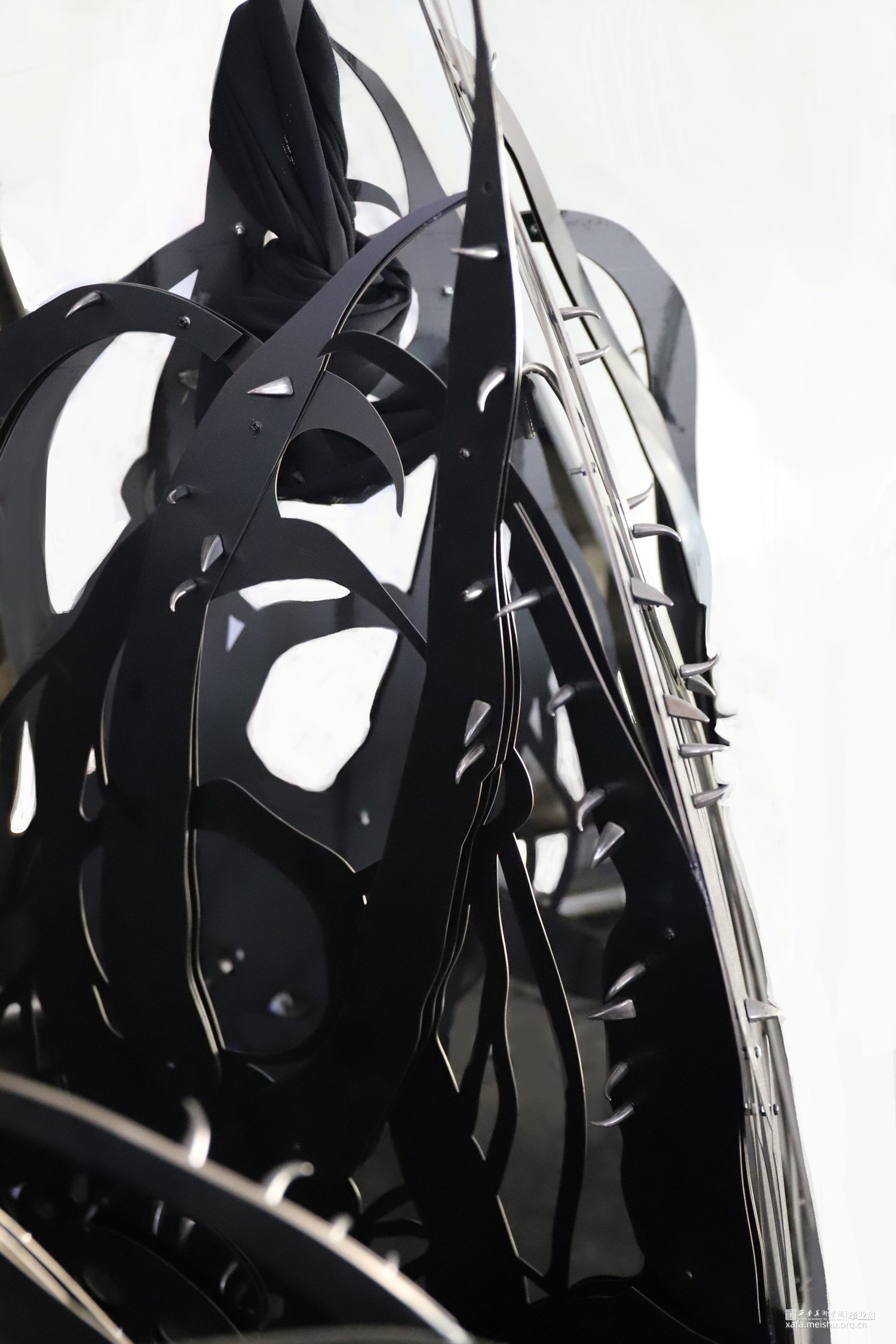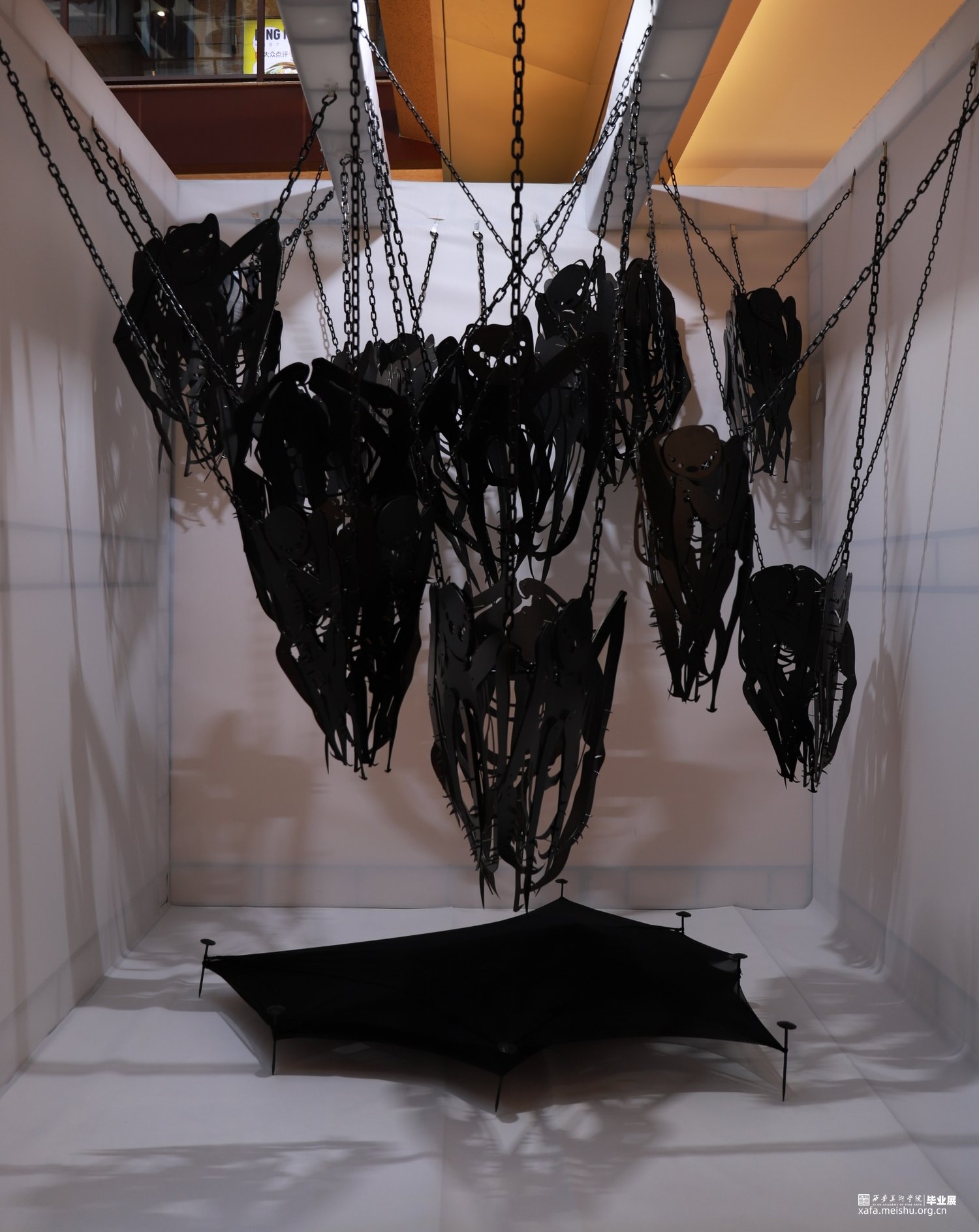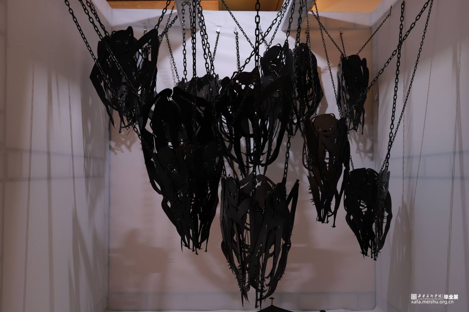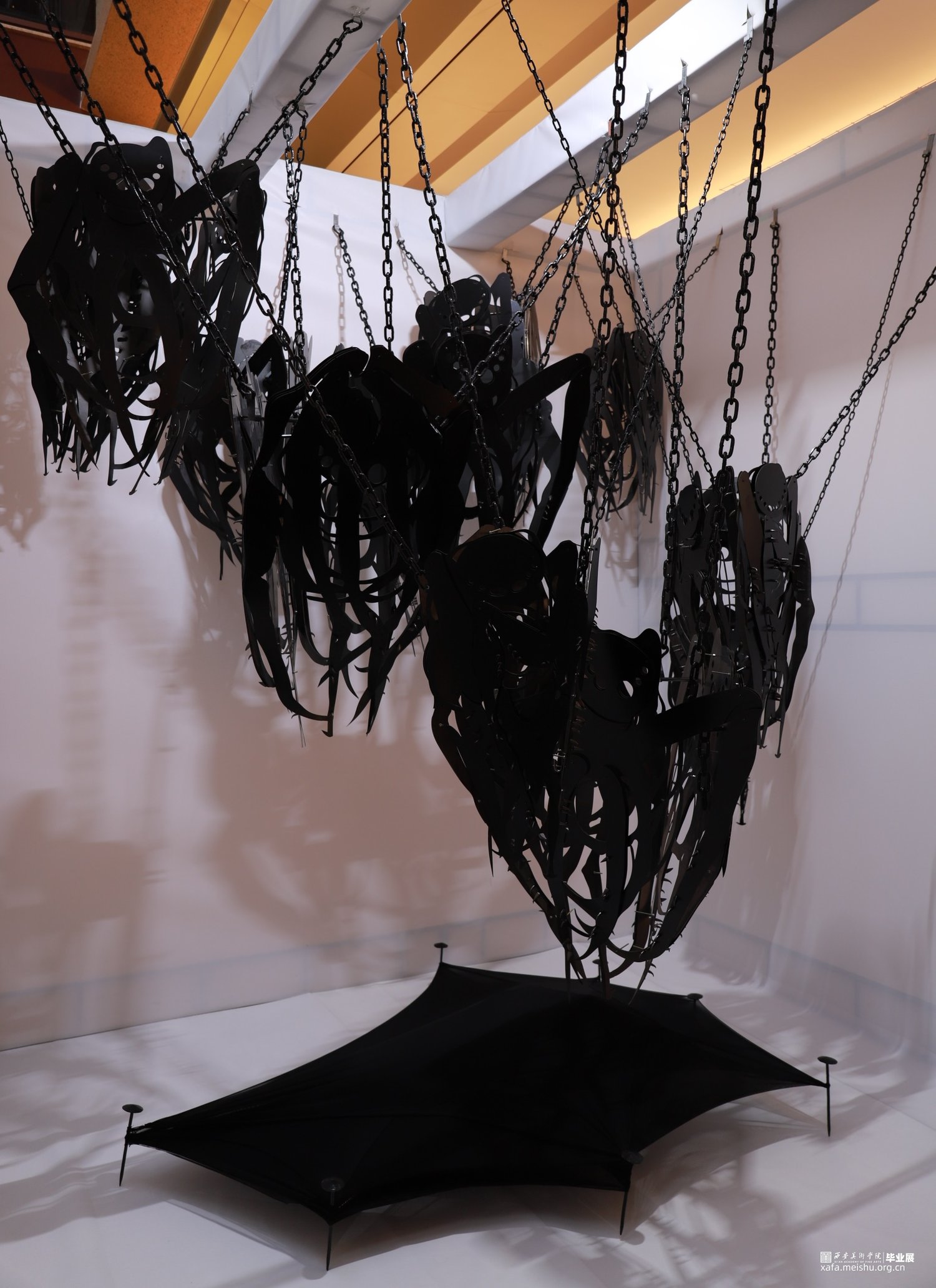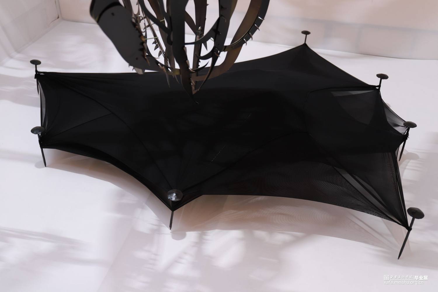作品来源于雌性蜘蛛吃掉雄性蜘蛛这一极具戏剧张力的自然现象,蜘蛛是作者情感表达的载体,体现压抑痛苦的情绪和沉默冷峻的暴力。雌性蜘蛛和雄性蜘蛛以最亲密的关系拥抱,但这一关系极其危险,看似紧密拥抱实际是吞噬的过程。物竞天择,适者生存的自然法则一定程度上也适用于人类社会。蜘蛛织网的同时,这张网不仅仅是居住的意义,更是获得食物的捕食网,一个原始的生物同时拥有着人类社会视觉下巨大的暴力美学和黑色幽默。此行为一为生存,二为繁衍,由此形成生命轮回。这同样类似部分人所面临无奈处境时或麻木或激烈的现实反应。人们往往会对自己或