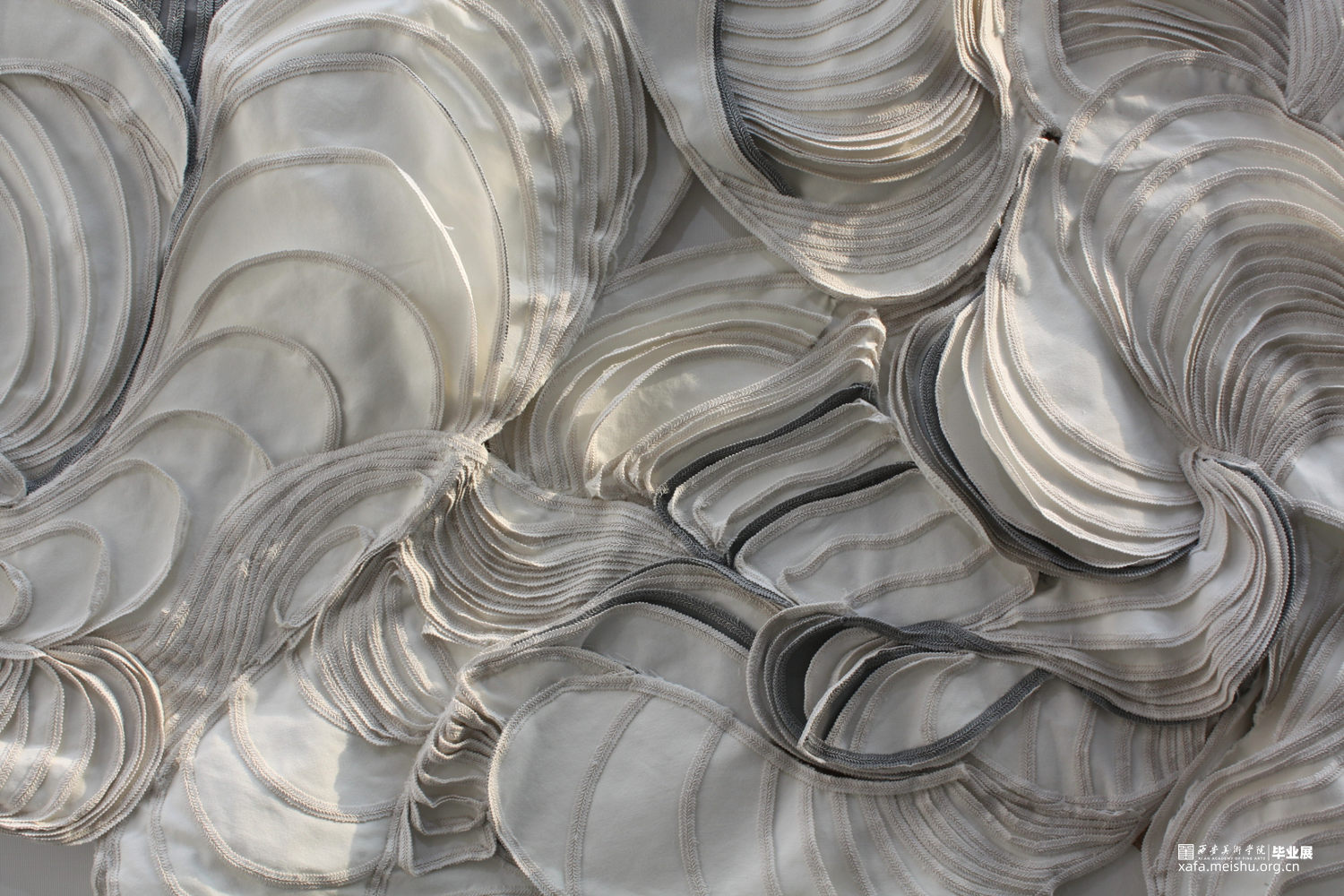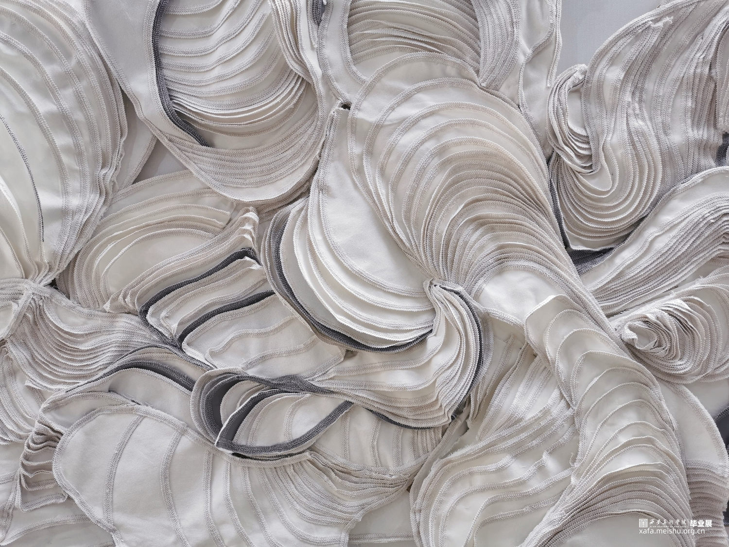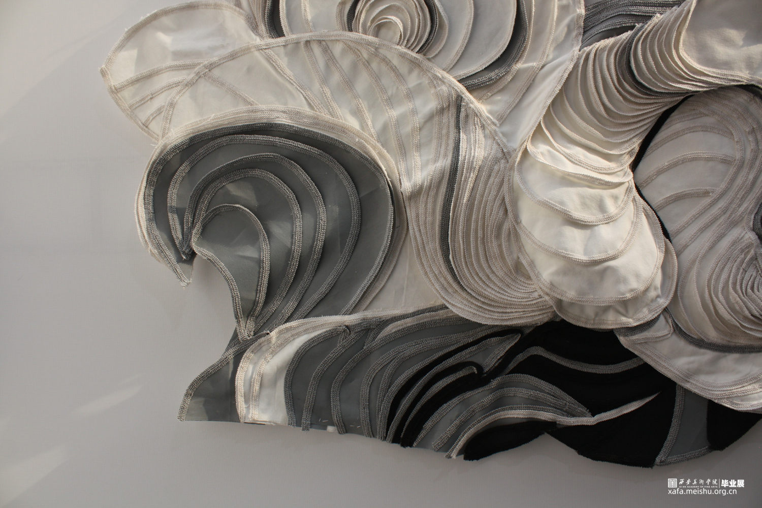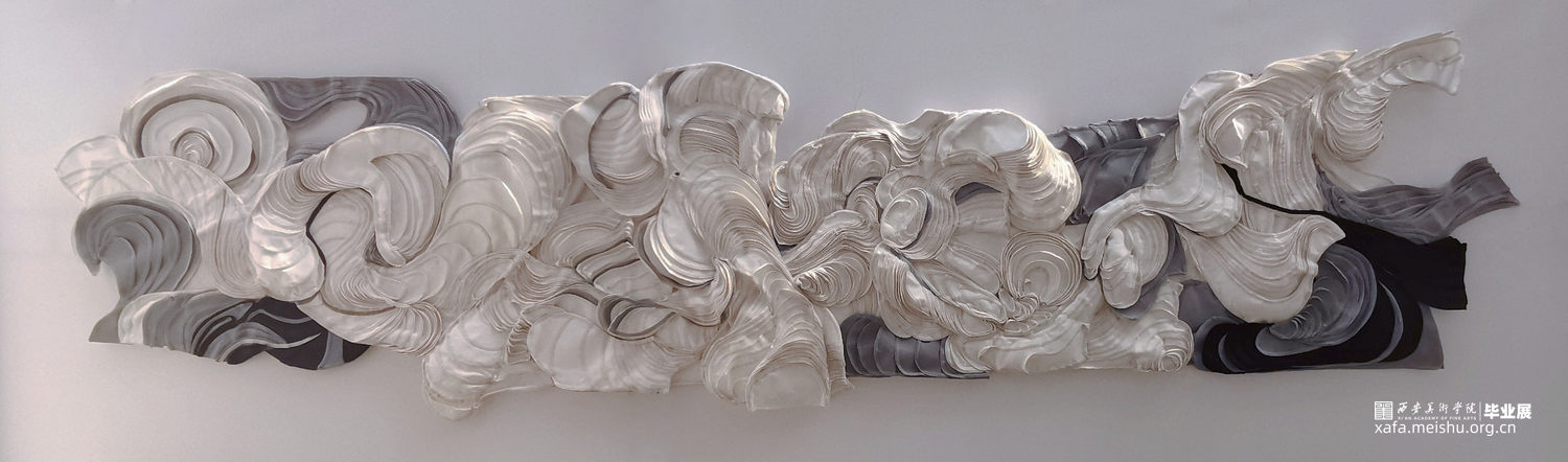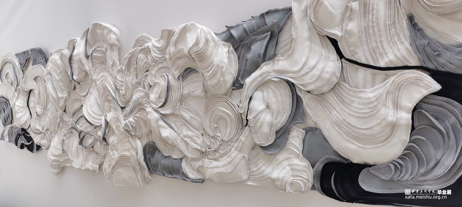 《沄》的灵感来源是一组太空中自由形成的沙堆模样,连结现实中拍浪而起的水流状态,表现着波涛汹涌蜿蜒翻转的景象,给人呈现一种大气而自由的感官体验。作品以横幅的宏大叙事,使用纤维等软雕塑材料,度量剪裁、盘旋环绕,整体色调以白色为主,辅以灰黑,形成富有节奏的黑白关系,边缘粘贴花边增添细节和视觉效果,制造不同的起伏层次关系。“它有天上的云雨声,它有海上的风涛声”,《沄》的意境在于云水相间的自如,作品流动的气势也随着抽象的形态展现淋漓。