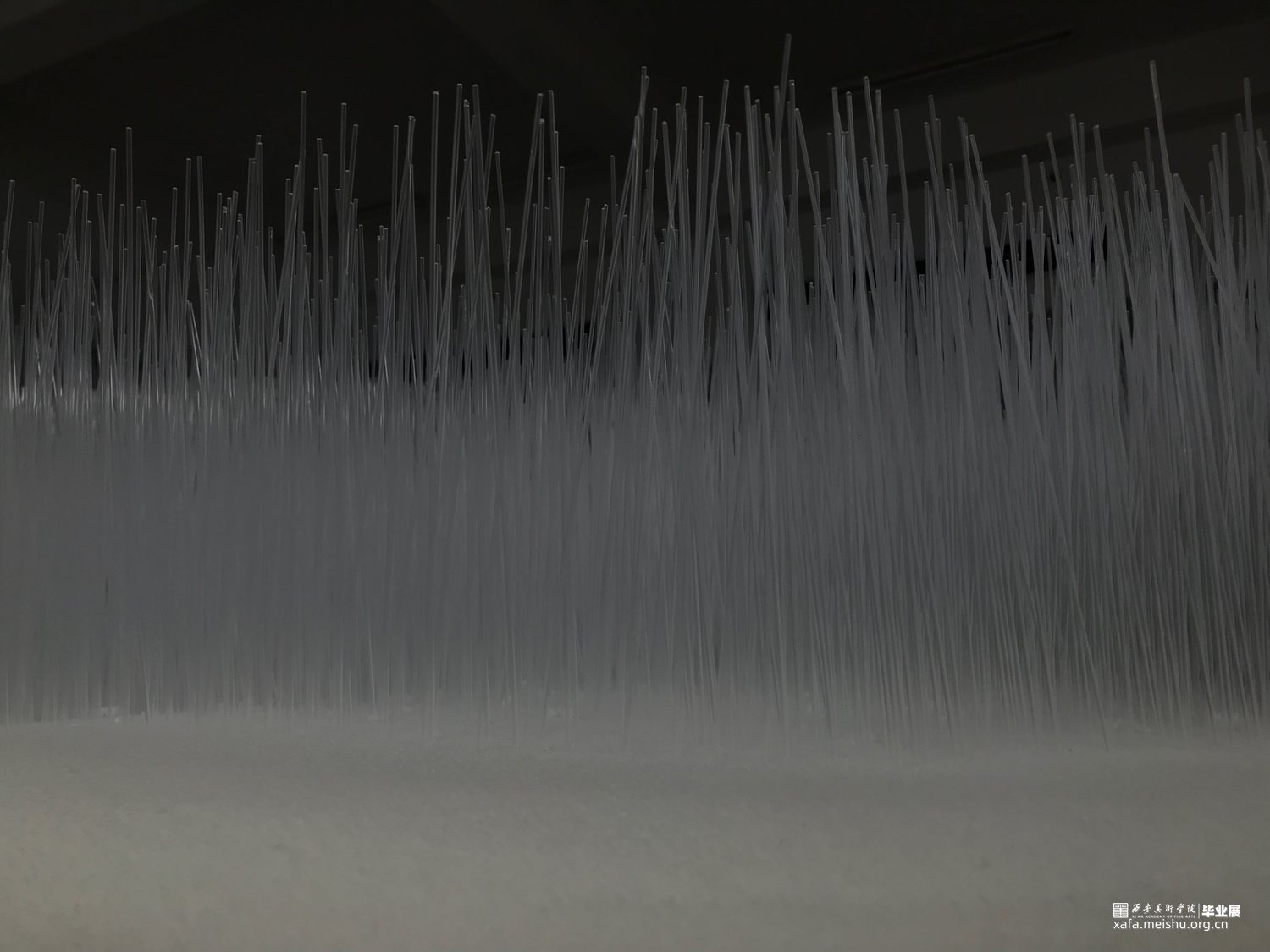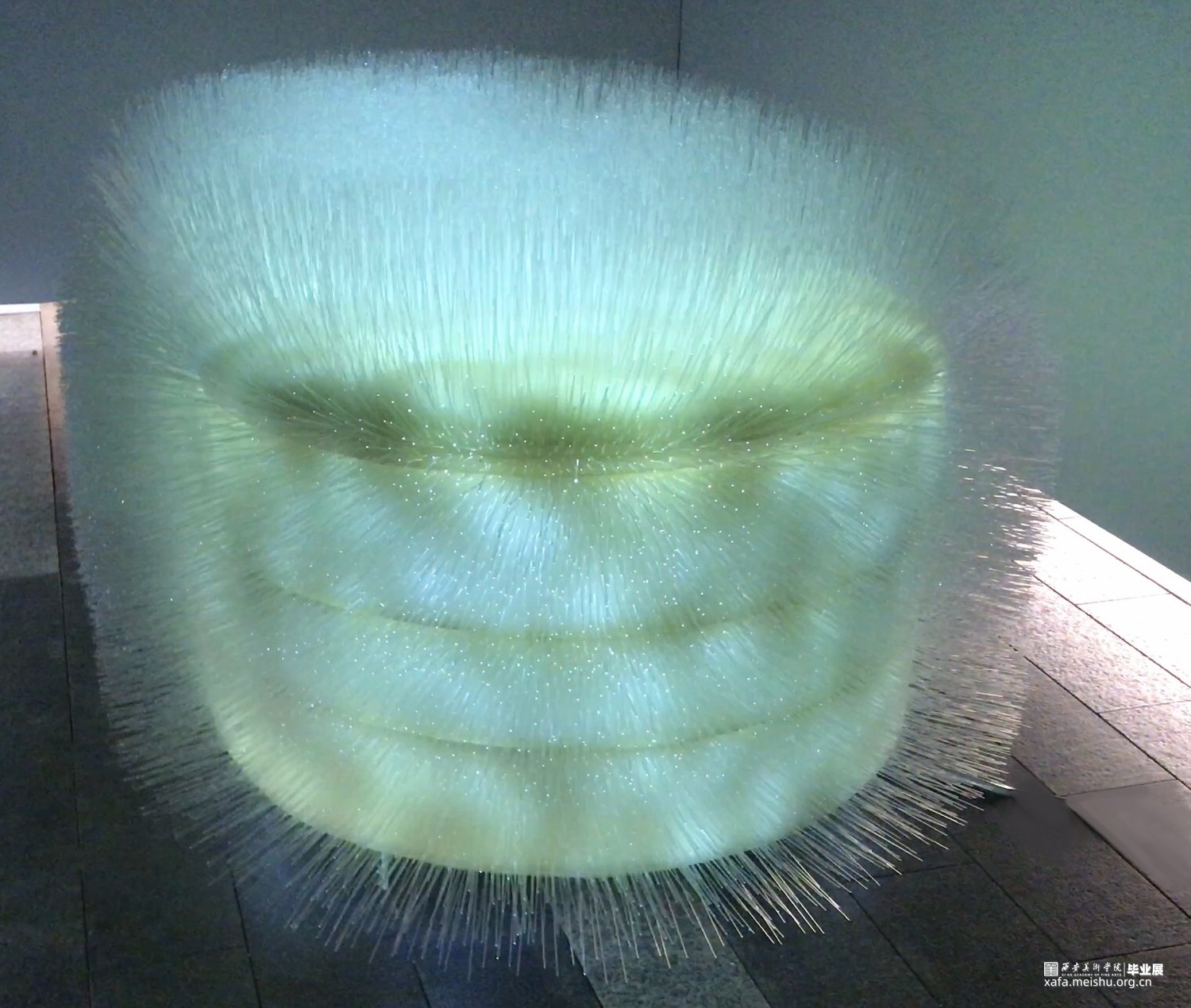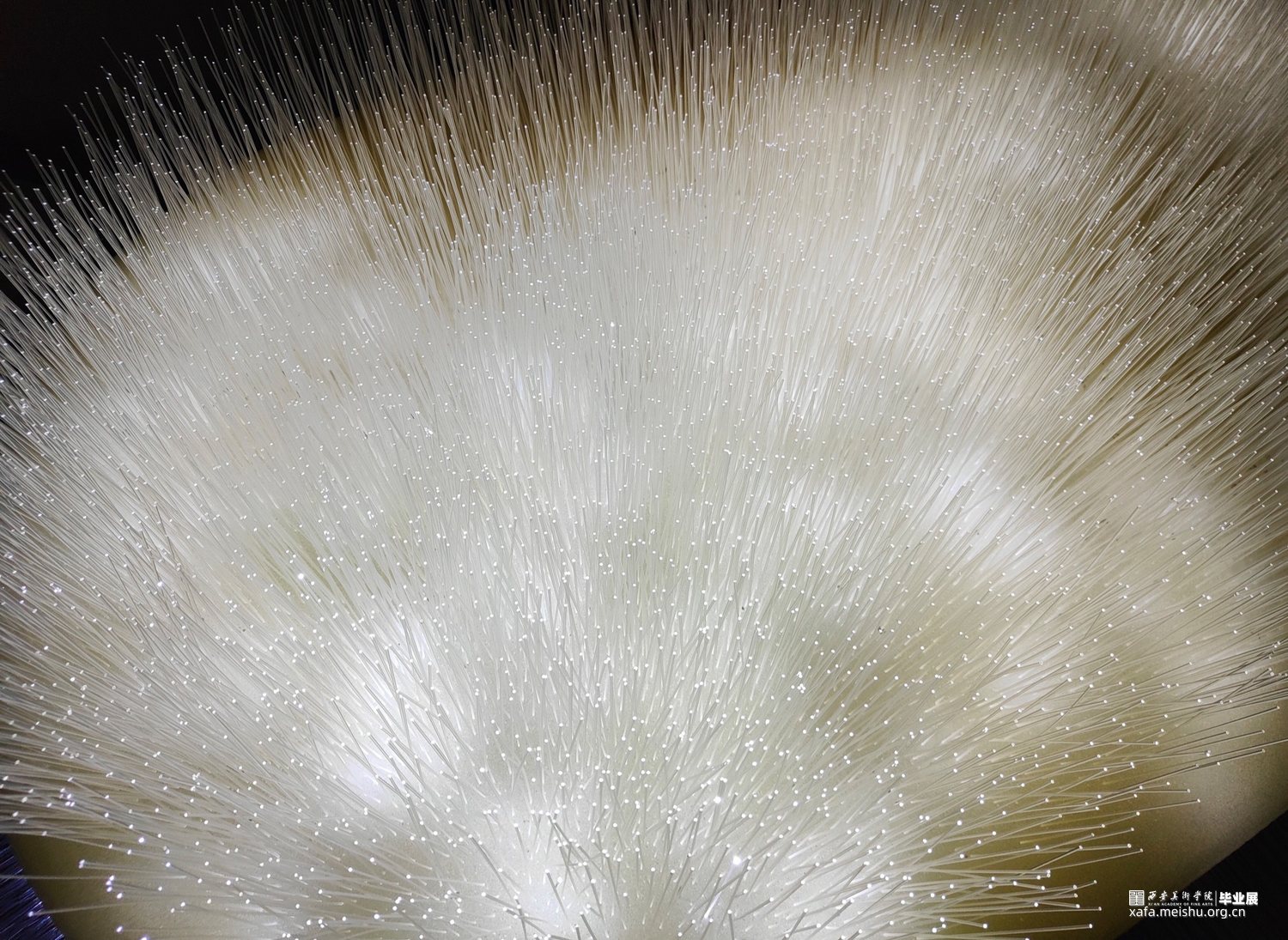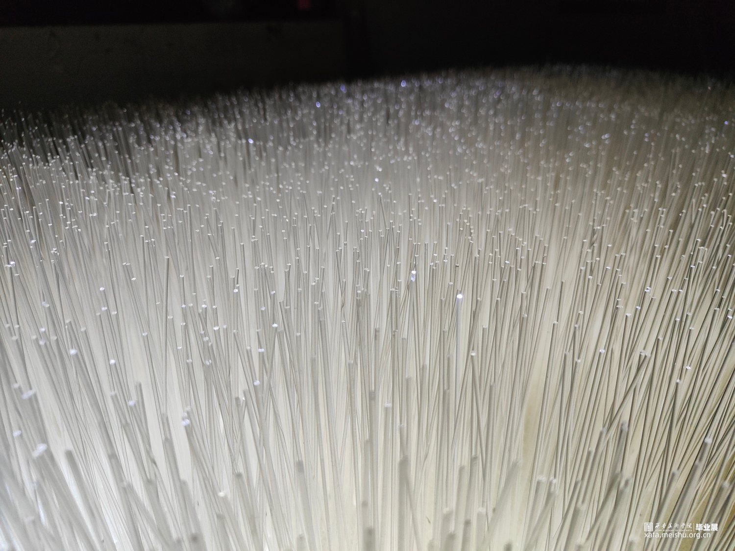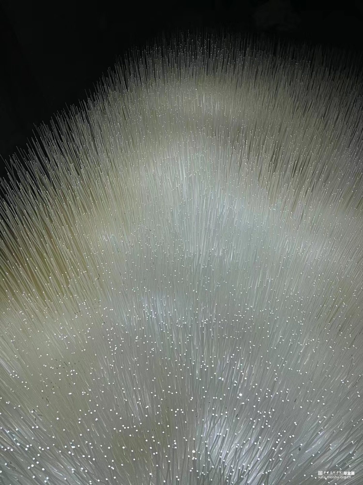 将霉菌的生长舞台从隐蔽的角落搬到大众面前,用光导纤维体现霉菌毛茸茸的质感,将变味的情绪可视化。展现出一段亲密关系里自我袒露中的脆弱与敏感,在灯光一明一暗的呼吸间,再生的情绪是变味的语言,也是变质的情感,既柔软又坚硬。