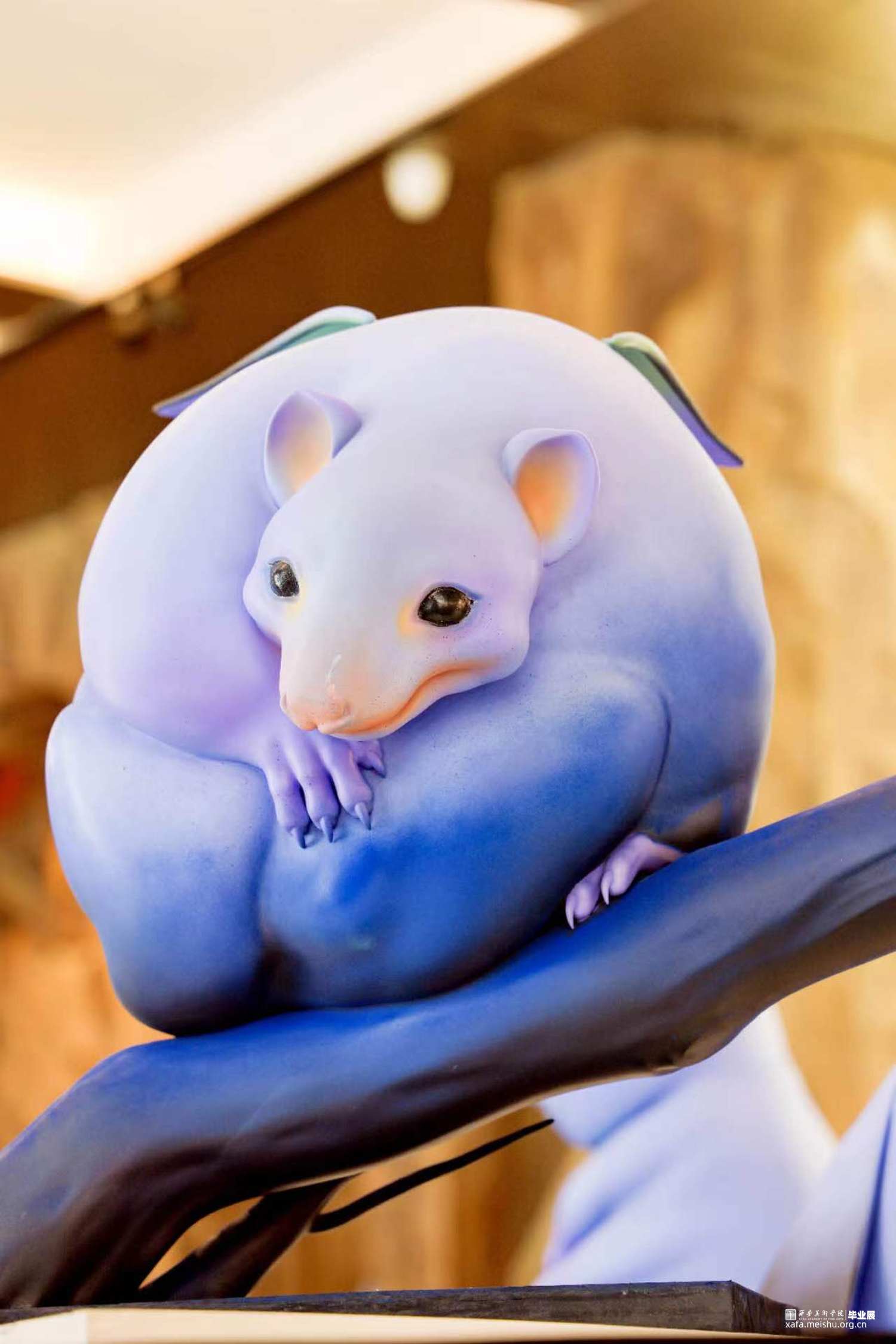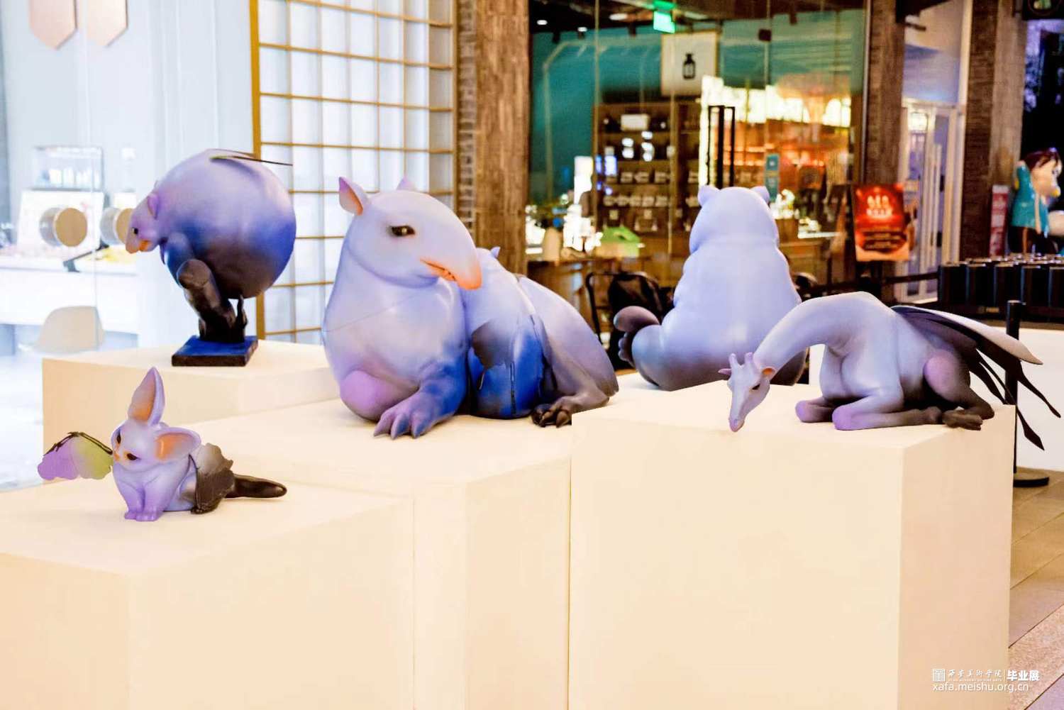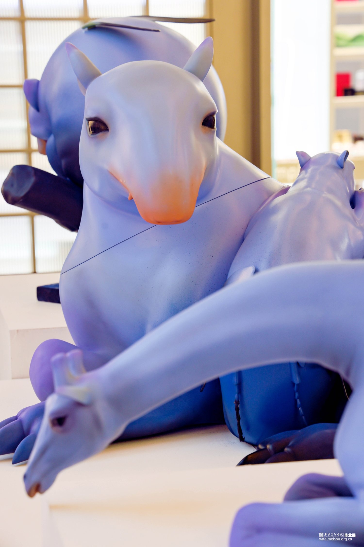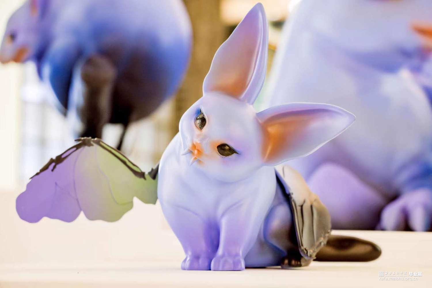 我的作品灵感来源于荷兰艺术家CedricLaquieze,他是将昆虫拆分重组,从而以一种精灵的神态重现于世。而我则是将动物形象进行重构,制作出熟悉又陌生的精灵形象。一组五个动物。在造型上,各有各的特色,有的机灵,有的疲惫,有的警惕,有的呆呆。材料上,采用光滑的树脂,光滑的外表显得质朴不惧危险性。颜色上,整体的蓝色赋予了这些动物的相对安静的性格特征。少部分的偏紫偏深灰的渐变又增添了一抹神秘色彩,如同异界水精灵一样,可爱但让人捉摸不透。我希望能借助这些熟悉的精灵形象在现如今节奏快而嘈杂的大环境中带给观者一瞬的
