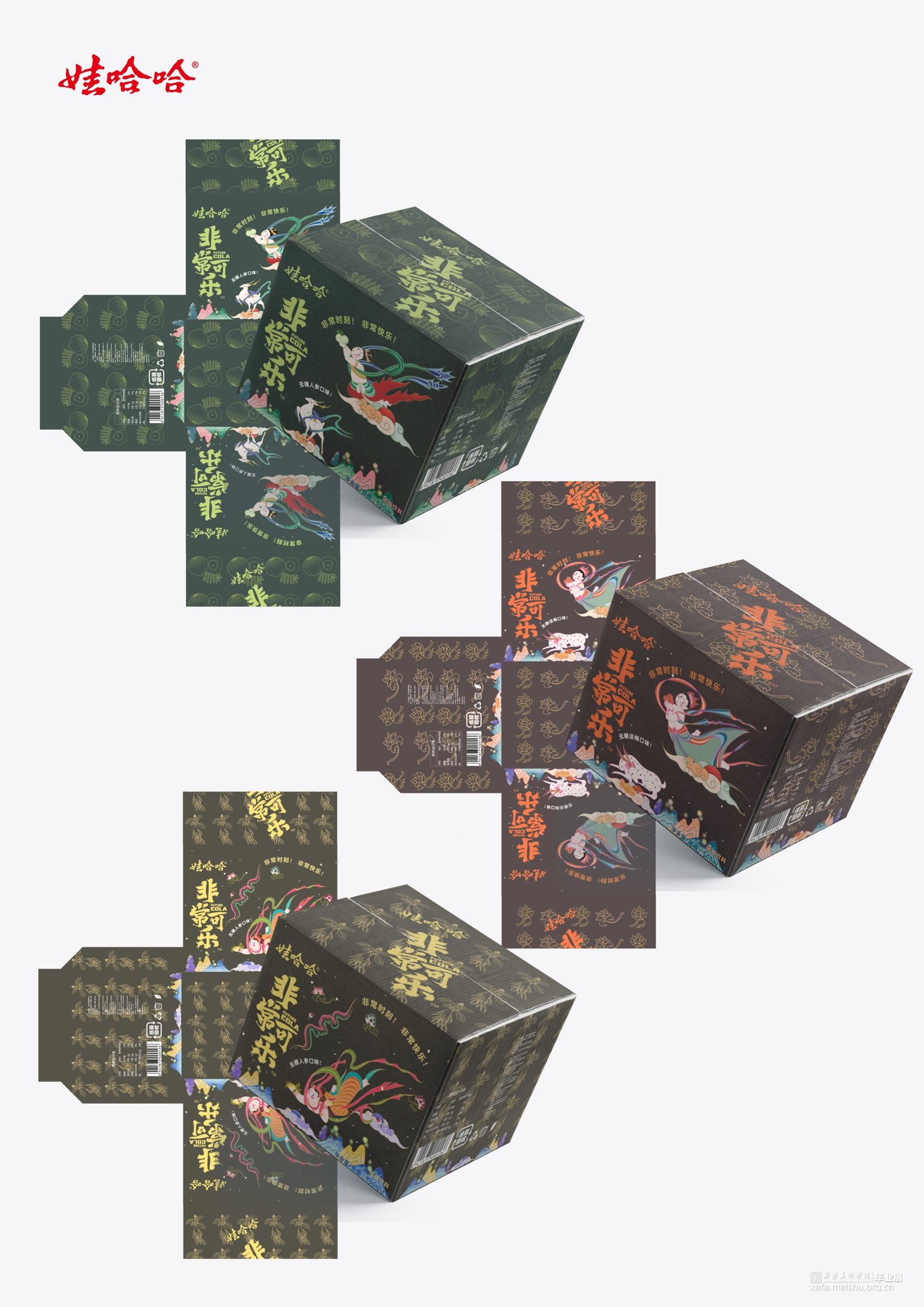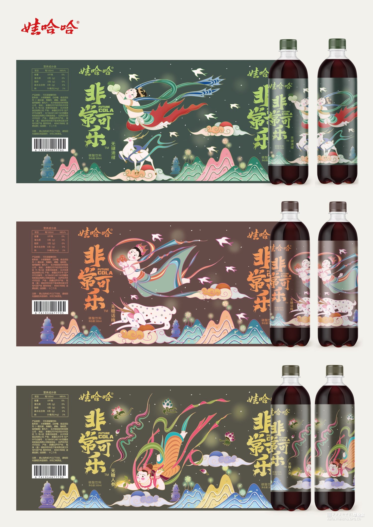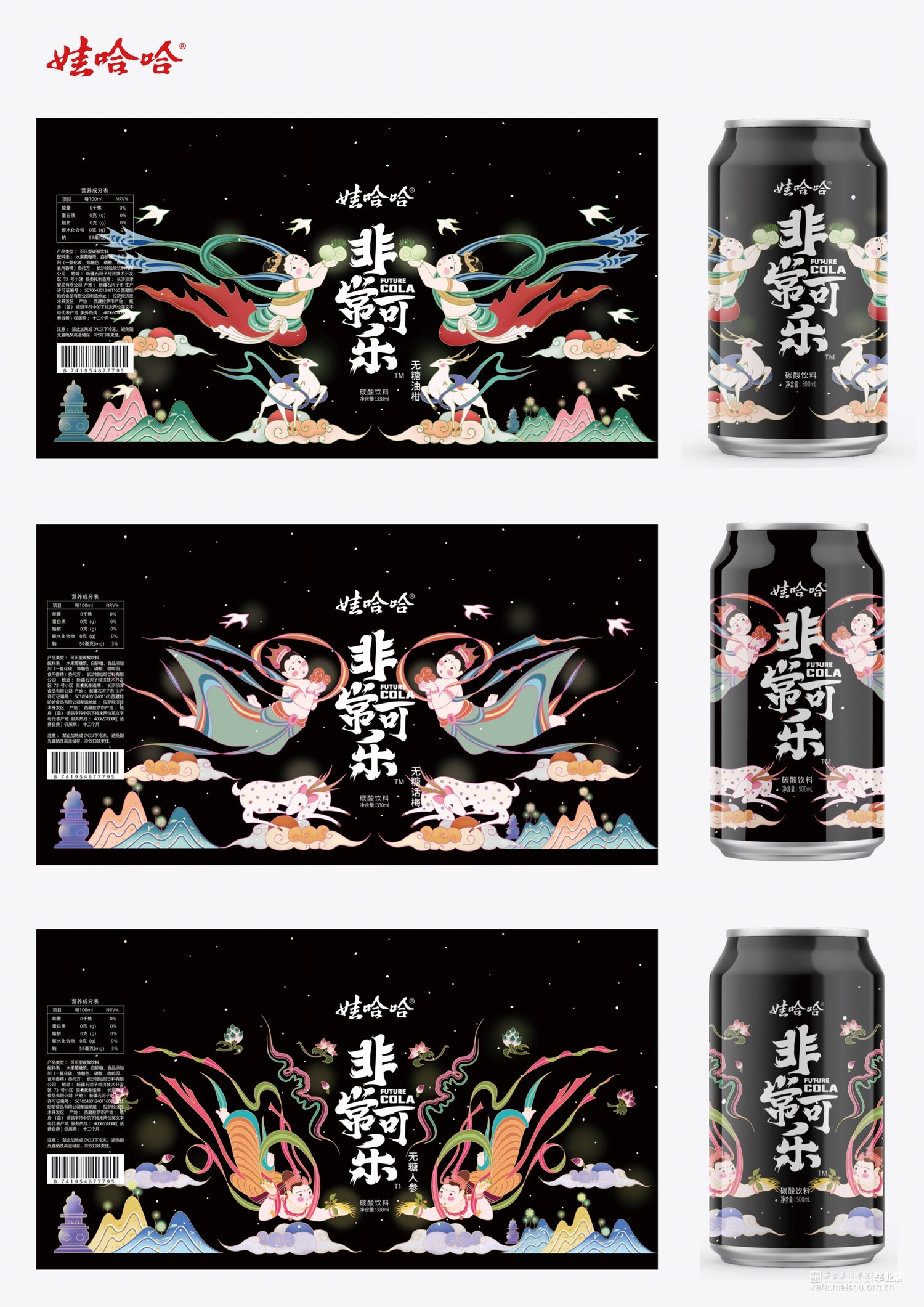 敦煌文化主题的限定系列,以敦煌壁画中特有的人物及神话故事等具代表性元素入手,将非常可乐中三种口味的原材料与敦煌壁面中的传统之美相融合:选取飞天”〝九色鹿”〝风火神祝融〞“莫高窟晚唐第14窟〞一梦入敦煌〞等词条取飞天之态,用食材之形;生动的与产品自身定位相吻合的创造手法来呈现。