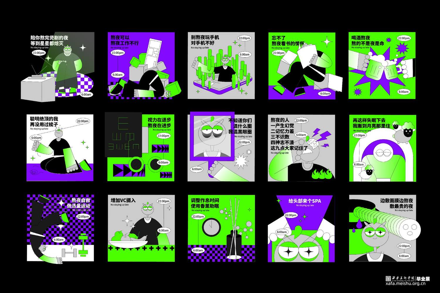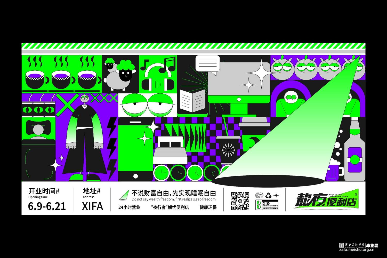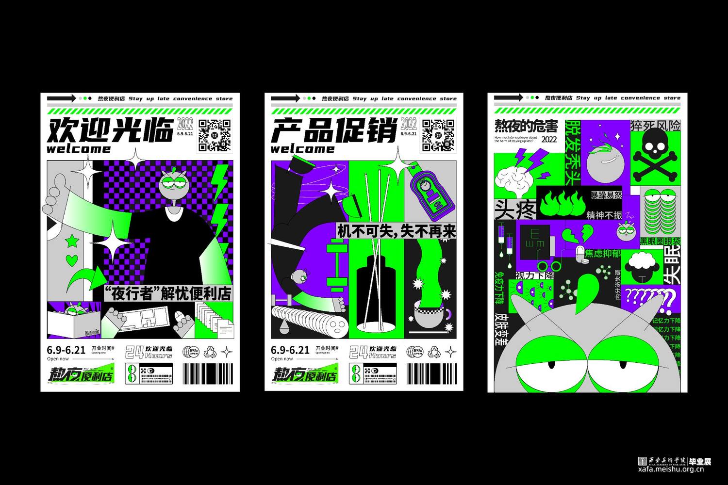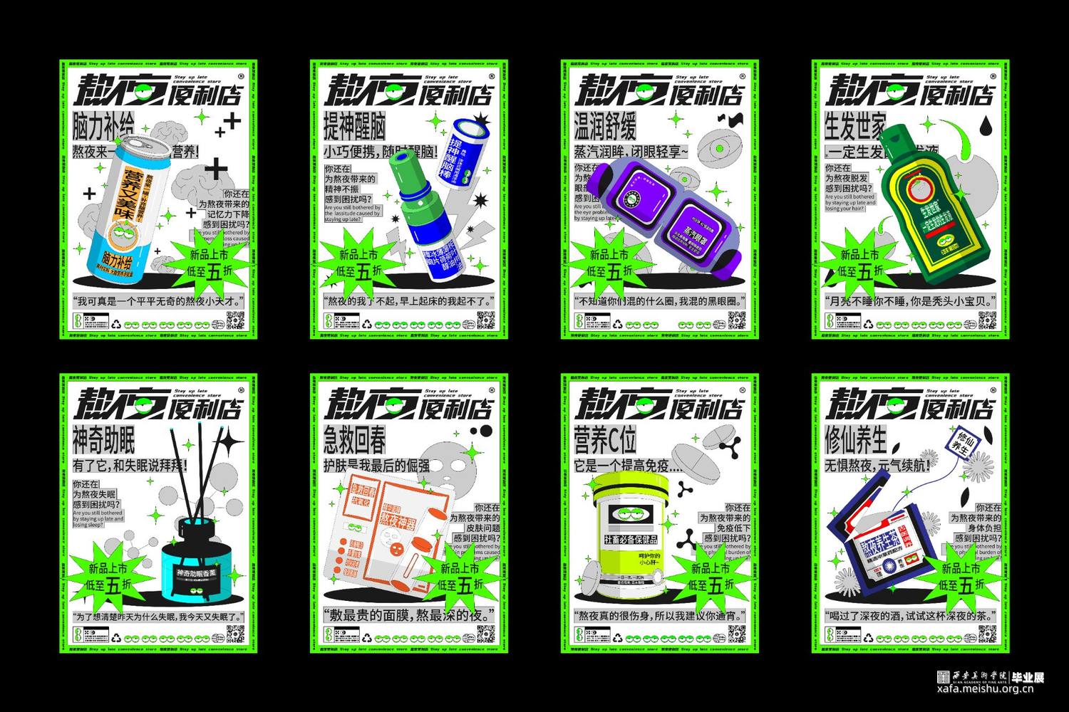 为了让当代年轻人们意识到熬夜的危害,提高年轻人对“熬夜”的认知,以及了解如何去降低熬夜后带来的影响,本项目针对年轻人提出了一个“熬夜”的品牌概念,围绕“熬夜便利店”展开对logo、海报、包装、动态等视觉内容的设计。以自嘲、戏谑、恶搞的方式来反映当下年轻人的熬夜现状。
