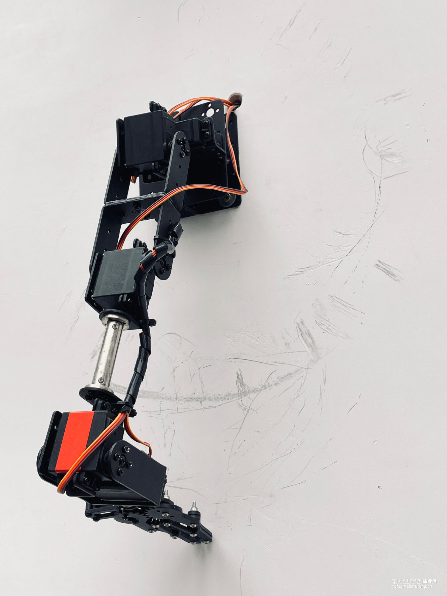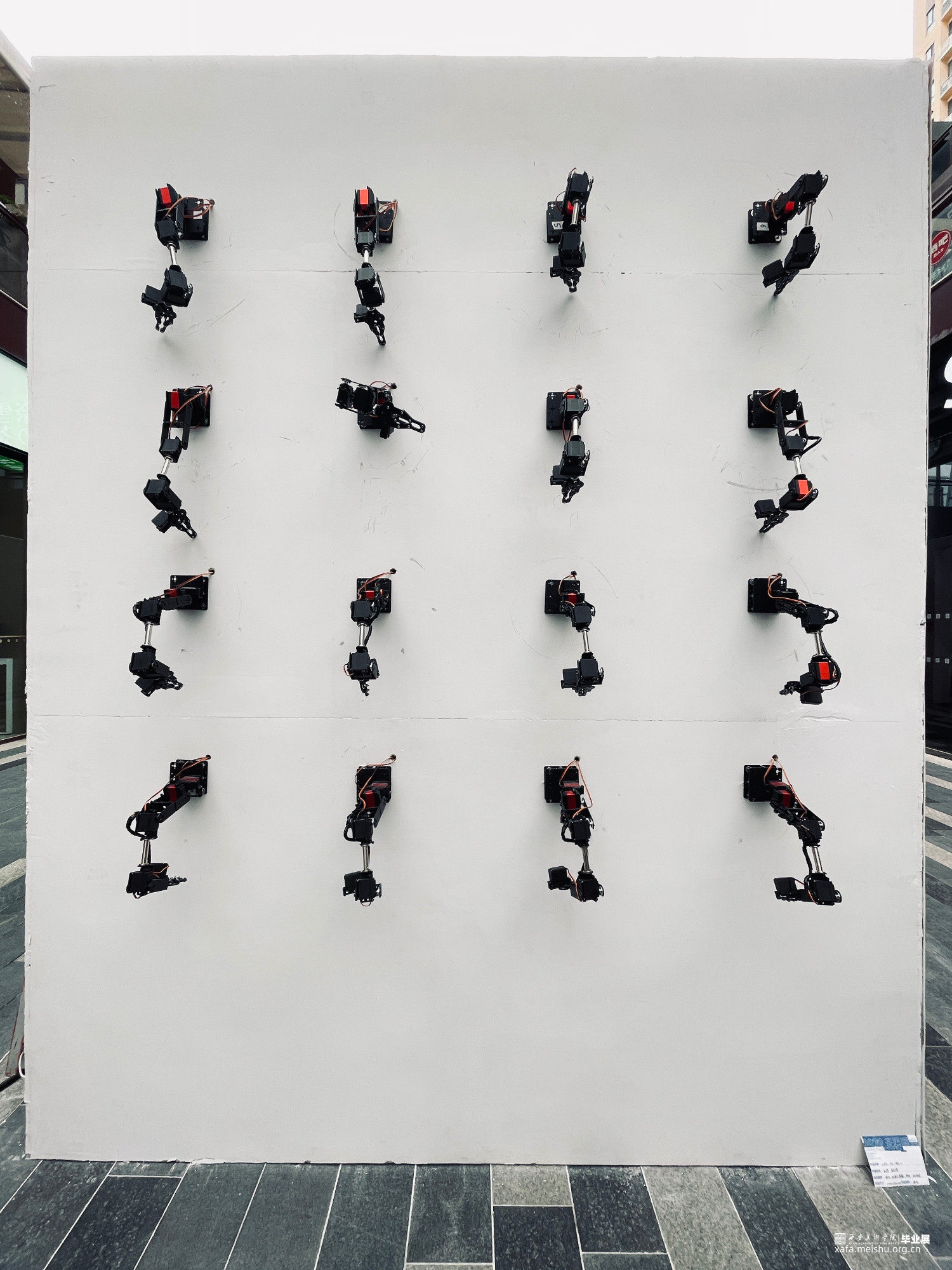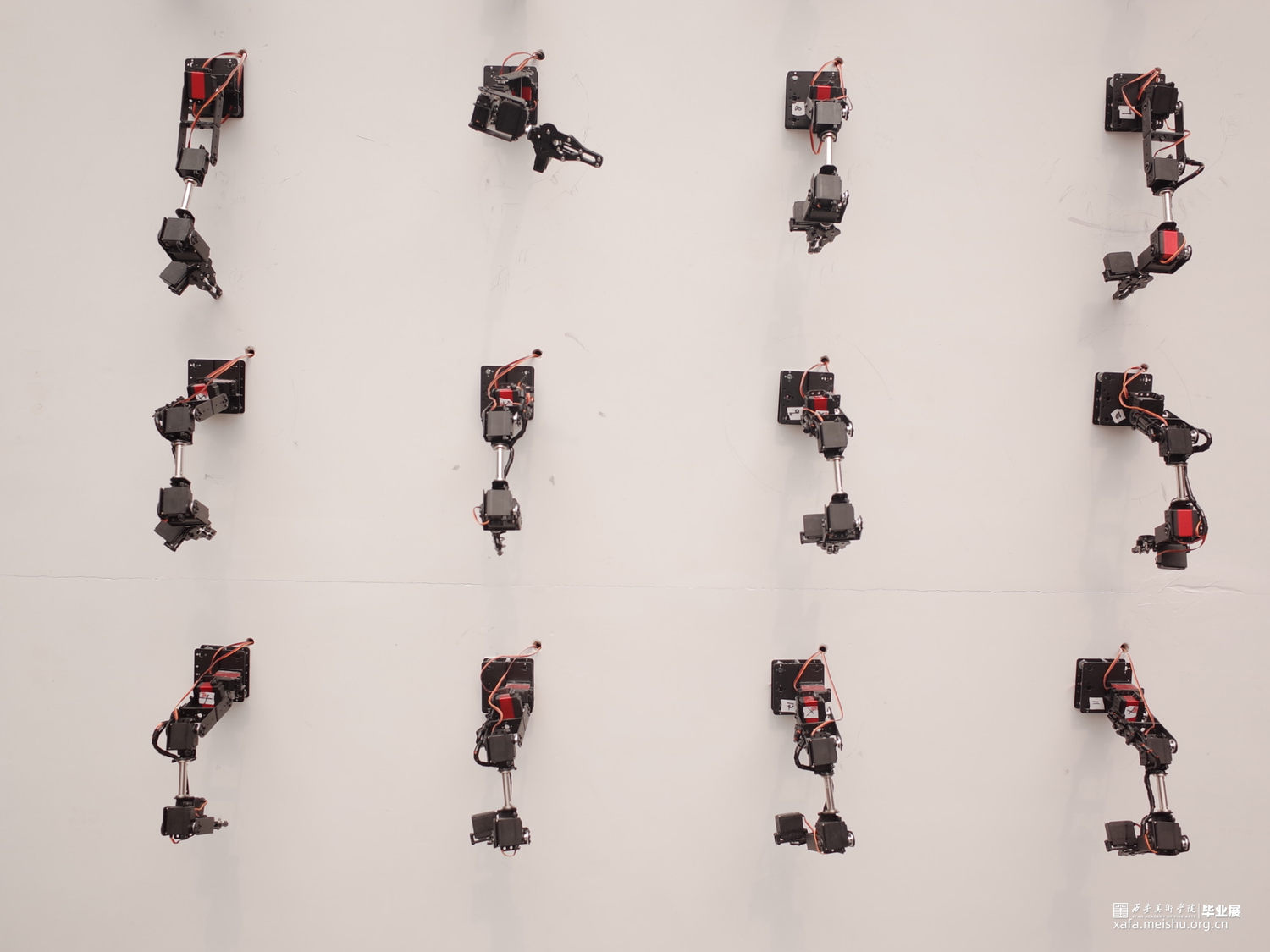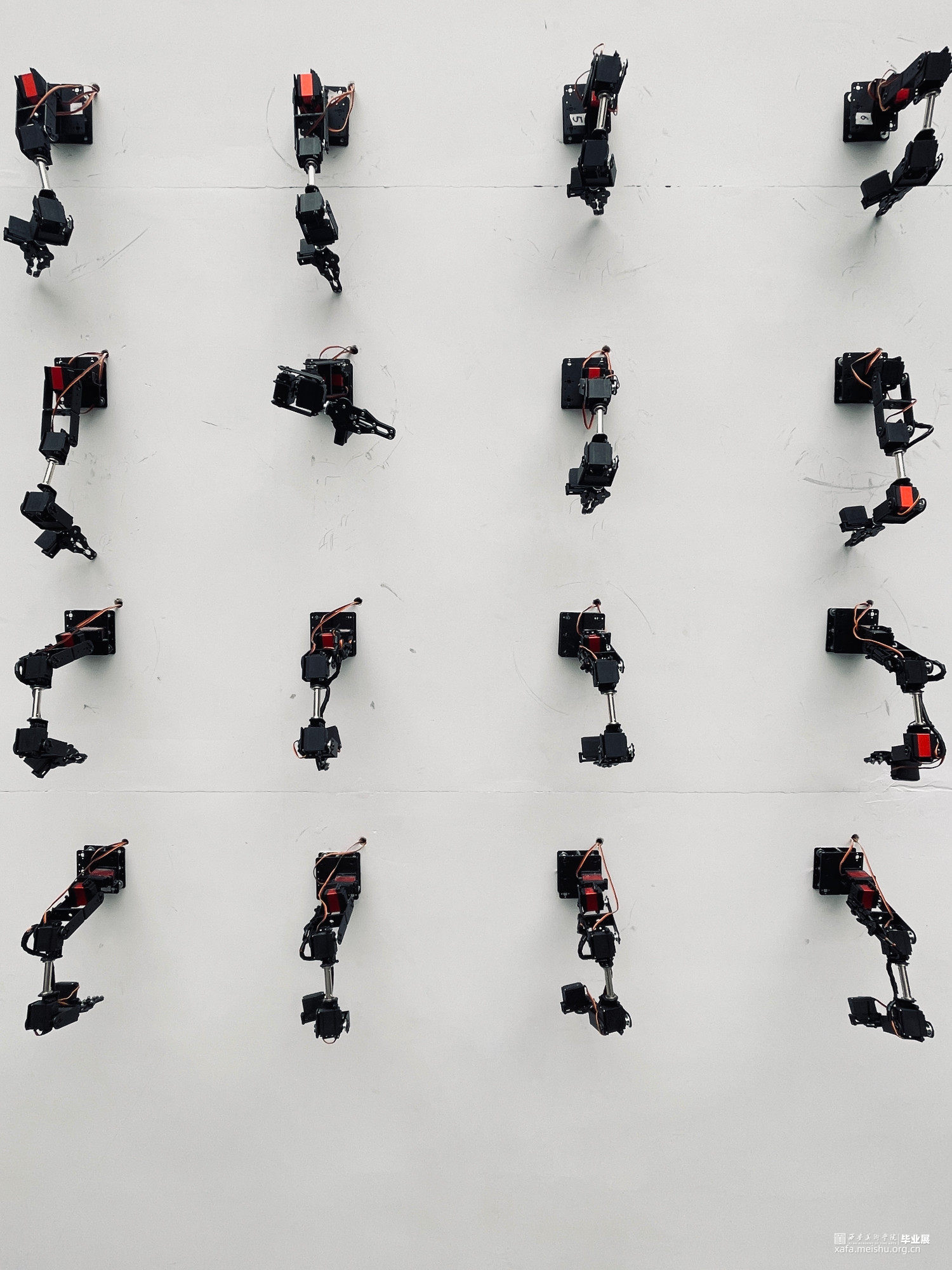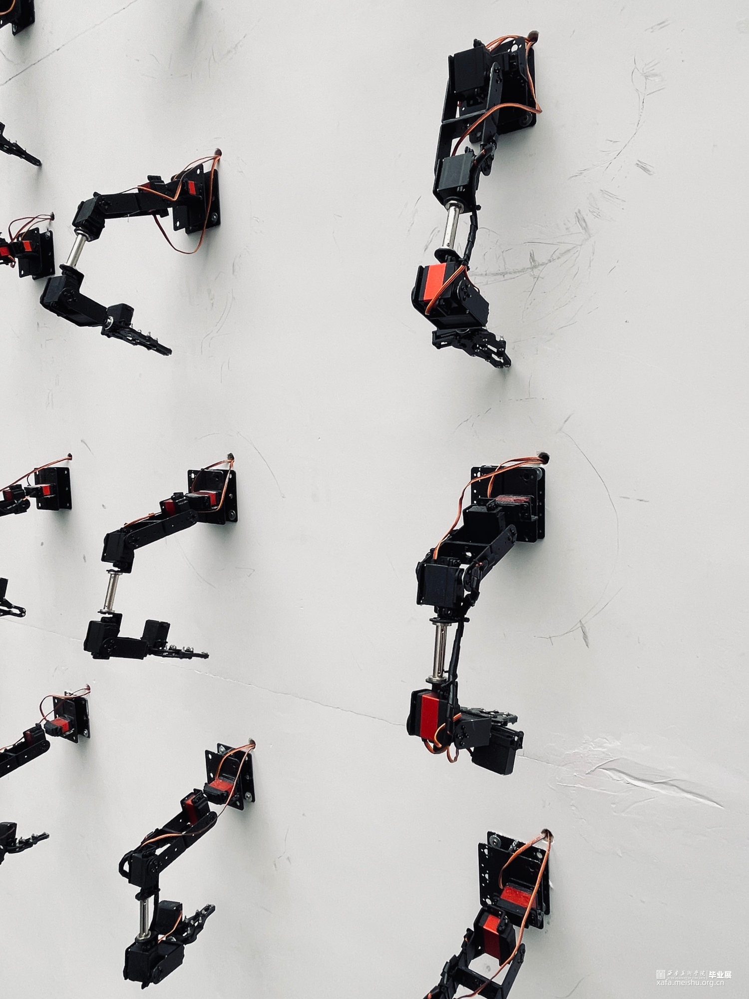 作品以当代语境下人们的计划常常受到各种客观条件制约而无法实现,陷入与客观障碍拉扯对峙的困境作为出发点,将机械动态装置作为载体,模拟人的主观消极情绪与客观环境的对峙与拉扯,引出“人摆脱不了环境”这个话题。机械臂在这样的环境下,进行重复机械运动。随着时间的推移,零件的过度使用,能源的过度消耗,会使机械臂的动作日渐迟缓直至无法制动。仅留下它工作的痕迹证明一些事件发生过。如同当代年轻人的生活状态,我们摆脱不了每天的重复工作与生活。当热情被环境磨灭,个性也会消弭。人们逐渐因挣脱不了环境而选择摆烂和躺平。