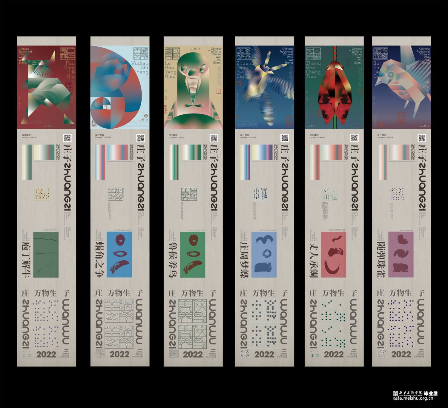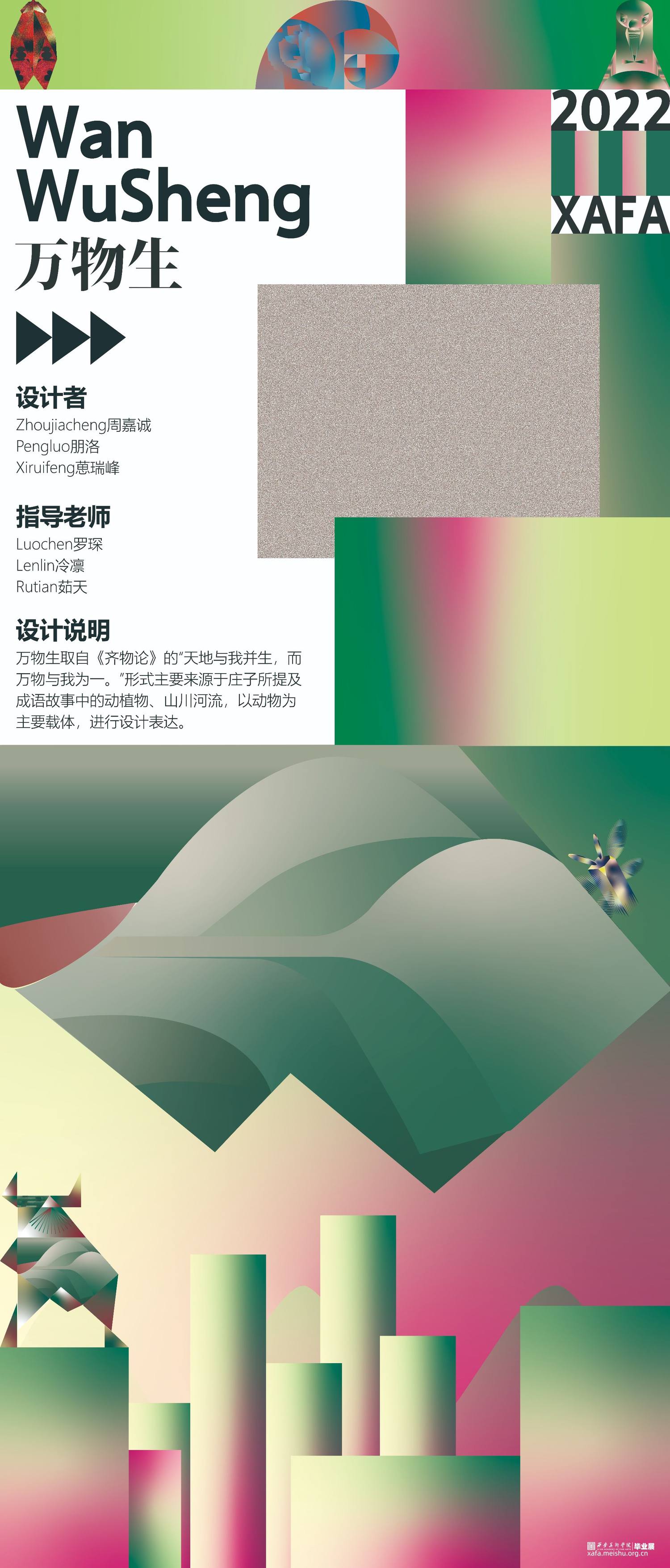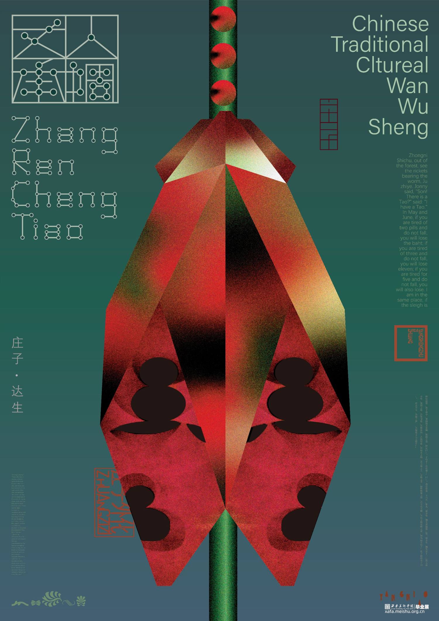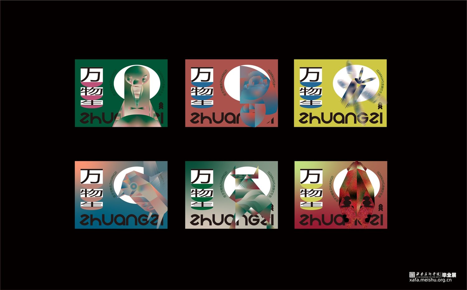 万物生题目取自庄子“天地与我并生,而万物与我为一”,设计题材来源于庄子成语,希望通过现代设计,如抽象设计、设计解构重组将成语故