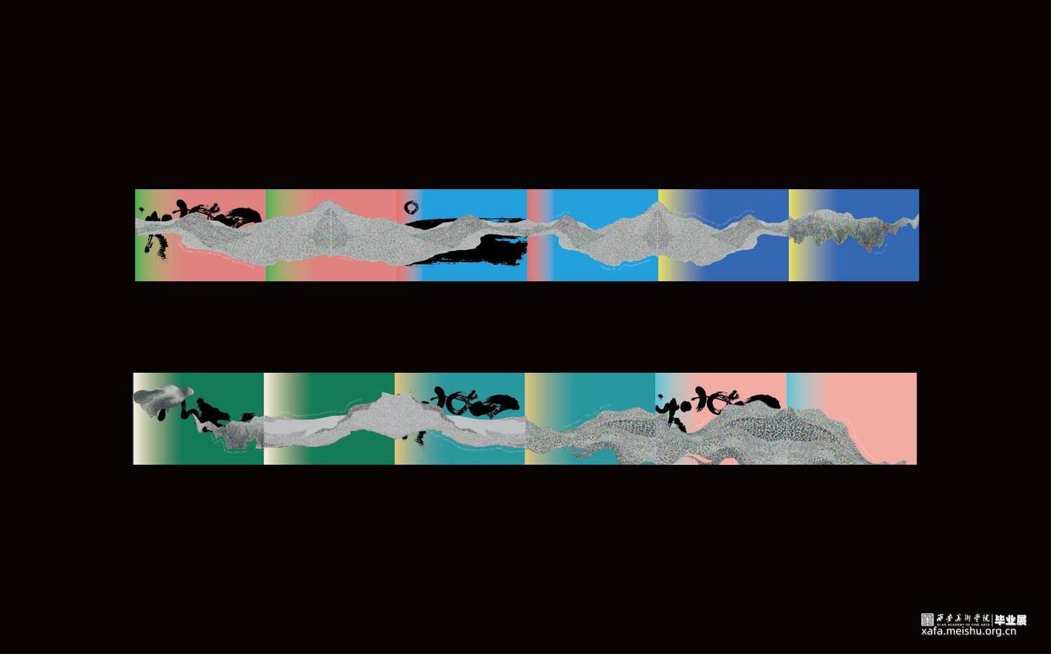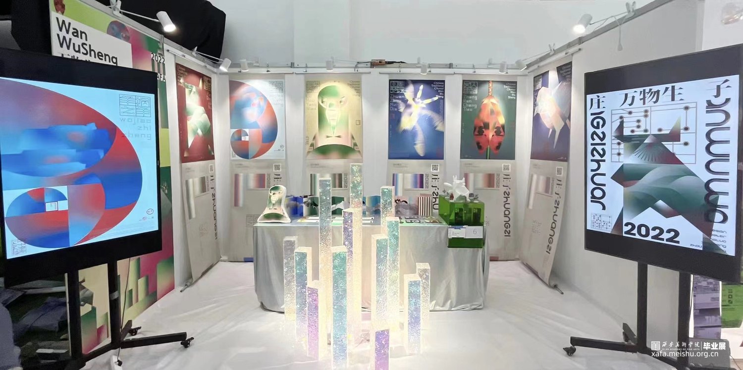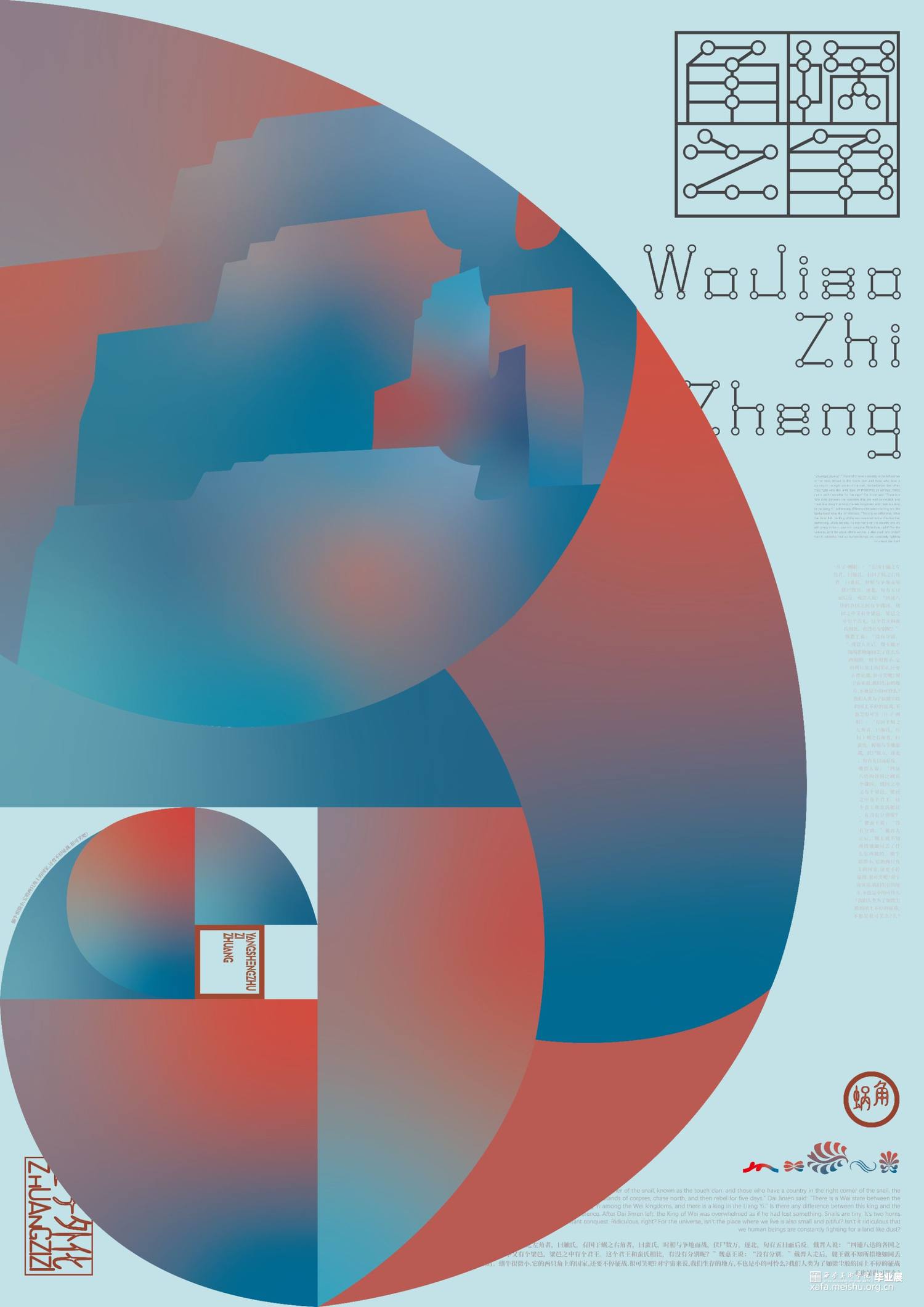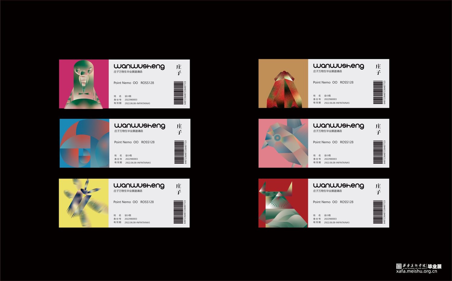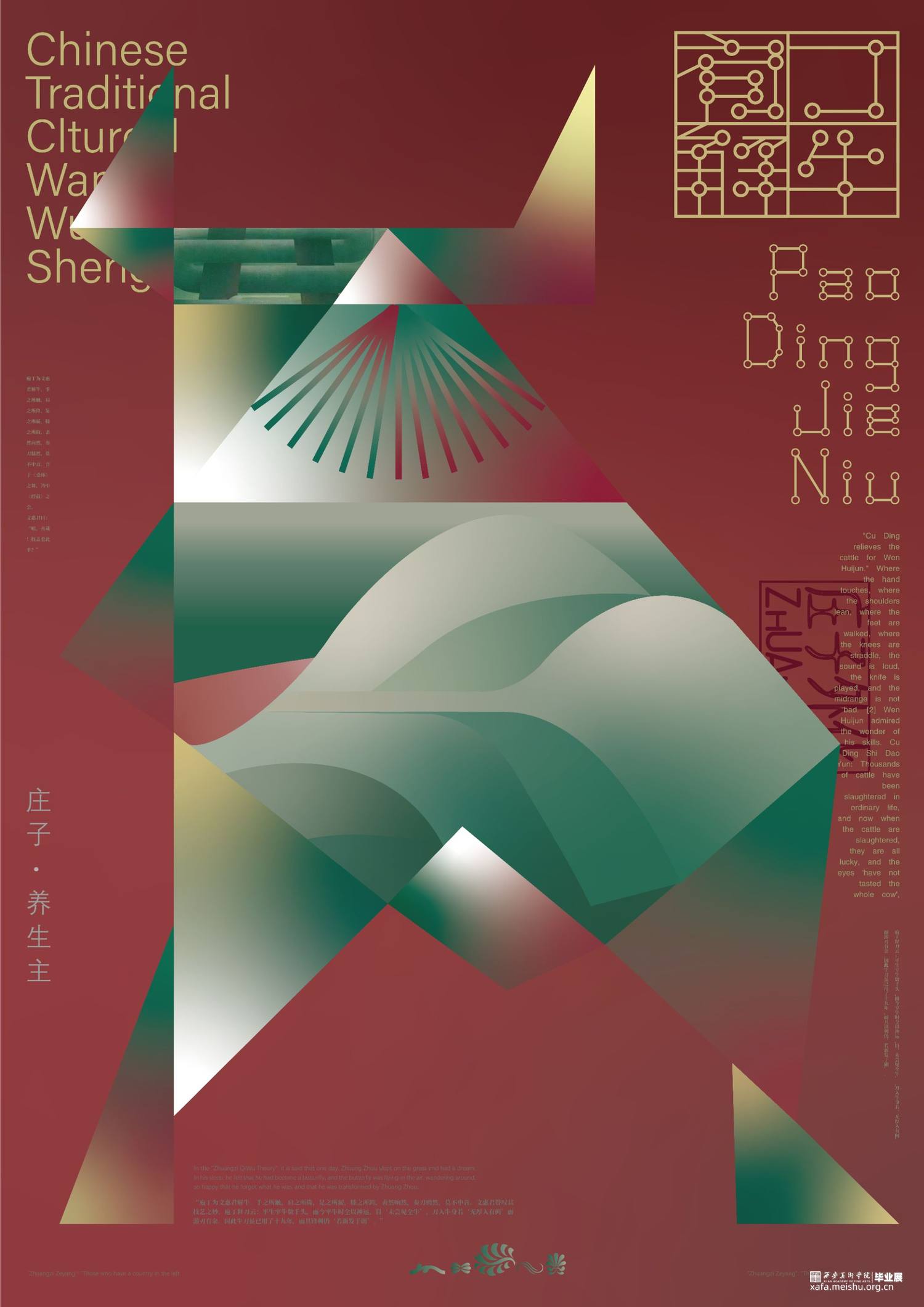 万物生题目取自庄子“天地与我并生,而万物与我为一”,设计题材来源于庄子成语,希望通过现代设计,如抽象设计、设计解构重组将成语故