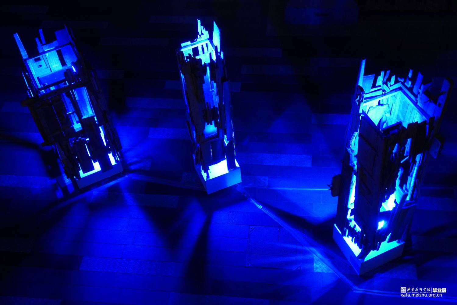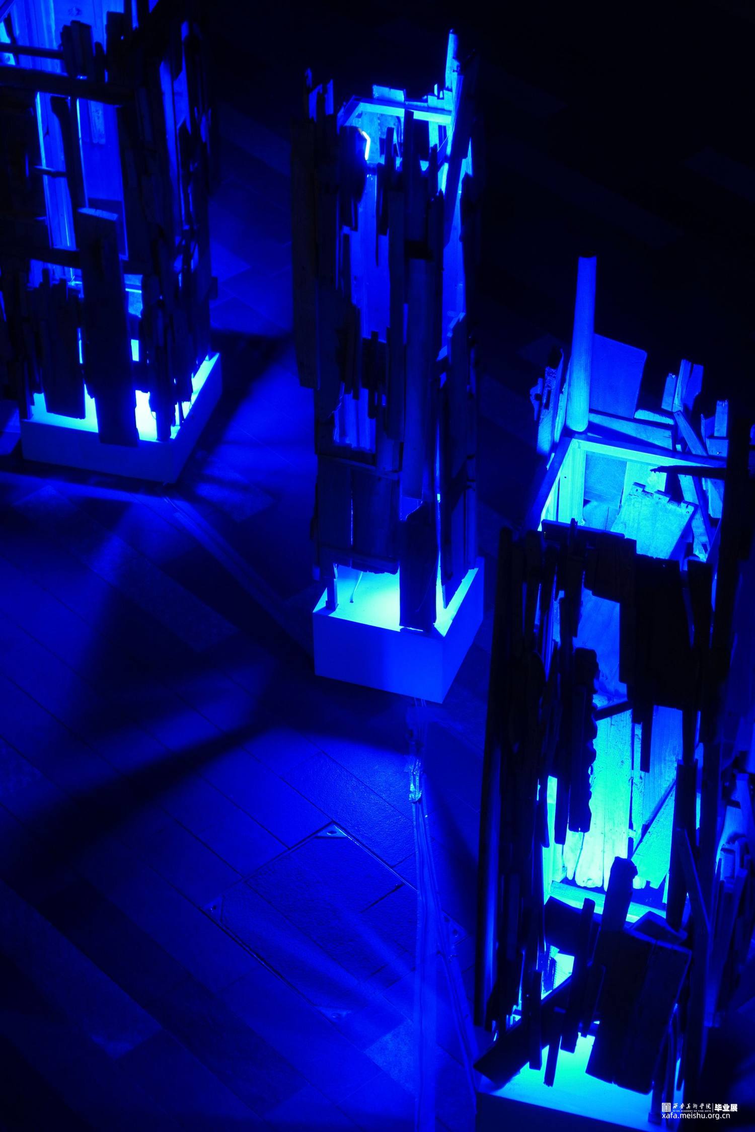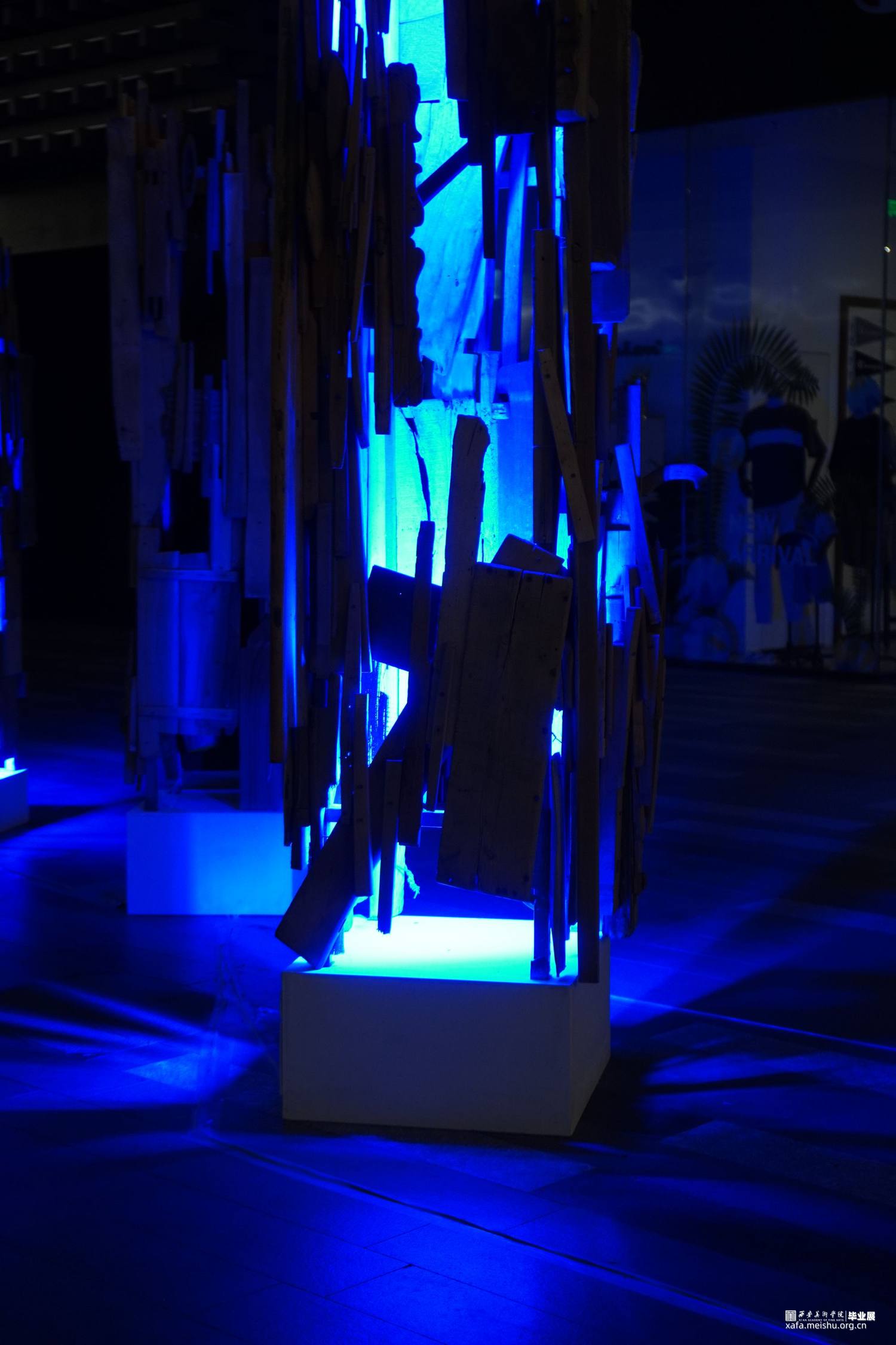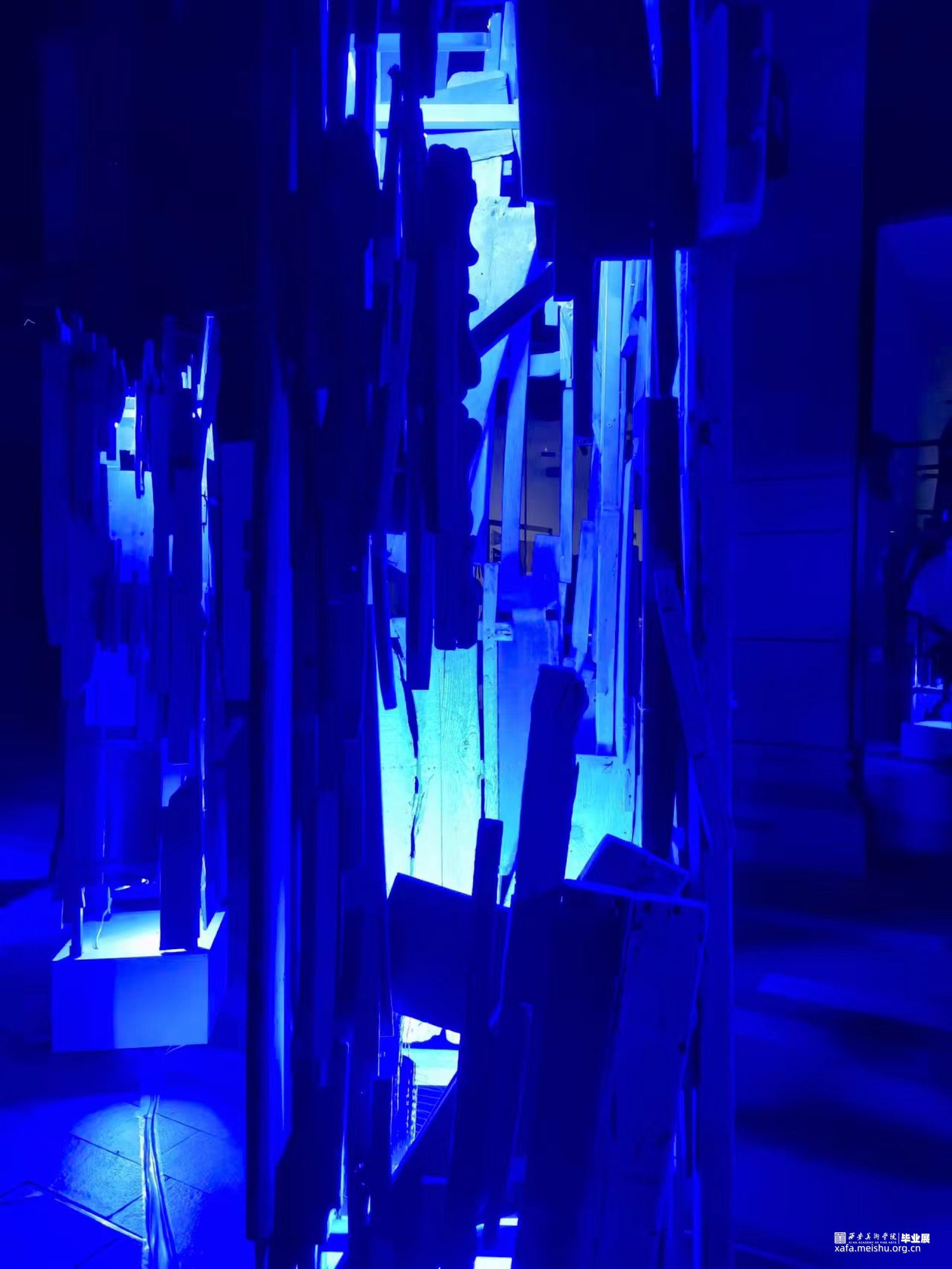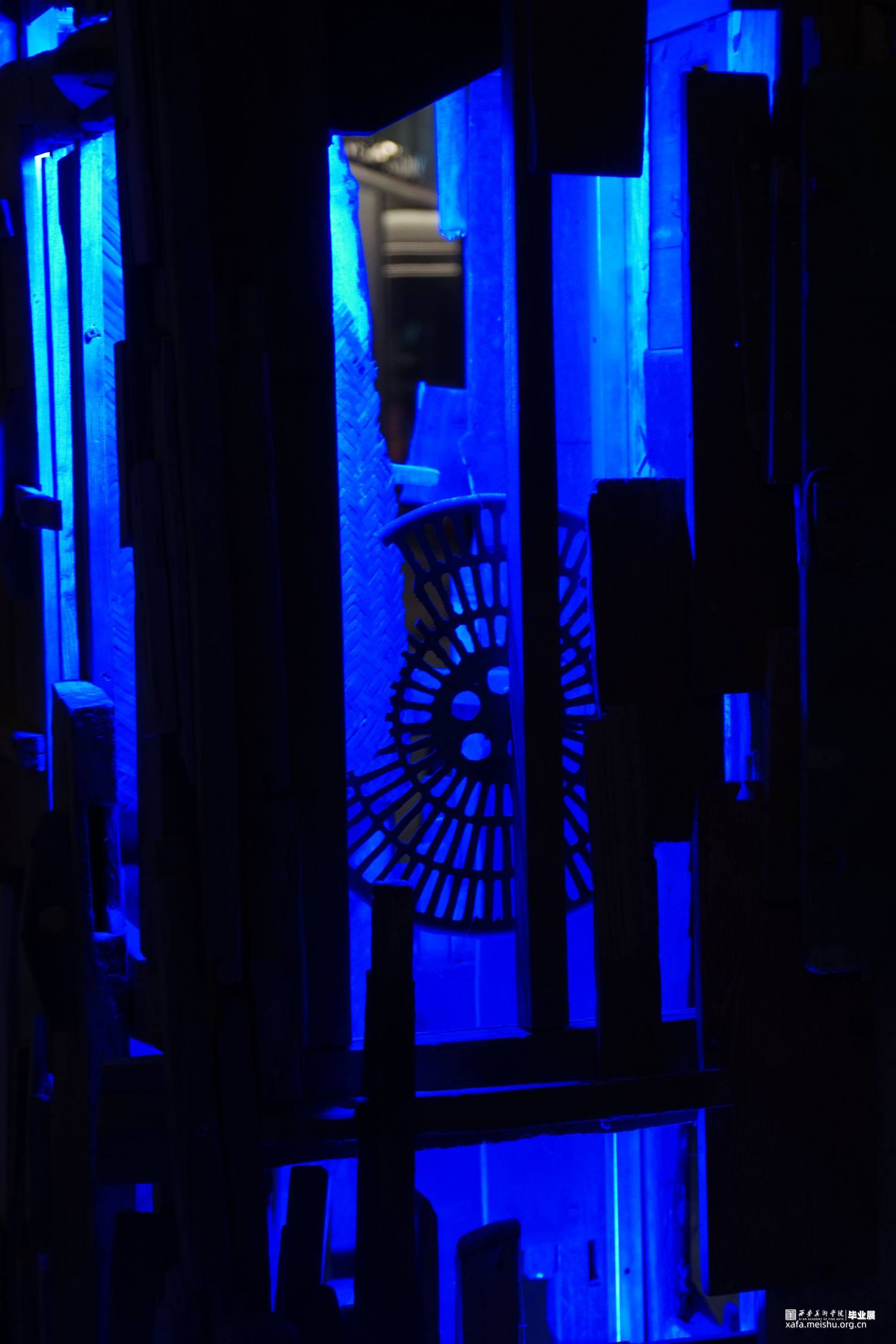 作品主要材料是从周边村子里收集到的过去具有功能性且有历史记忆的一些物件,将这些老物件拆解打破进行重新构造,作品主要形态为充满力量稳固并且富有生命力的柱子,用这些拆解成的器物碎片堆砌成能够连接过去时空与记忆的四根木柱,内部光使得所有碎片变得模糊。