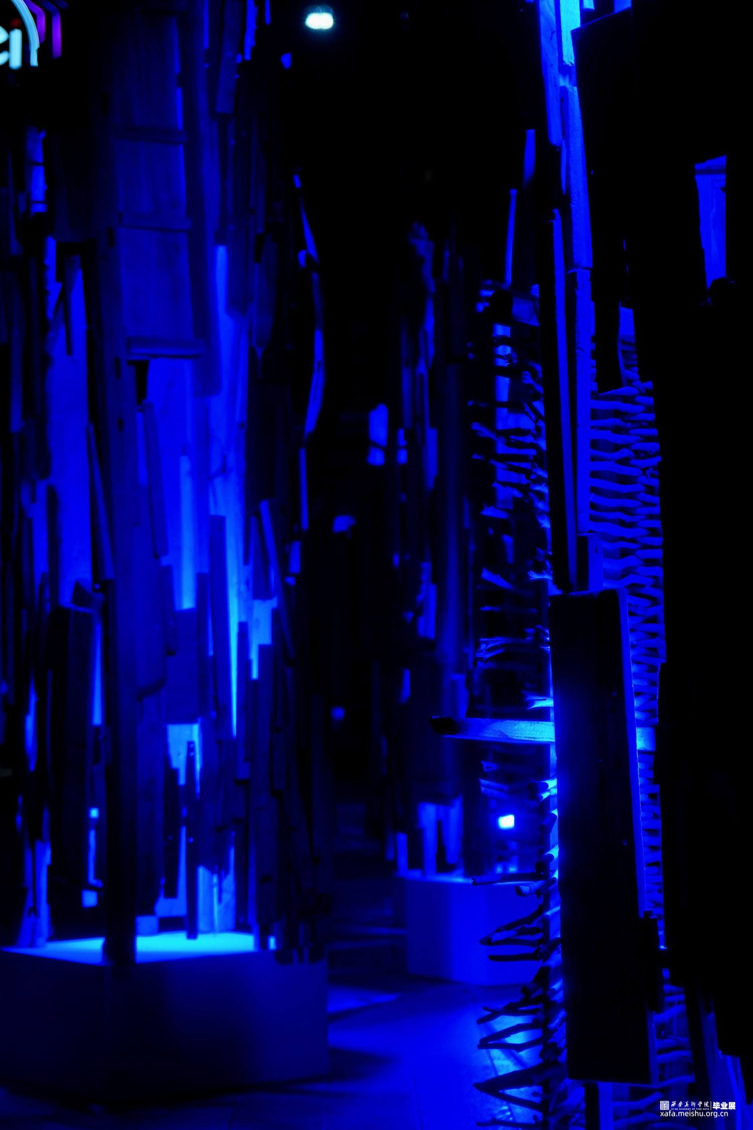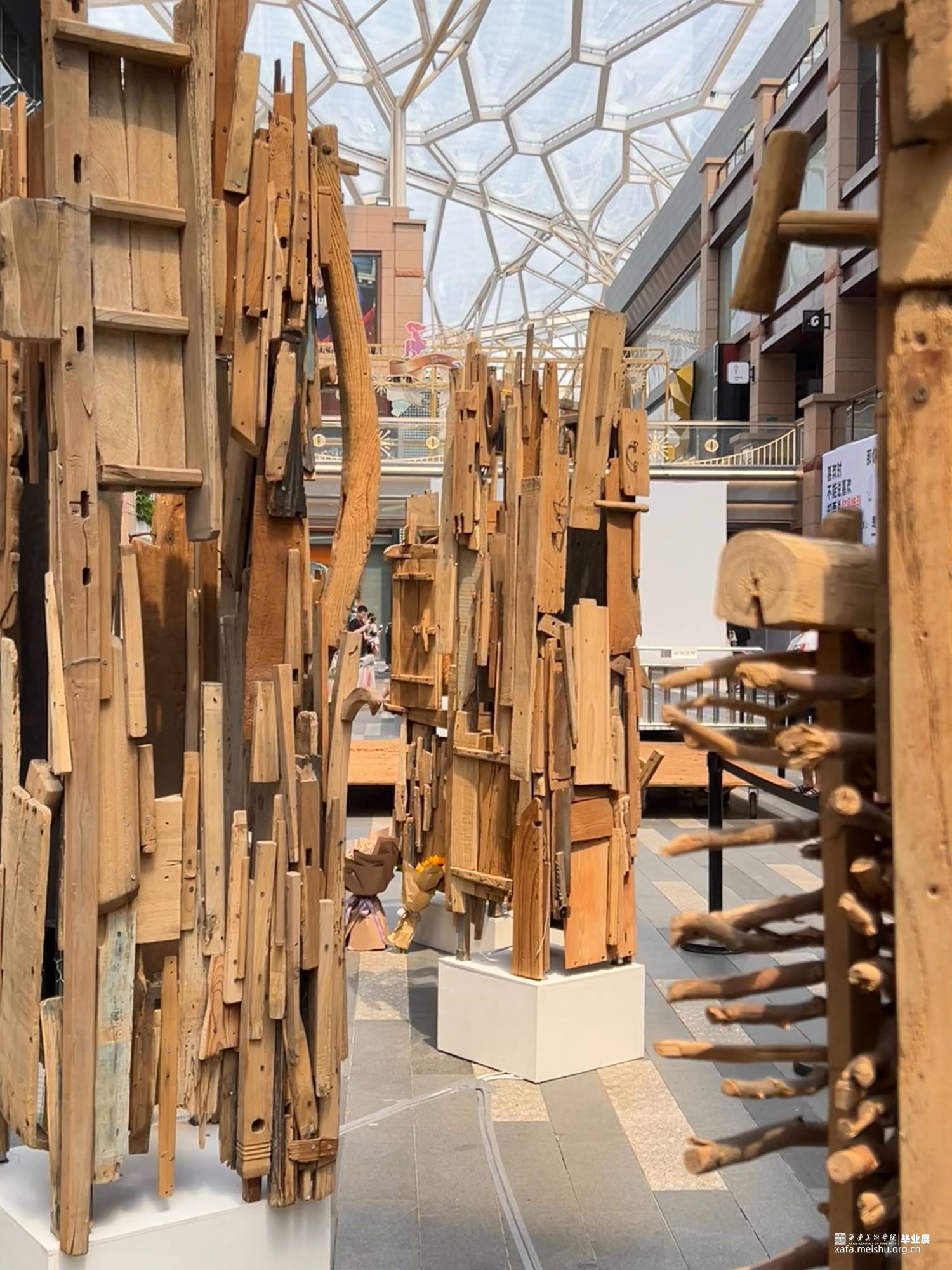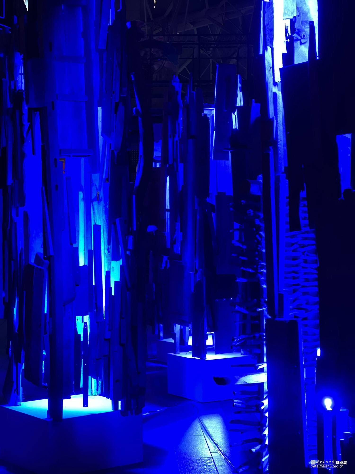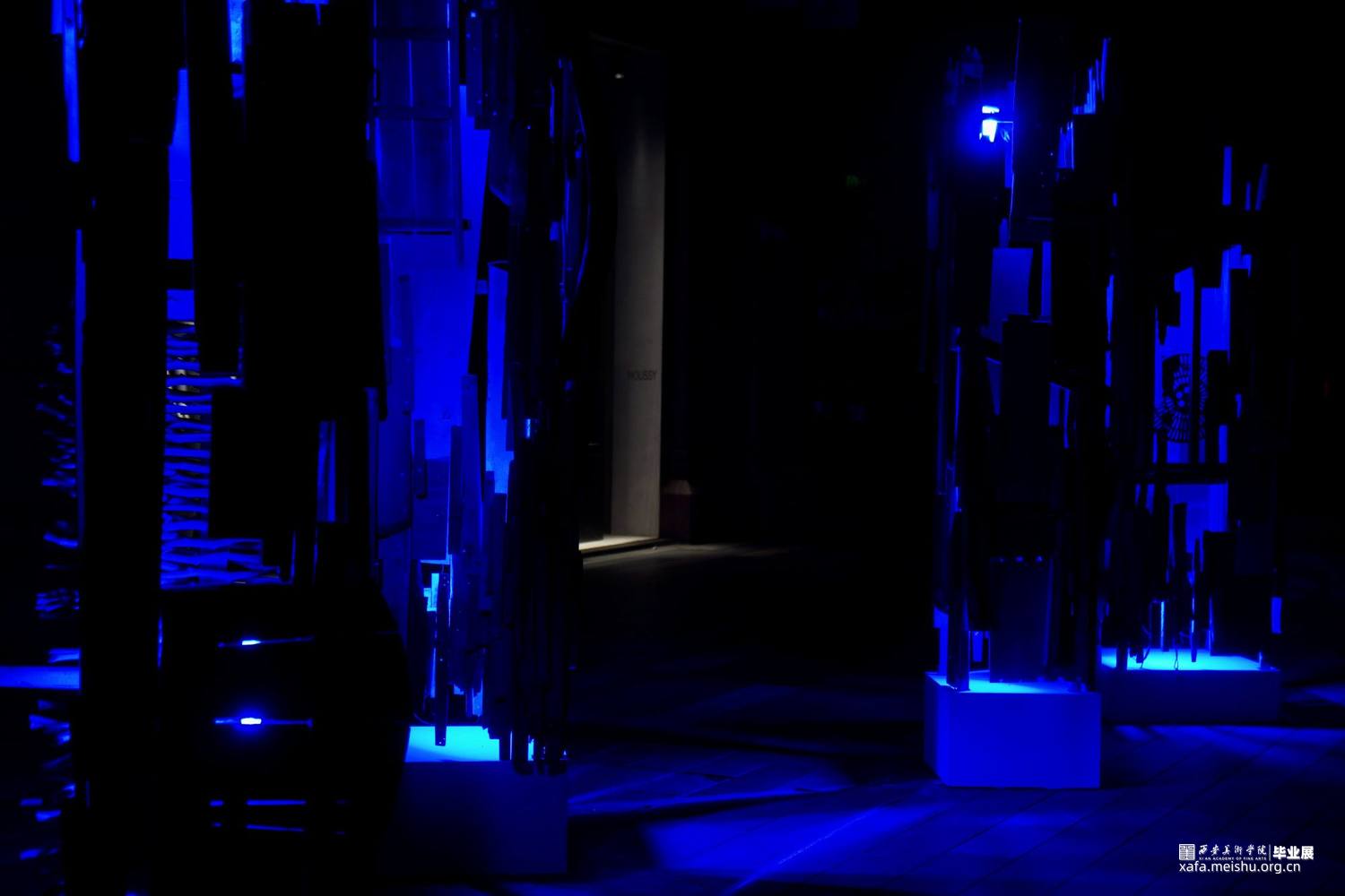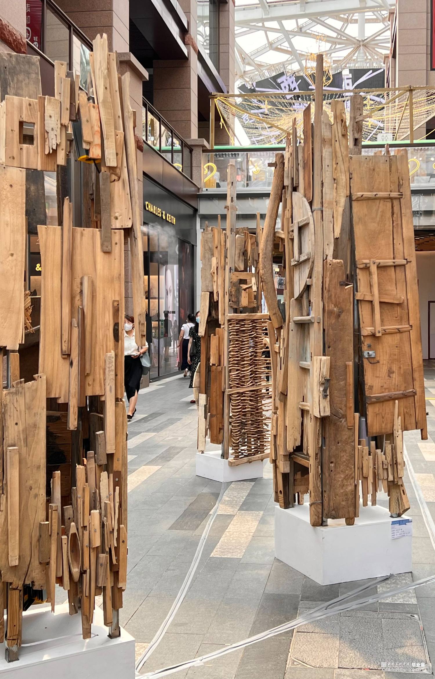 作品主要材料是从周边村子里收集到的过去具有功能性且有历史记忆的一些物件,将这些老物件拆解打破进行重新构造,作品主要形态为充满力量稳固并且富有生命力的柱子,用这些拆解成的器物碎片堆砌成能够连接过去时空与记忆的四根木柱,内部光使得所有碎片变得模糊。