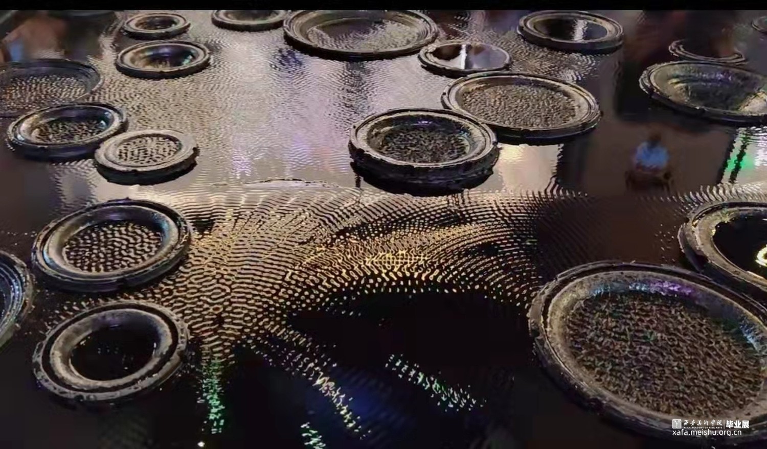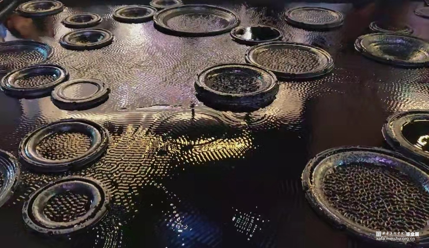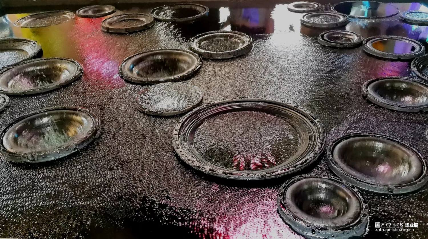 作品使用喇叭震动的原理使水产生裂开及波动的花纹,将水与电两者看似很危险的元素结合在一起,用黑色掩盖水面下的暗流涌动,却无可避免的互相之间产生碰撞与排斥反应,花纹相同却又互斥,和谐而又反常,当作品没有注水时,每一个喇叭都是单独的个体,当水漫过去后个体全都汇成了集体,大家各司其职共同展现整体的力量与美。正如当代的每个人一样,大家和谐而独特,相似却又反常,共同构成一曲“当代交响曲”。
