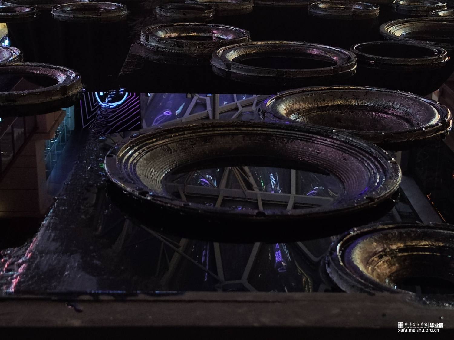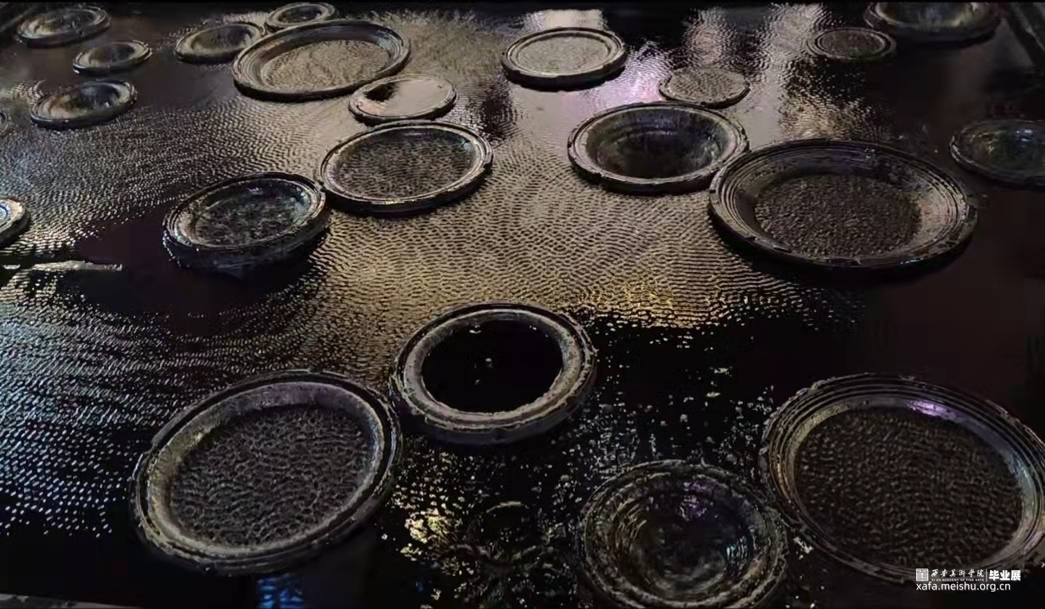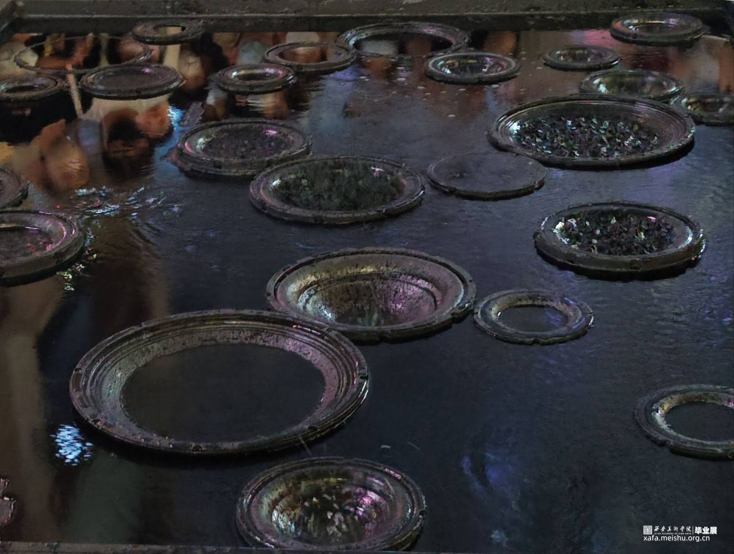 作品使用喇叭震动的原理使水产生裂开及波动的花纹,将水与电两者看似很危险的元素结合在一起,用黑色掩盖水面下的暗流涌动,却无可避免的互相之间产生碰撞与排斥反应,花纹相同却又互斥,和谐而又反常,当作品没有注水时,每一个喇叭都是单独的个体,当水漫过去后个体全都汇成了集体,大家各司其职共同展现整体的力量与美。正如当代的每个人一样,大家和谐而独特,相似却又反常,共同构成一曲“当代交响曲”。