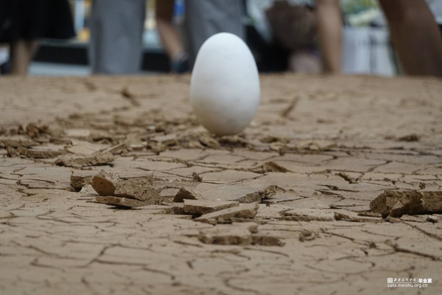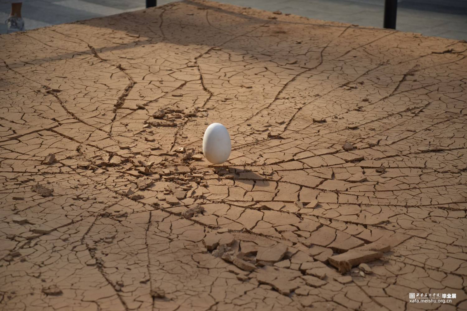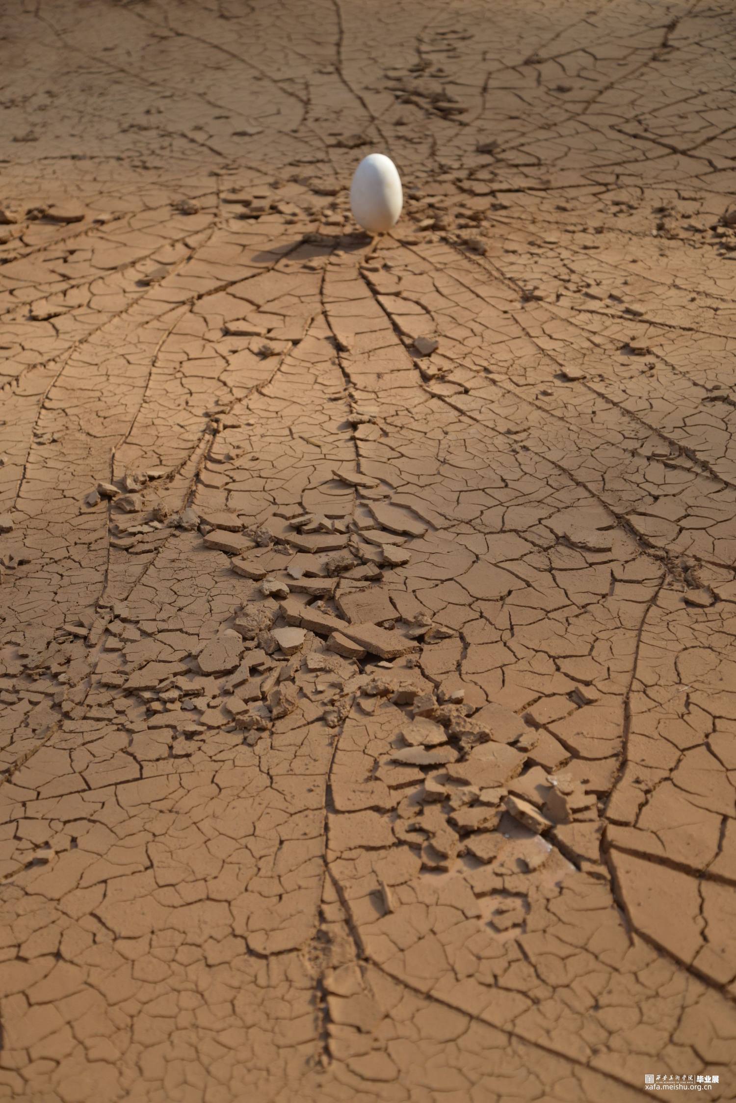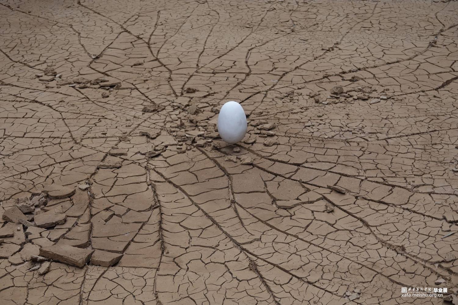蛋从稍高的地方坠落到地面就会破碎。而大地的坚硬也是相对的,地壳和蛋壳一样会破碎。人类时常感叹自己在自然面前是渺小而脆弱的,然而天上的星星也在明暗间转瞬即逝——承载自然的星球也同样是脆弱的。我们不知道,蛋壳上的裂痕是生命的诞生还是生命的破碎?当大地出现裂痕时,意味着旧事物的消亡还是新事物的崛起?我们不知道,一切是在演化的道路上还是在消亡的道路上。