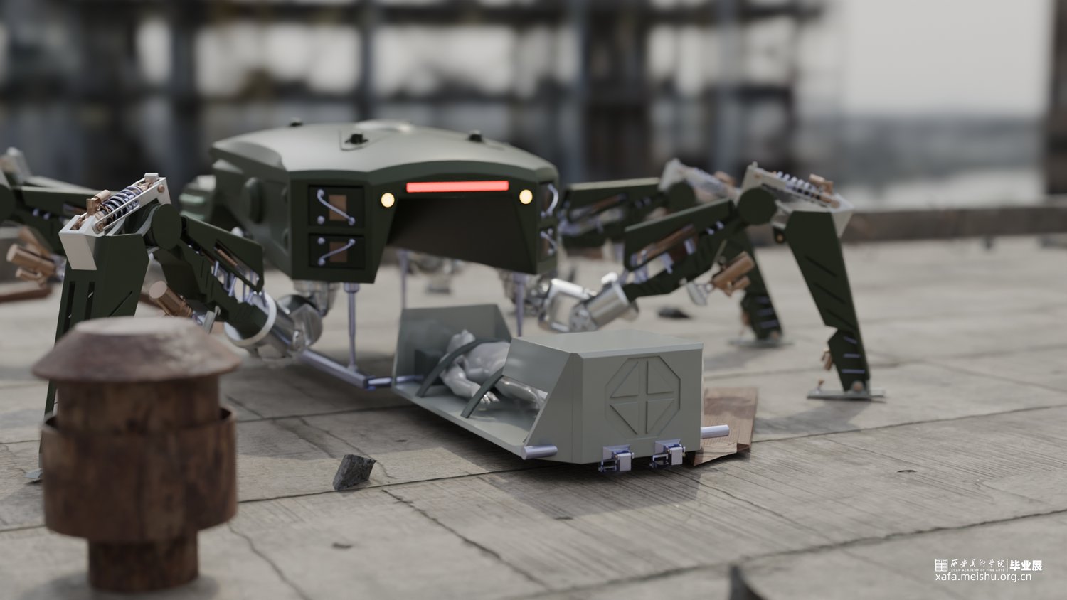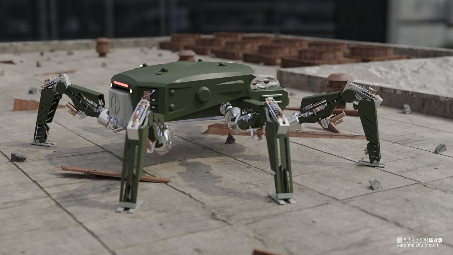 针对未来战场,面对不可预估的事情,发生任何不可变的事故,战士受伤问题如何解决,如何运输。如何救治,战地侦察下,在不缺少士兵的情况下,安全的侦察任务,以及火力压制,蜘蛛六足机器人的创造,大大减少士兵的伤亡程度,合理安排利用士兵,更好的完成任务。仿生设计下的六足机器人将会完成很多工作,通过性能大大提升,越野能力高于履带,轮式等结构的机器,大量的投入将会减少士兵的输出,减少人员的伤亡,更具有符合士兵作战的要求,适合各种环境,在任何环境下工作。