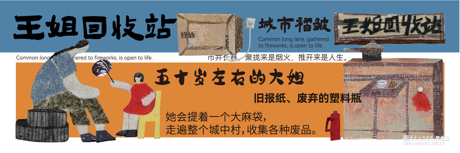 本次展览,以插画的形式,用幻觉与现实的交织,诠释着老西门和吉祥村这两个城中村的面貌与传奇。在那些拼贴的碎片之间,我们能够感知到当地人民对生活的无尽热情与虔诚。那是一种超越物质的力量,是一种与时光共舞的情感。它们构成了城中村的生命之歌,以一种神秘的符号语言,述说着城市边缘群体的痛与乐,渴望引起社会对城中村及其边缘群体更深层次的关注和反思。