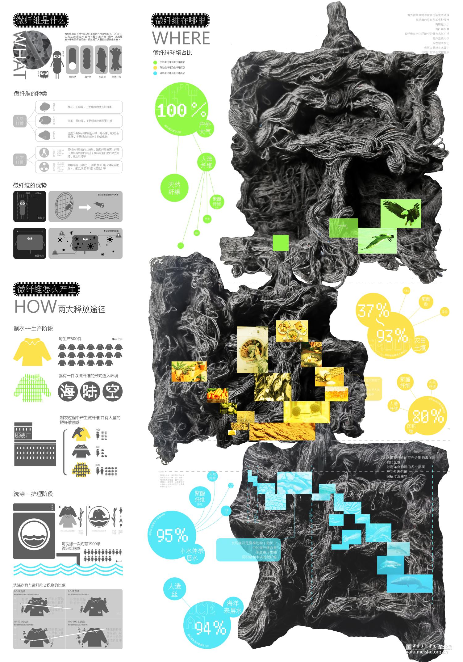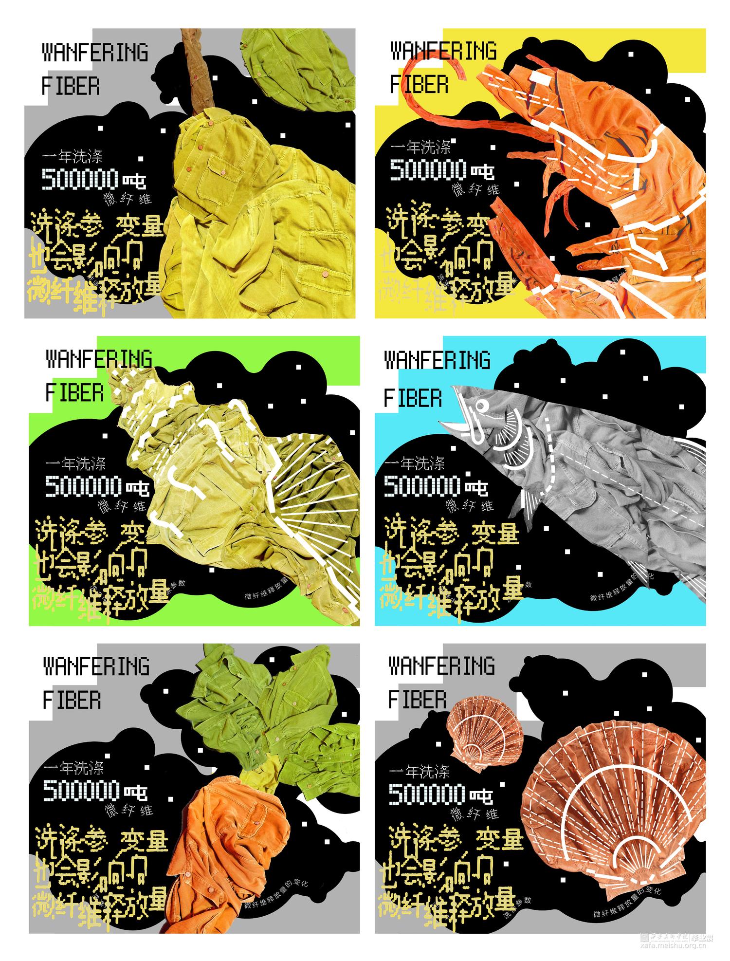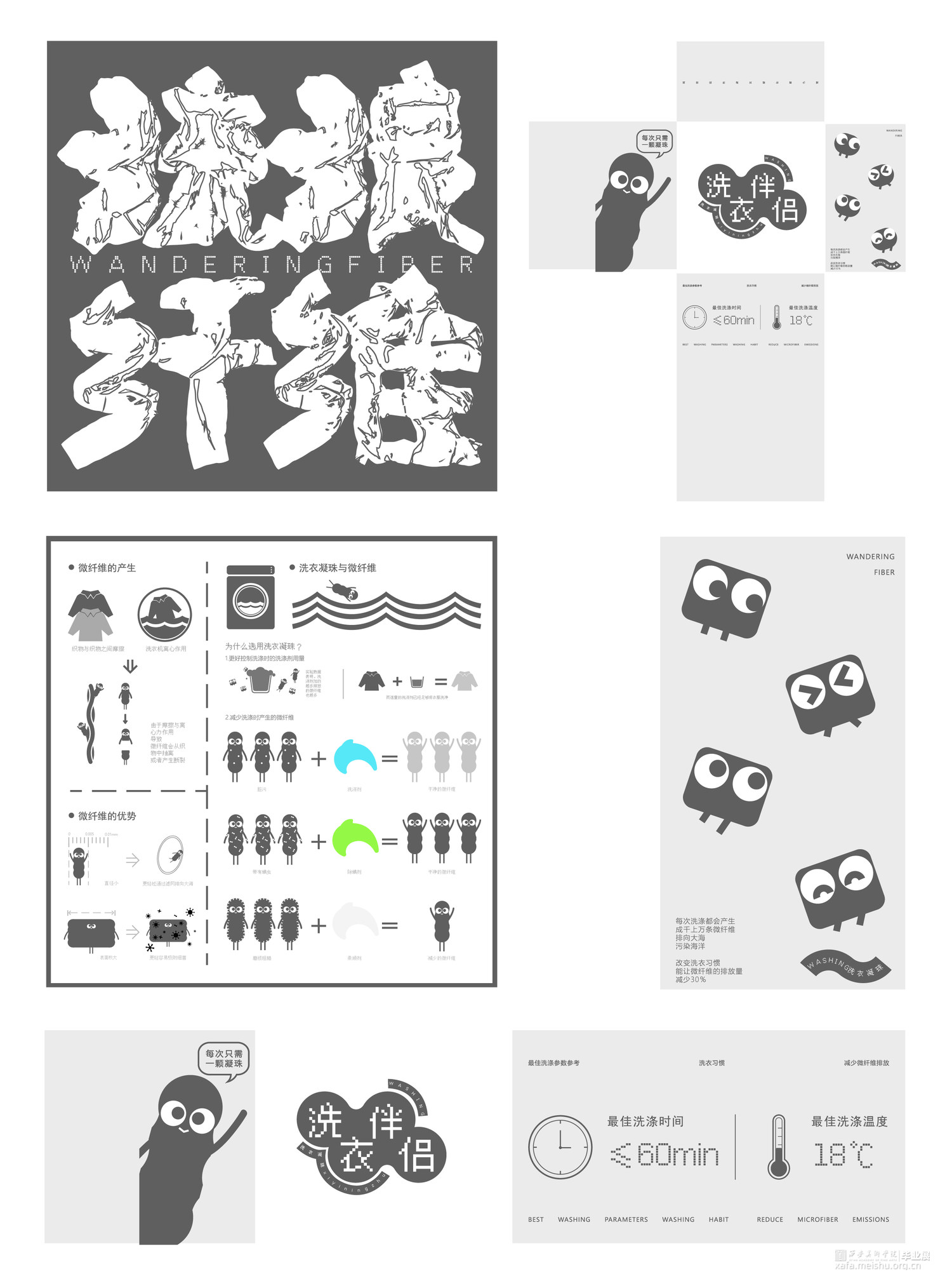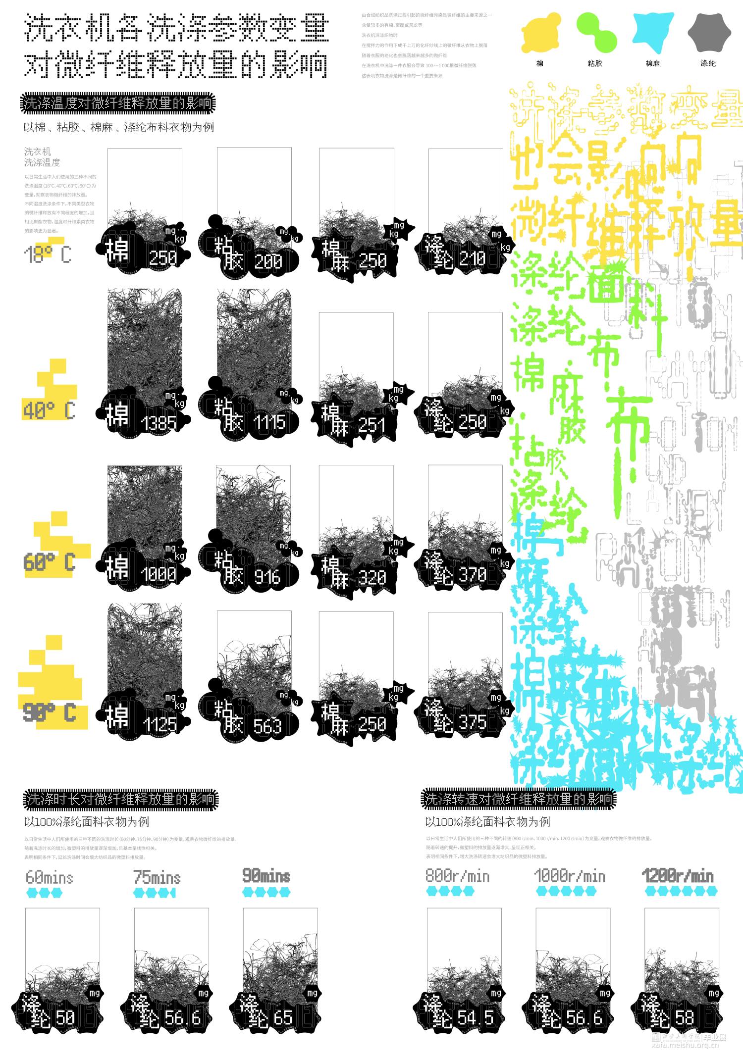 作品信息图形部分以微纤维的视角,进行微纤维污染的科普信息介绍。以科学的方法与趣味的语言,展示了微纤维的定义、来源、释放途径,并将洗衣机各洗涤参数变量对微纤维释放量的影响视觉化,通过实物样品展示与数据相结合的手法展现科普信息。海报设计部分使用材料质感语言,直观地阐释人类释放出的微纤维污染终究会通过食物链回到人类自身的道理,人类在环保意识淡漠的同时,终将自食恶果。品牌视觉衍生部分将被污染的农作物和海洋生物通过材质替换的手法表现,展示微纤维污染的广泛性和与人类关系的密切程度。最后通过趣味品牌IP形象与异形书的设计,生动有趣地体现微纤维一路走来的各段旅居地,讲述微纤维的流浪之旅。