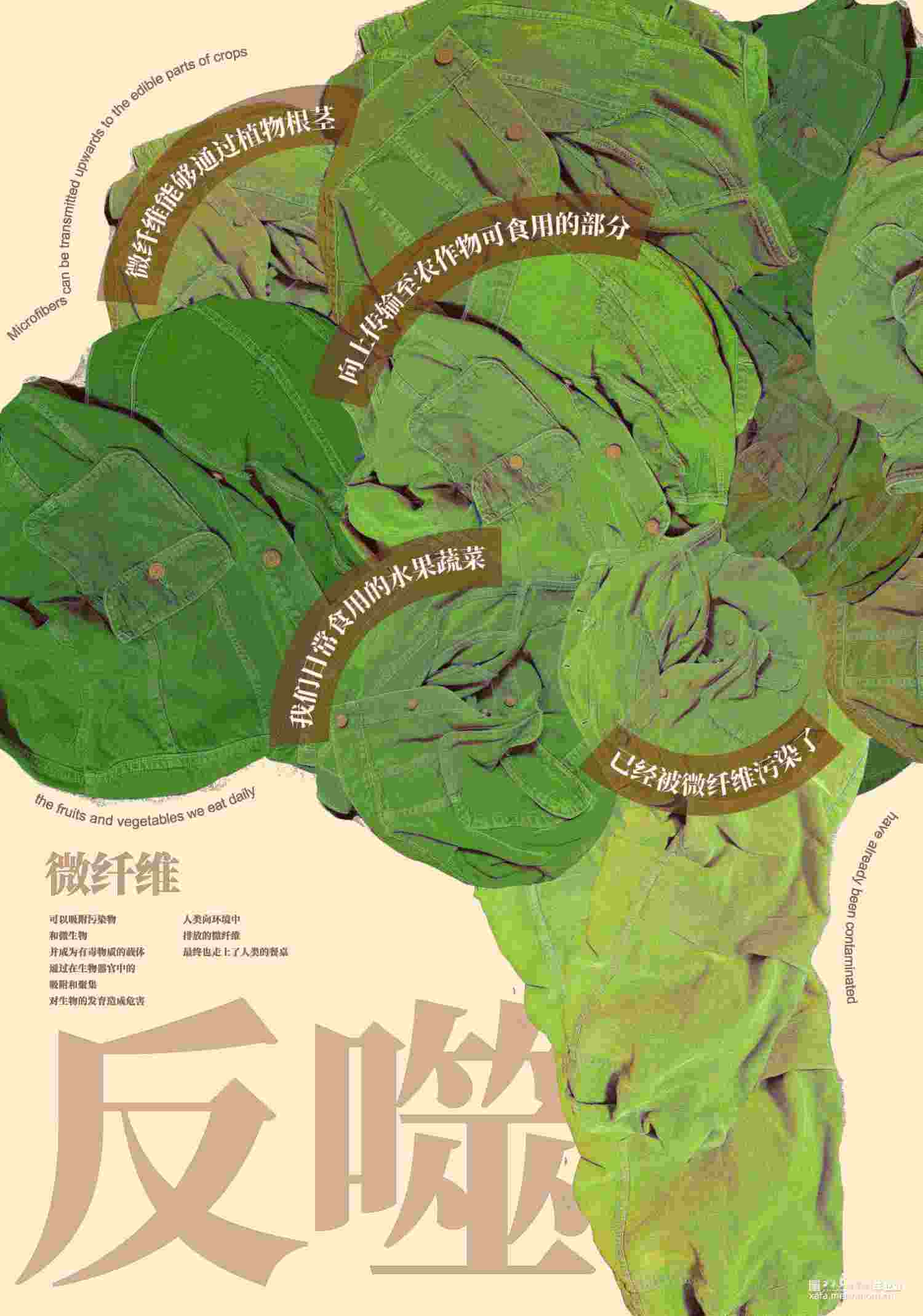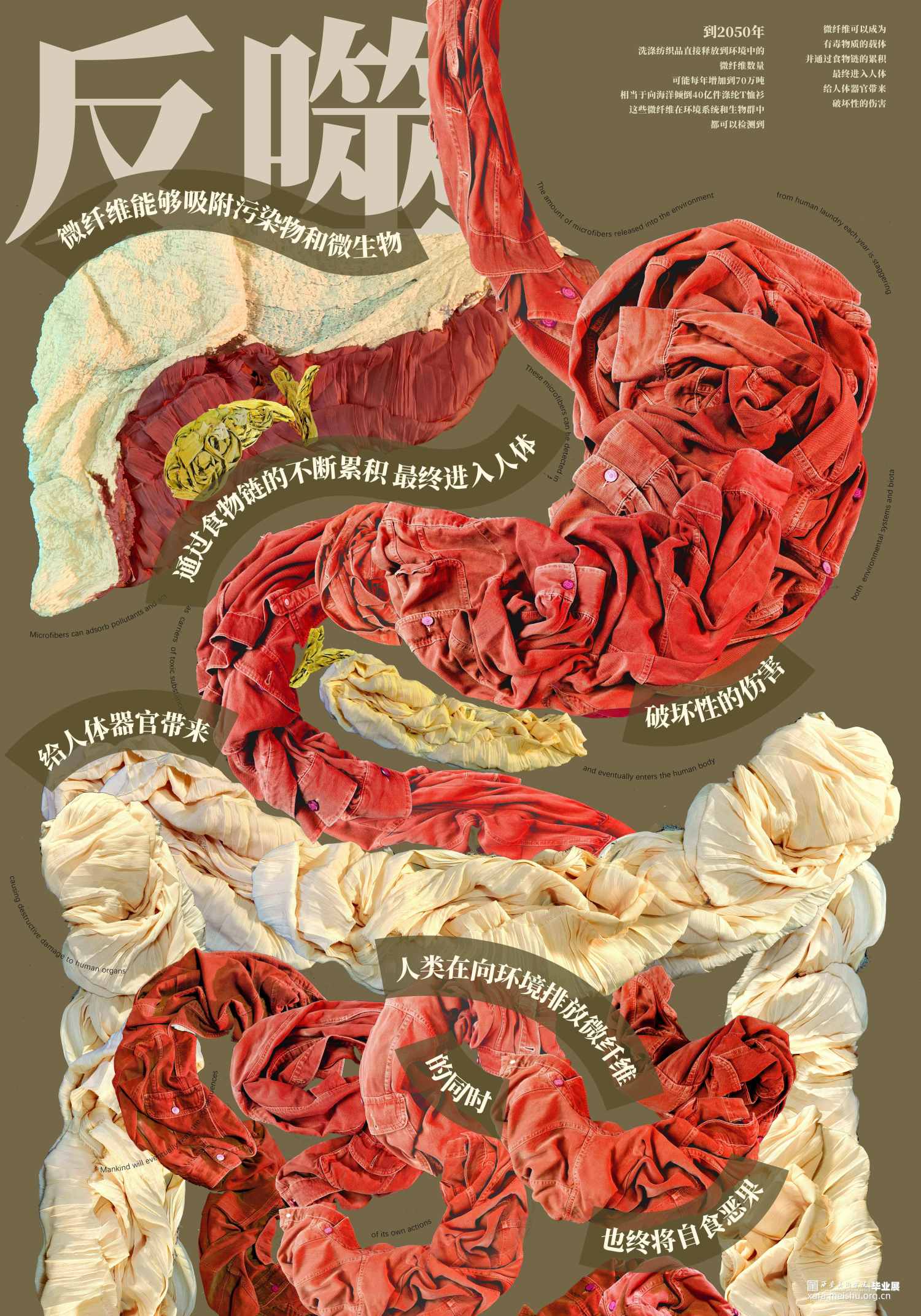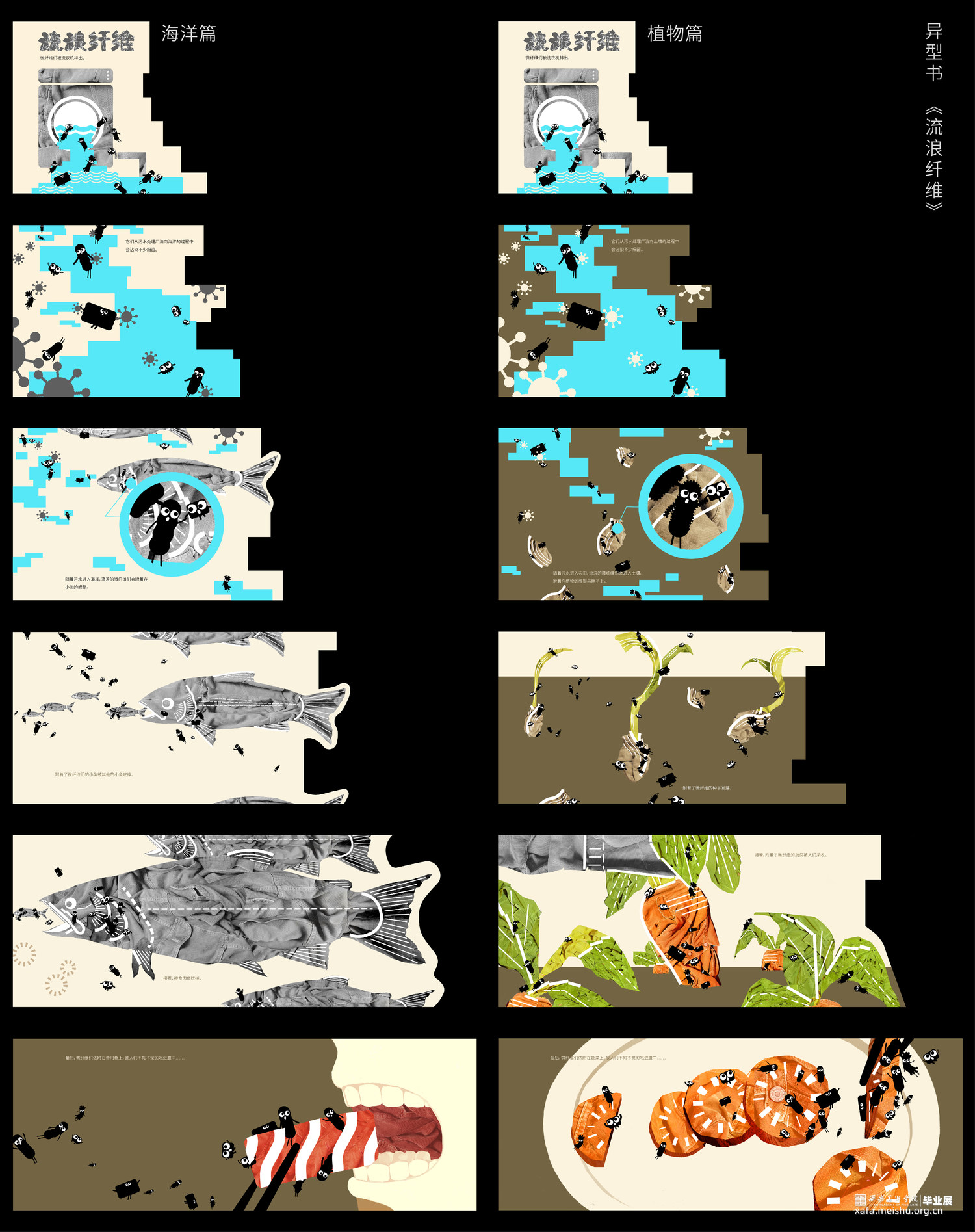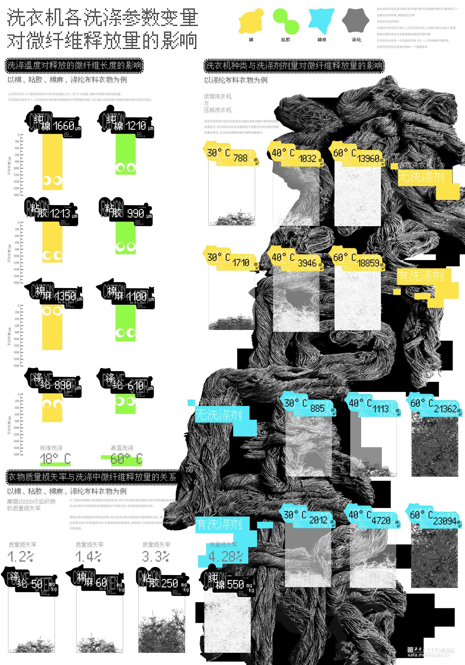 作品信息图形部分以微纤维的视角,进行微纤维污染的科普信息介绍。以科学的方法与趣味的语言,展示了微纤维的定义、来源、释放途径,并将洗衣机各洗涤参数变量对微纤维释放量的影响视觉化,通过实物样品展示与数据相结合的手法展现科普信息。海报设计部分使用材料质感语言,直观地阐释人类释放出的微纤维污染终究会通过食物链回到人类自身的道理,人类在环保意识淡漠的同时,终将自食恶果。品牌视觉衍生部分将被污染的农作物和海洋生物通过材质替换的手法表现,展示微纤维污染的广泛性和与人类关系的密切程度。最后通过趣味品牌IP形象与异形书的设计,生动有趣地体现微纤维一路走来的各段旅居地,讲述微纤维的流浪之旅。
