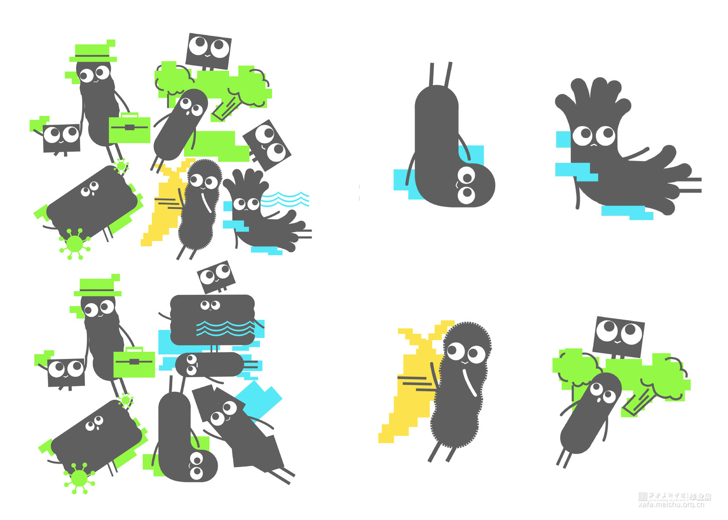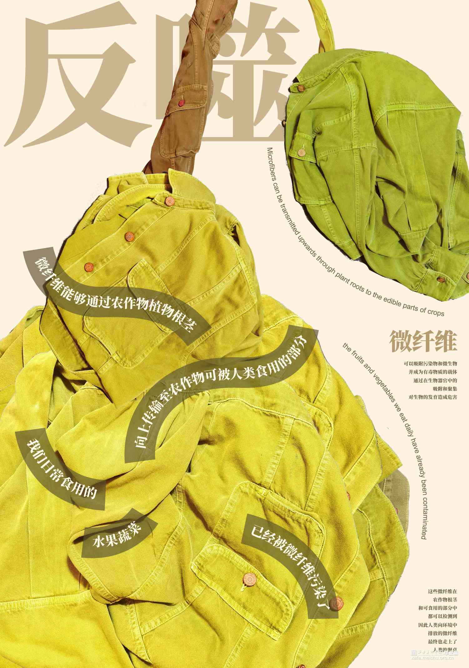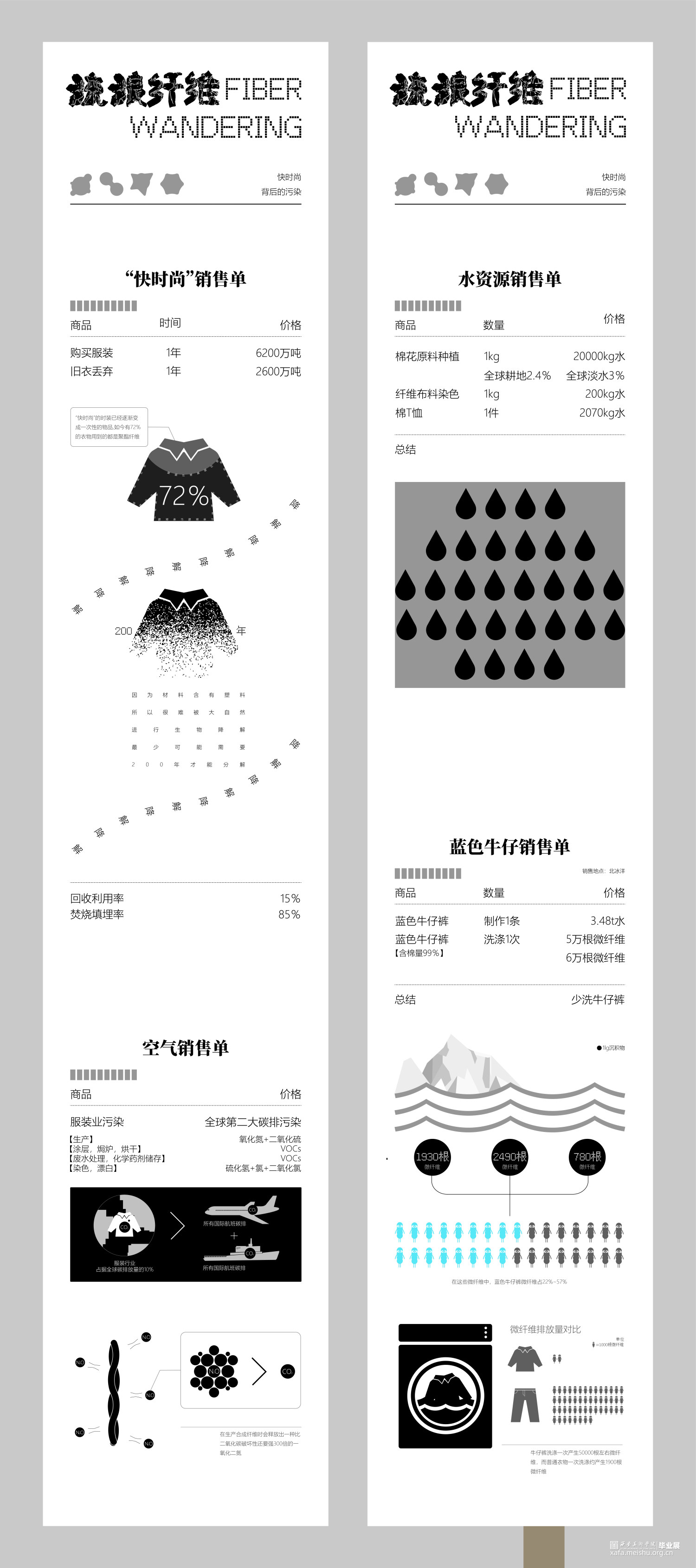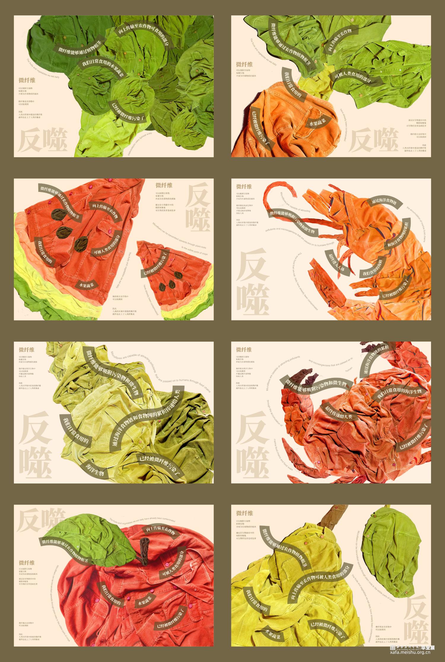 作品信息图形部分以微纤维的视角,进行微纤维污染的科普信息介绍。以科学的方法与趣味的语言,展示了微纤维的定义、来源、释放途径,并将洗衣机各洗涤参数变量对微纤维释放量的影响视觉化,通过实物样品展示与数据相结合的手法展现科普信息。海报设计部分使用材料质感语言,直观地阐释人类释放出的微纤维污染终究会通过食物链回到人类自身的道理,人类在环保意识淡漠的同时,终将自食恶果。品牌视觉衍生部分将被污染的农作物和海洋生物通过材质替换的手法表现,展示微纤维污染的广泛性和与人类关系的密切程度。最后通过趣味品牌IP形象与异形书的设计,生动有趣地体现微纤维一路走来的各段旅居地,讲述微纤维的流浪之旅。
