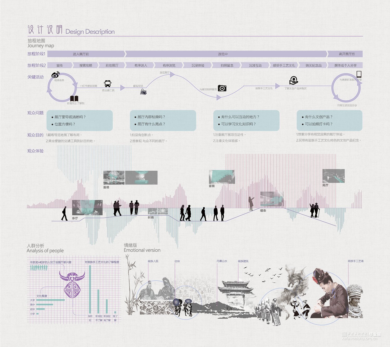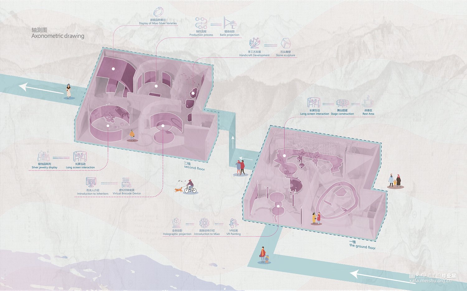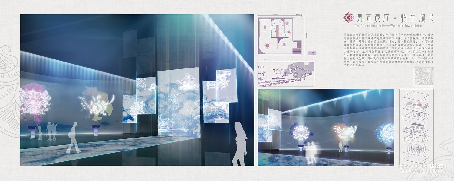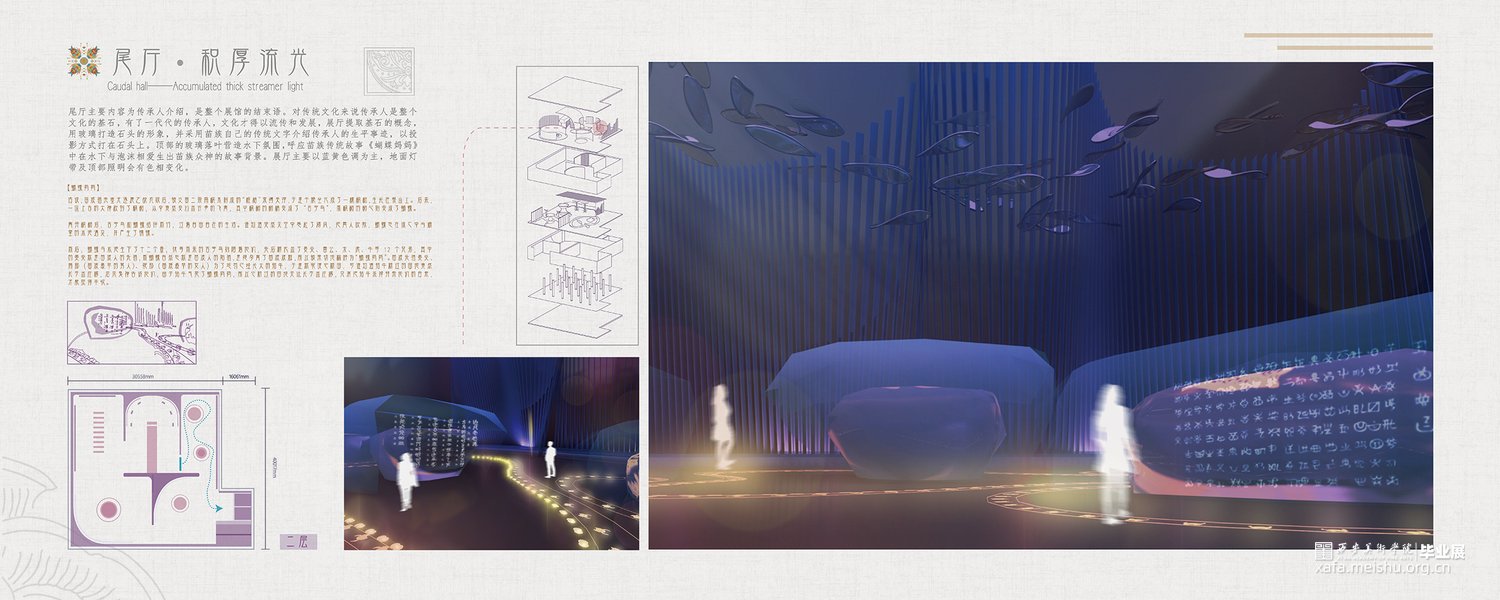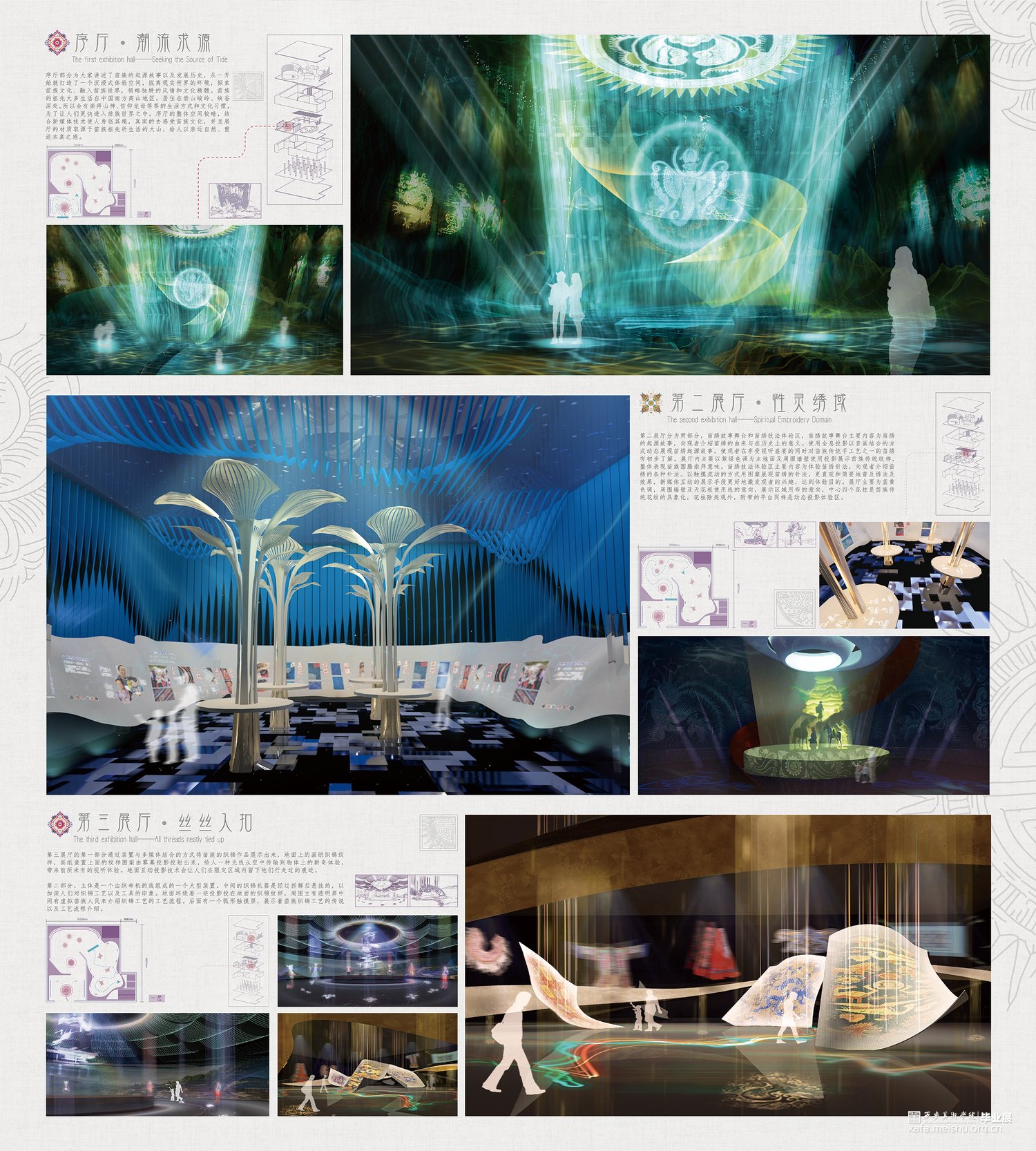 苗族非遗文化逐渐被人们所忘记,我们要重新唤起人们对苗族传统手工艺的认识,减少枯燥的知识科普,革新展示方式,将元素结合到空间造型,以感官刺激让观者和展示内容建立联系。线上线下展示体验的相互结合,顺应互联网+时代的发展,推动创新型空间的搭建。推翻以往的展厅陈列方式,运用新媒体技术打造沉浸式的主题空间,让观众全身心投入其中。通过使用装置结合新媒体的形式,系统梳理传统文化资源,让陈列在广阔大地上的苗族传统文化遗产、书写在古籍里的文字都活起来。把苗族手工艺文化中不同类型的手工艺都通过不同审美风格和元素反映出来。利用视觉、传统元素科技手段增加观者体验感的同时让观者更深刻的理解到苗族传统手工艺文化,从而对中国少数民族传统文化的发展和传承引起兴趣,引发思考。
