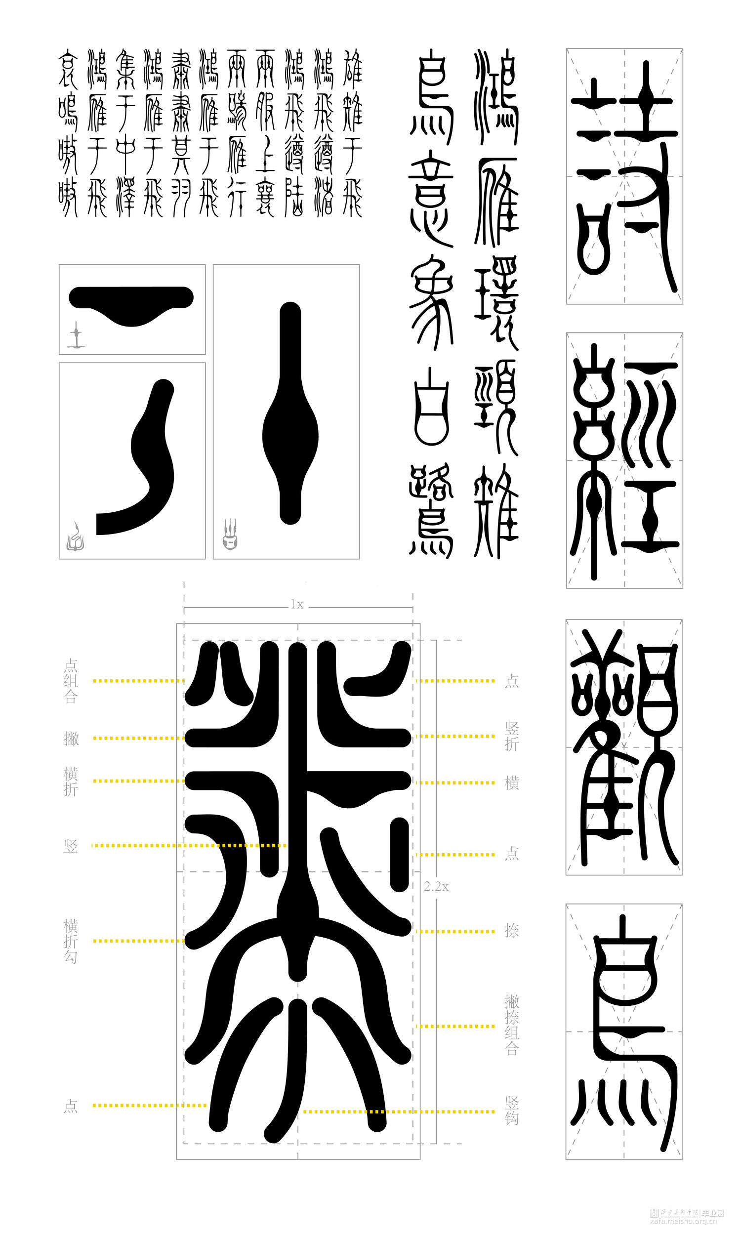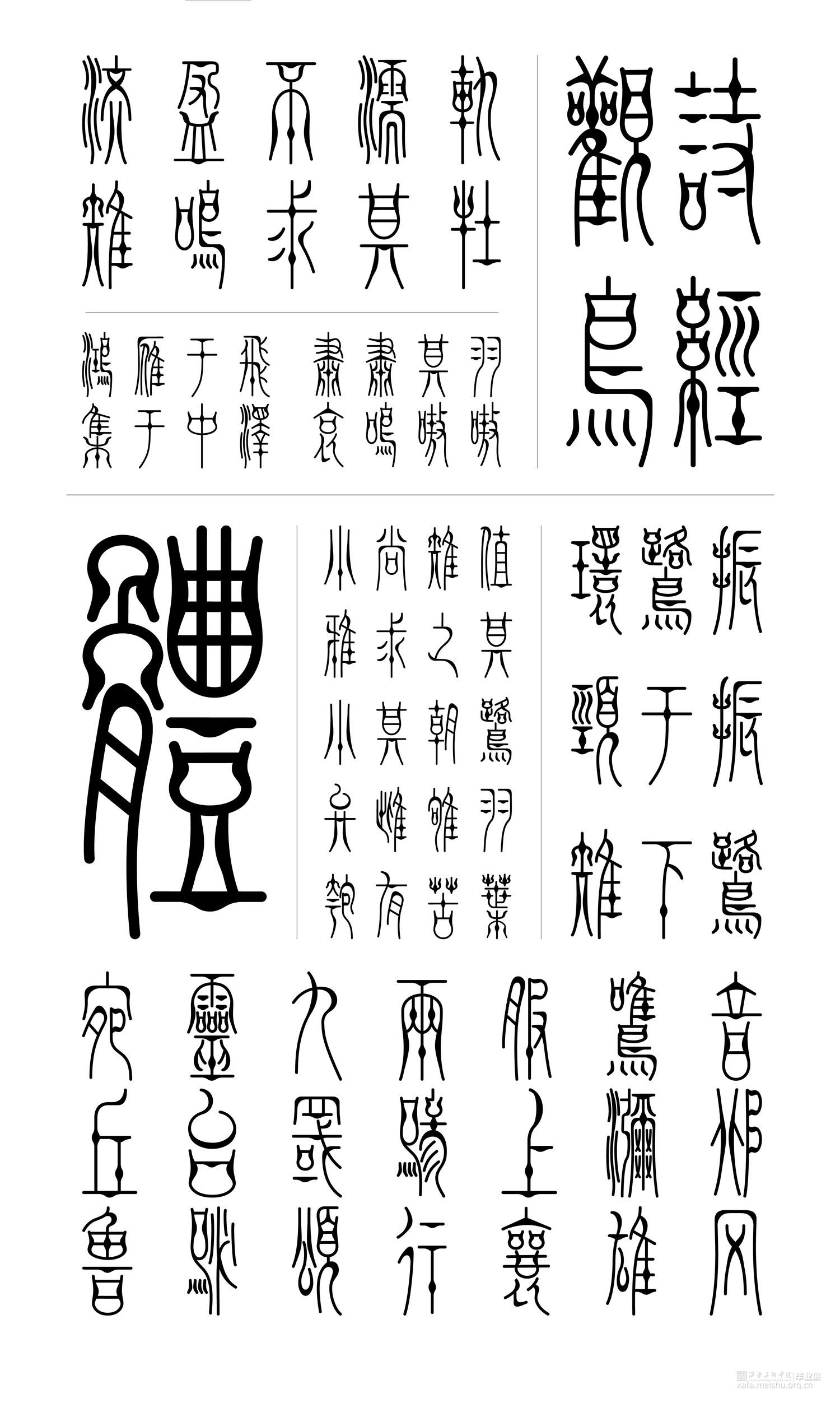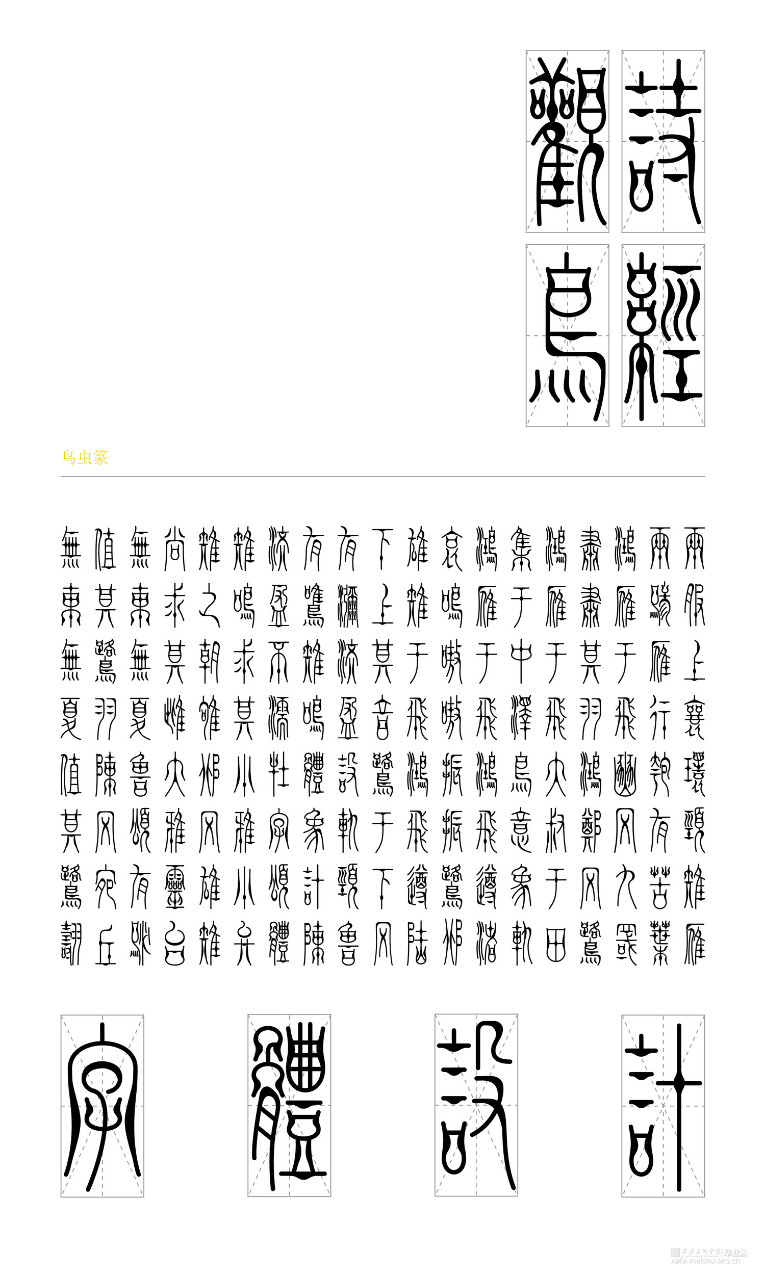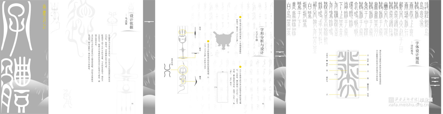 通过对青铜器王子午鼎铭文“鸟虫篆”的字体框架以及笔画特征的分析,以“诗经观鸟”等系列文字为内容展开设计研究,最终实现字体的文化性与美观性,设计性与辨识度的协调统一,设计出富有诗经特质与文化内涵的字体。