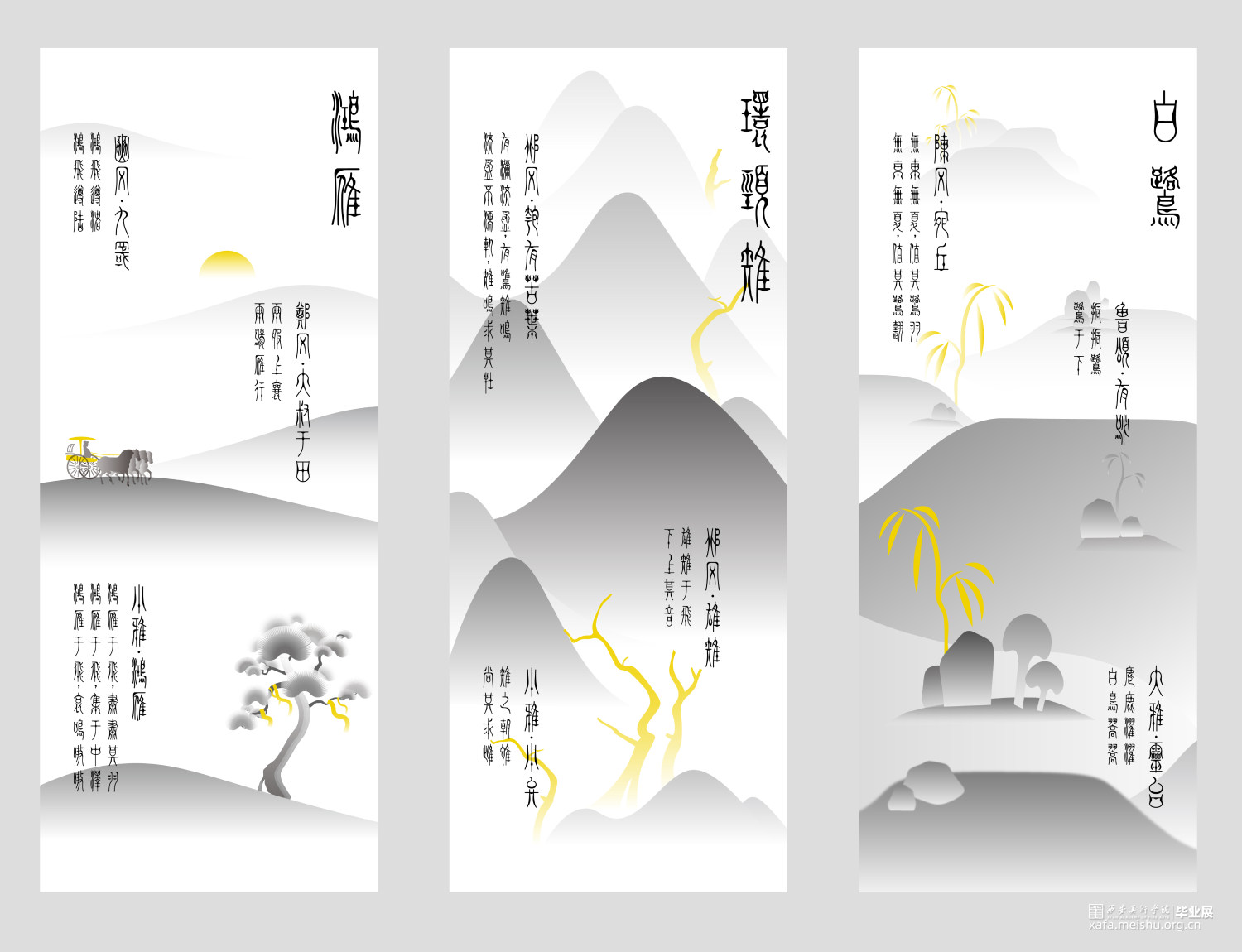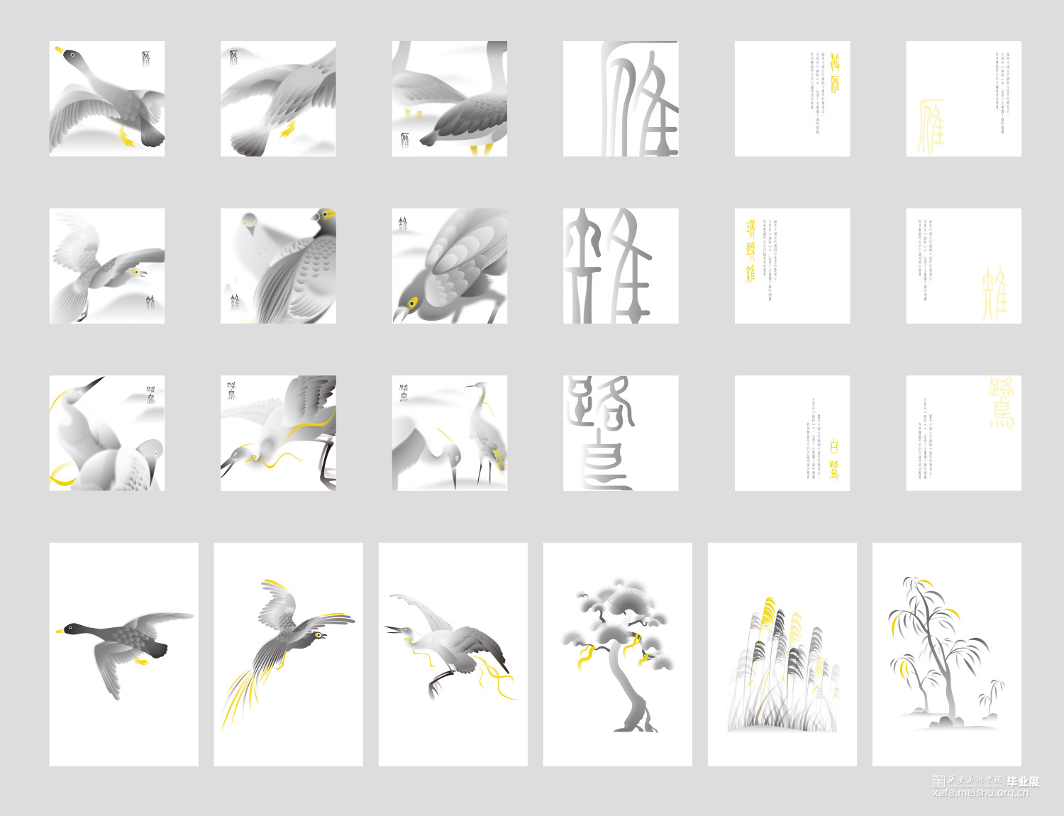 通过对“雁”“雉”“鹭”三种鸟类的特征分析与文化研究,以精炼概括的设计语言,细腻丰富的插图形式,设计出了一套兼具时代特征与意象韵味的图形。鸟意象的主图形细腻丰富,辅助图形的山脉草木概括简约。插图在符合现代审美的同时,又能够表现出东方美学意境的新中式风格。