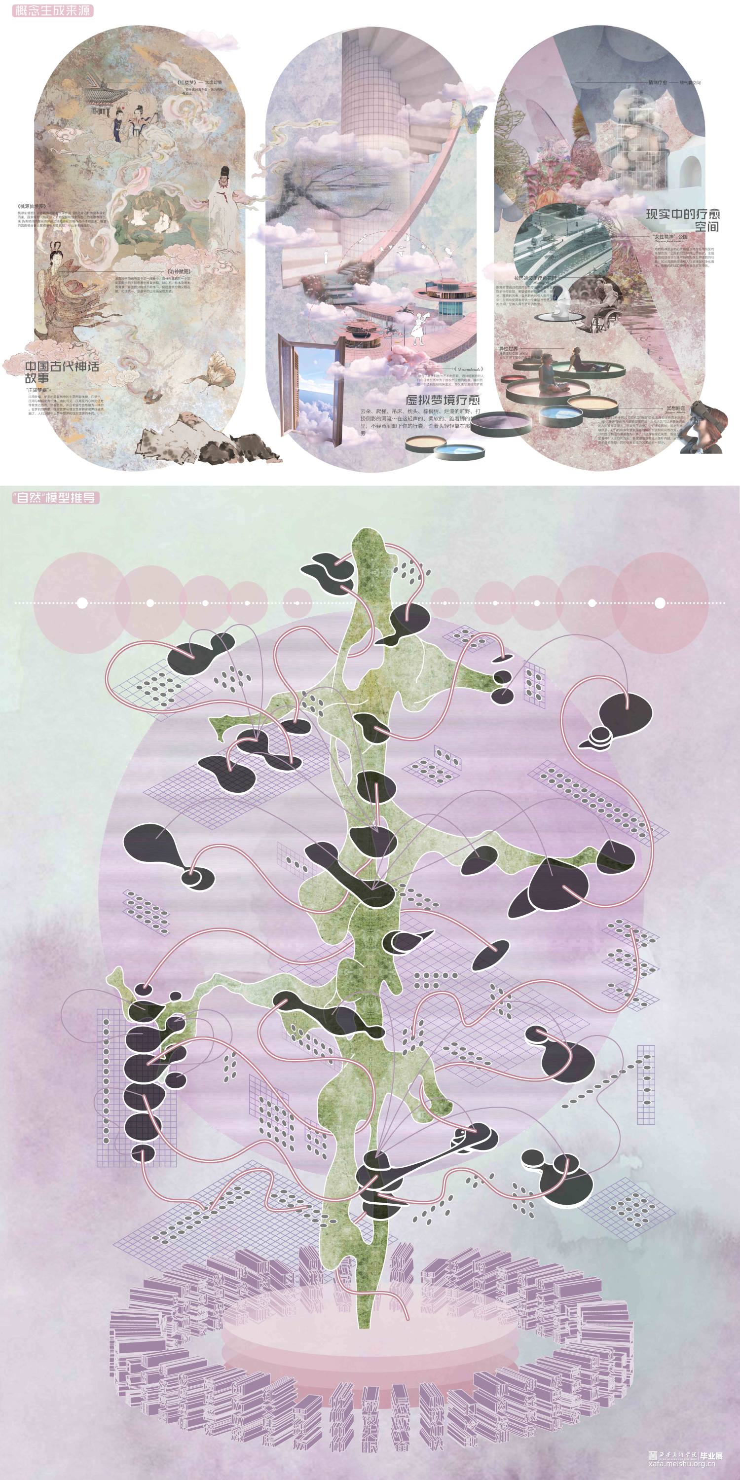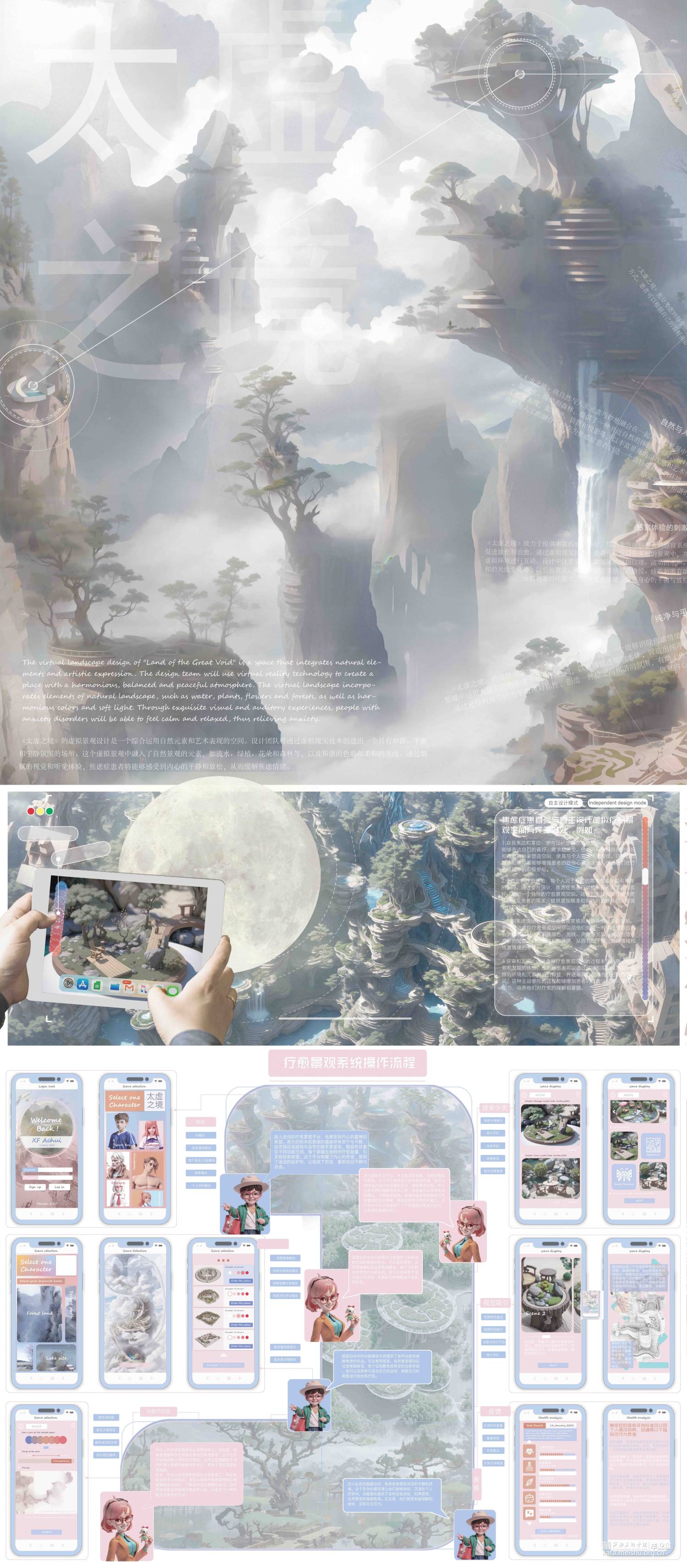 我们试图进行同构设计一系列空间,搭建一个基于元宇宙发展下的虚拟疗愈平台,结合一系列前人经验与医学研究数据,创造一个可以治愈亚健康病症的虚拟疗愈景观。通过装置与VR操作互动,人们在景观中亲近自然探寻自然,找回专属于自己的世界,以达到补充现实的精神需求,并使其在某种程度上消减人们的精神压力。