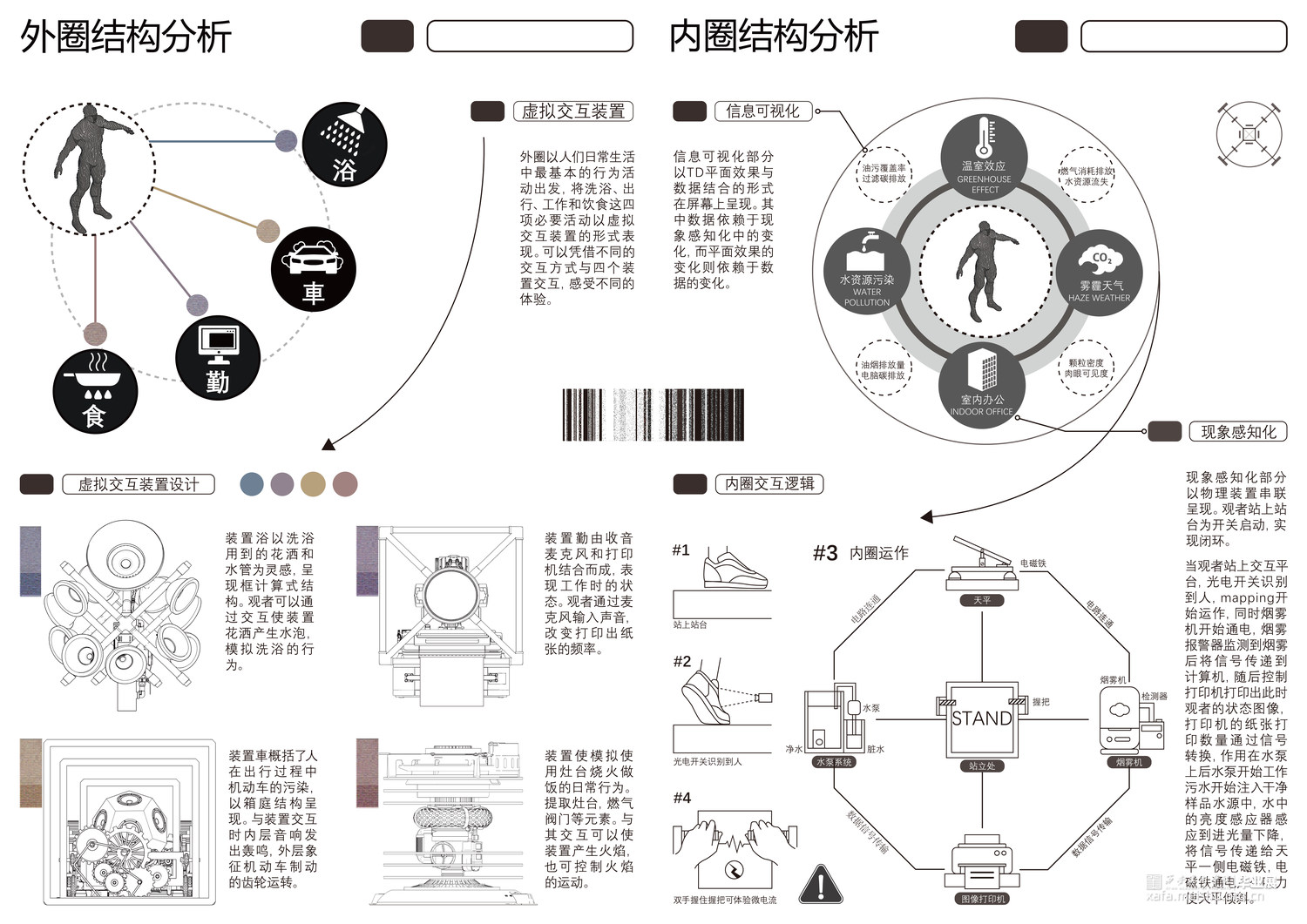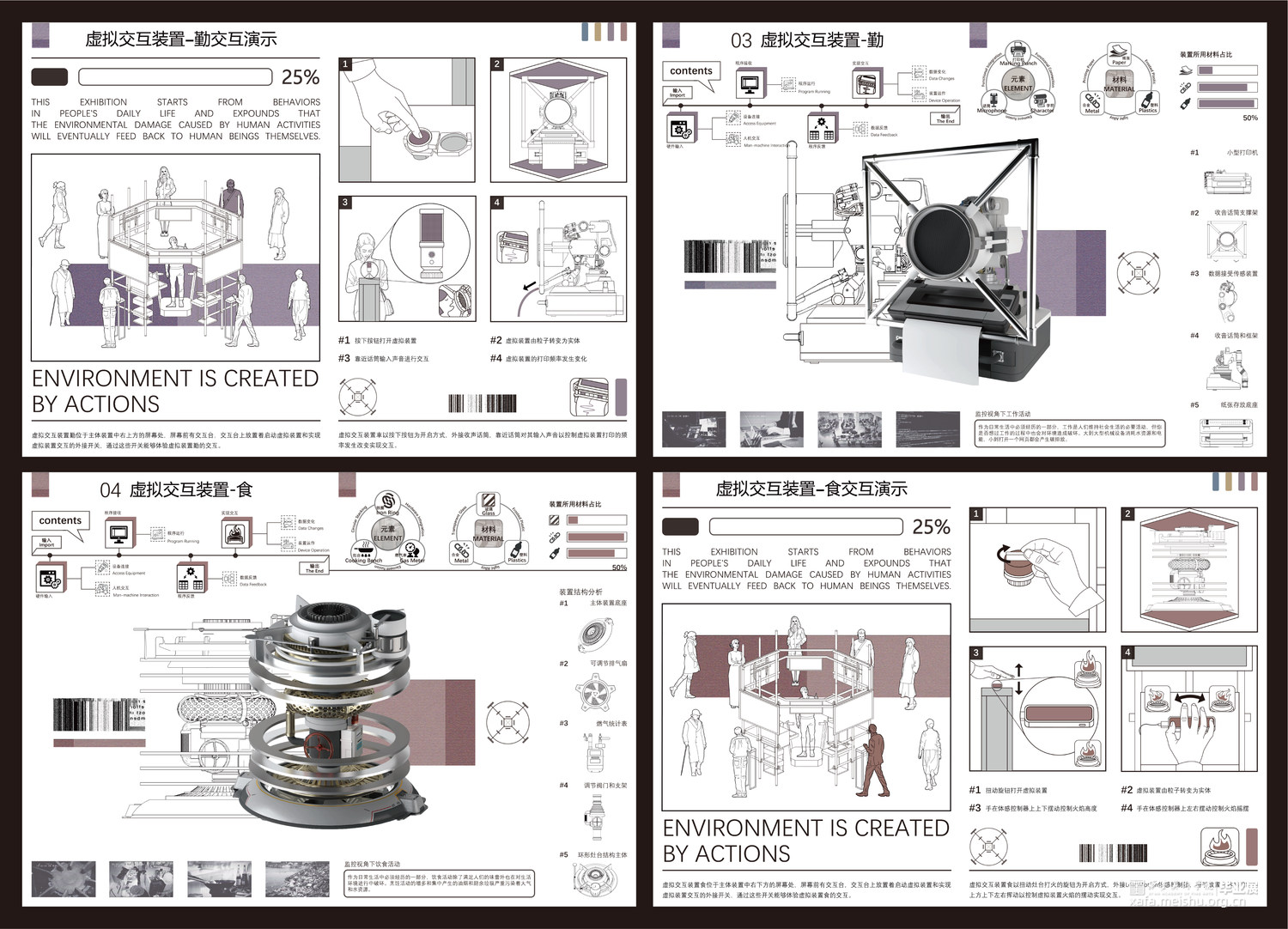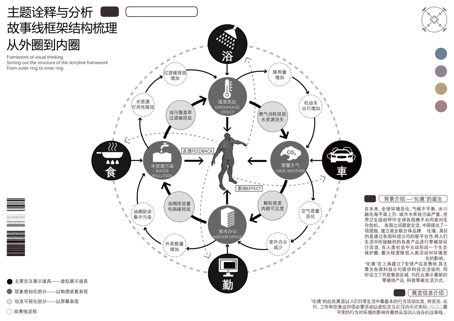 此次展览由“化境”品牌主导,以人们日常生活中最基本的行为活动出发,将洗浴、出行、工作和饮食这四项必要活动以虚拟交互装置的形式表现,串联出最平常的行为对环境的影响并最终反馈回人自身的故事线。