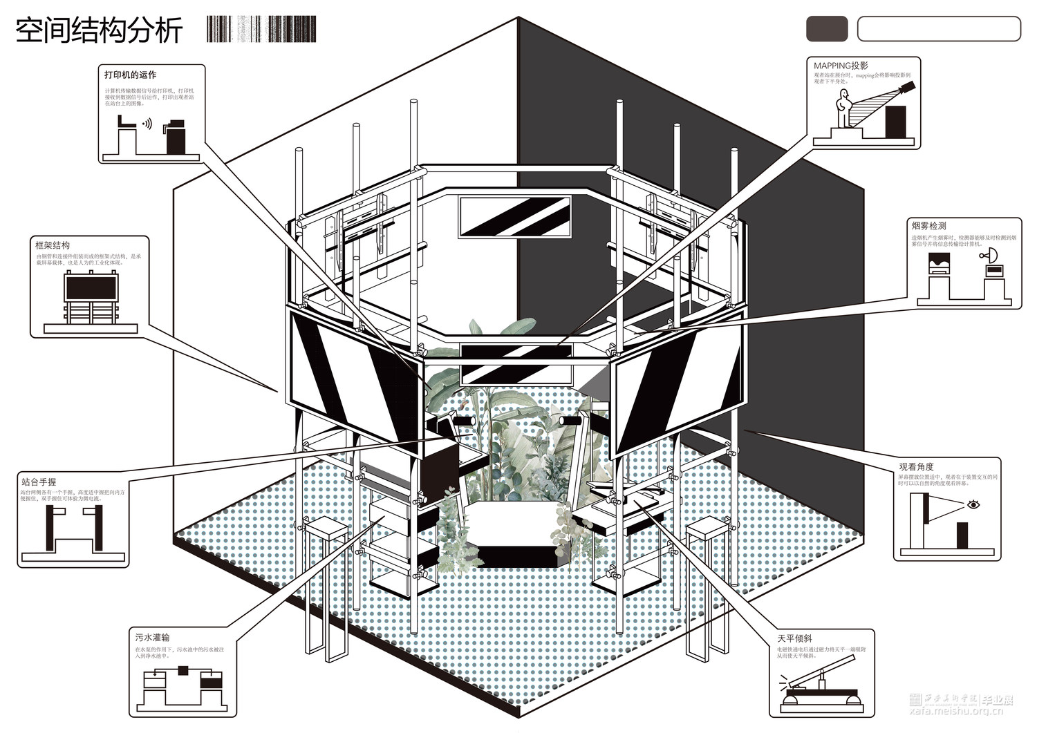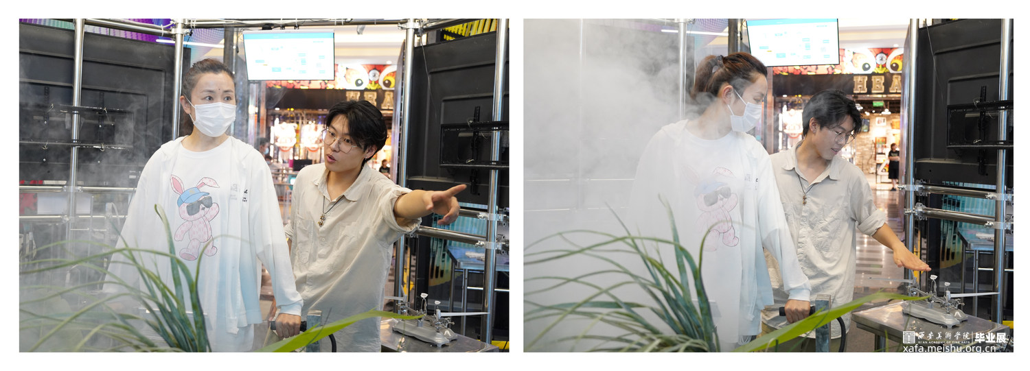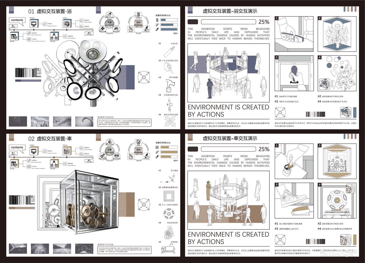 此次展览由“化境”品牌主导,以人们日常生活中最基本的行为活动出发,将洗浴、出行、工作和饮食这四项必要活动以虚拟交互装置的形式表现,串联出最平常的行为对环境的影响并最终反馈回人自身的故事线。