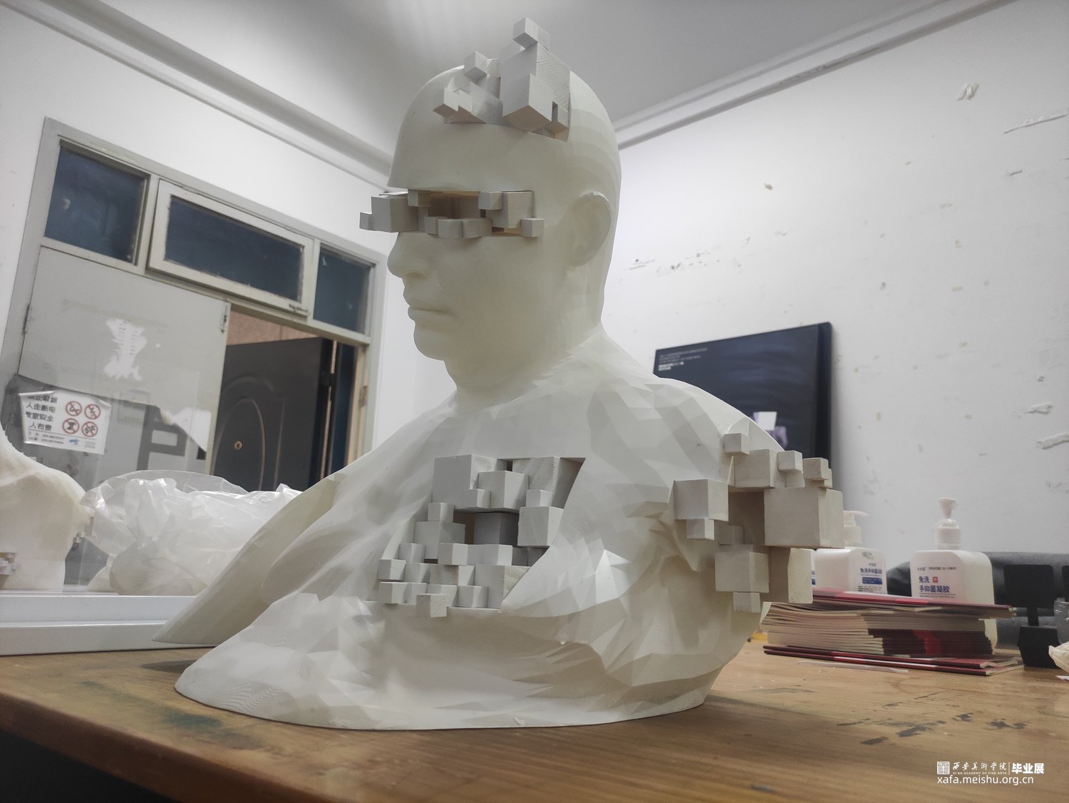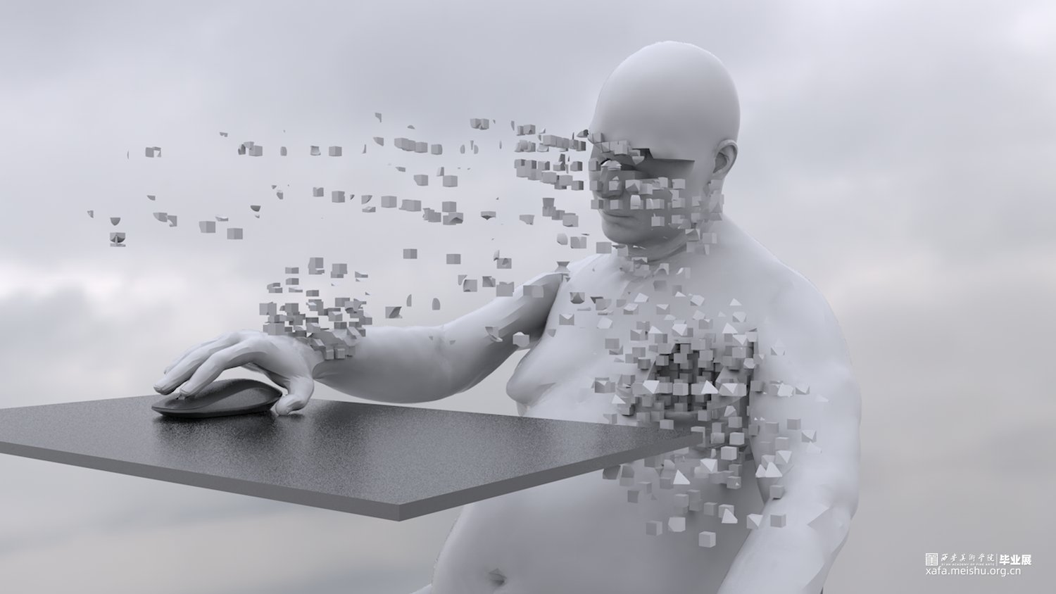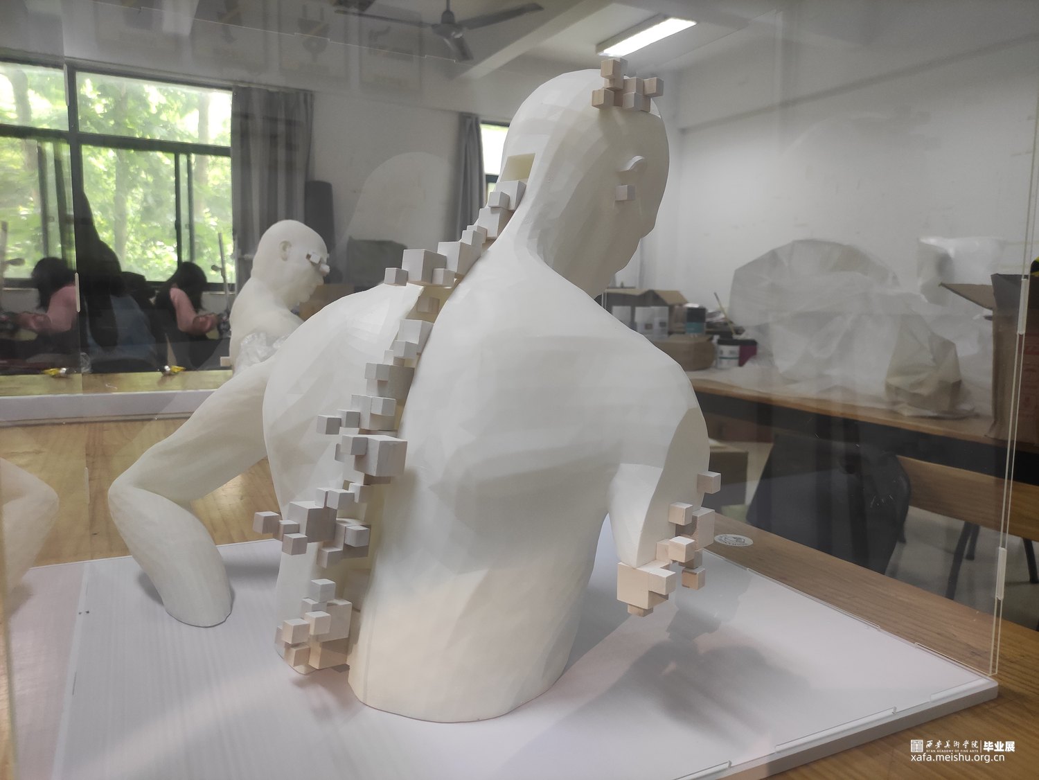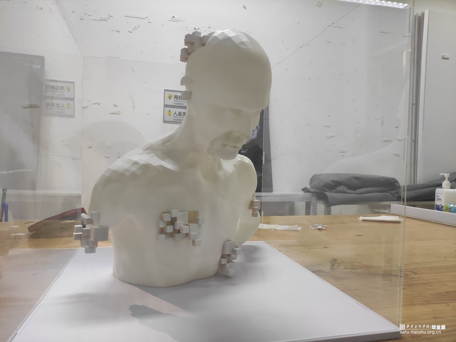 创作开始是很没有头绪的,人物模型的动作从生活中来,每一个细微的差别就有可能失去真实性,因此自己摆弄完动作还要观察其他人的动作再反复更改。伤口的切入点也斟酌了几次才敲定了最终呈现的效果,我希望用更加能让人感同身受的角度给观者留下记忆,将几何拼凑的模型与普通认知中的人体形成对比冲击感,并有了现在所展示出的艺术形式。