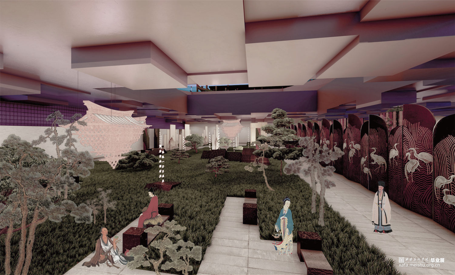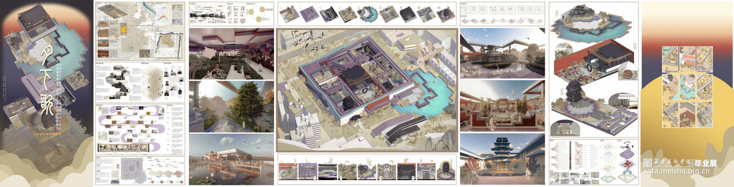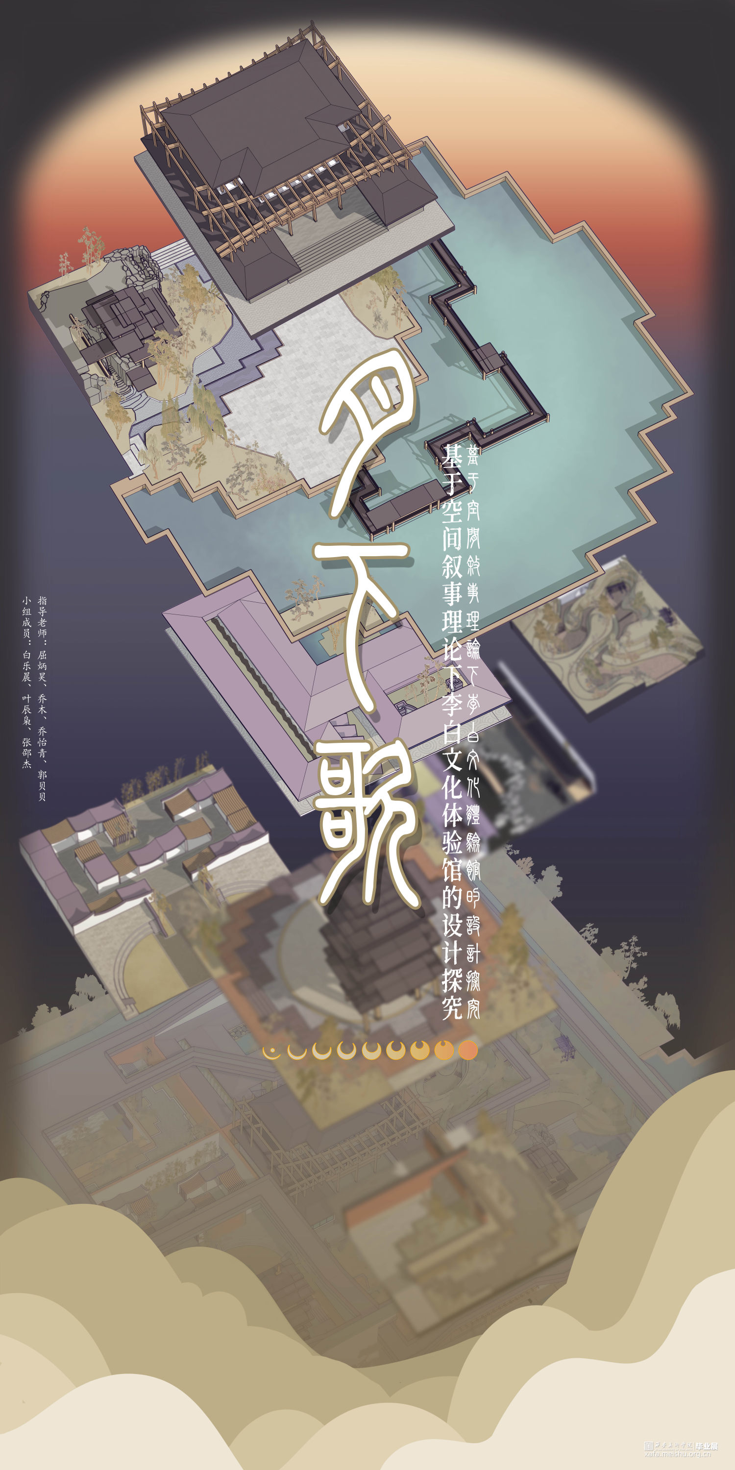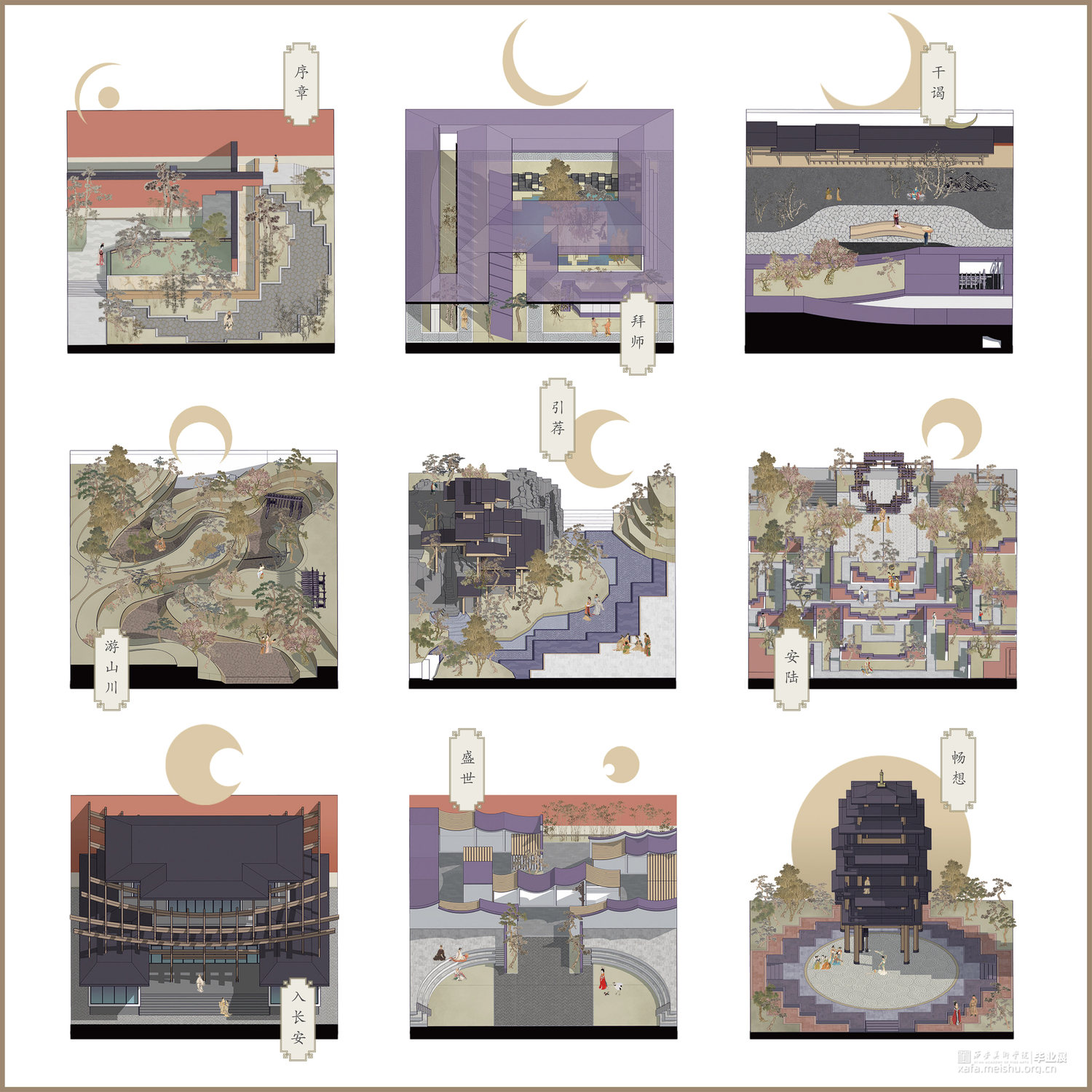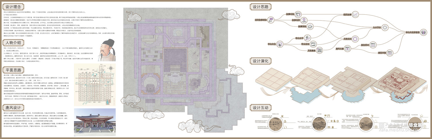 本作品意在进行李白文化体验馆的叙事性空间研究,目的在于传承传统文化,探索李白文化故事的可视化叙事性空间表达方法,经过对李白文化故事的叙事性语言要素的提炼与空间叙事营造匹配、结合、转化,完成李白文化故事的空间叙事转化,并基于时代提炼出李白文化中的优秀精神,发扬中华文化精华,歌颂时代、发扬积极向上的精神。根据诗词意象运用、故事情感提炼结合空间叙事设计原理,进行李白文化故事的空间叙事营造、设计。通过空间叙事设计,探索李白文化故事的空间再现,以此讲述李白文化故事,让体验者更好地感受、认知中国伟大历史人物李白,增强文化认同。李白文化故事的空间叙事再现是一种中国故事的空间讲述方法、指在中国文化的更好传递,实现超越时空、时代的记忆延续。