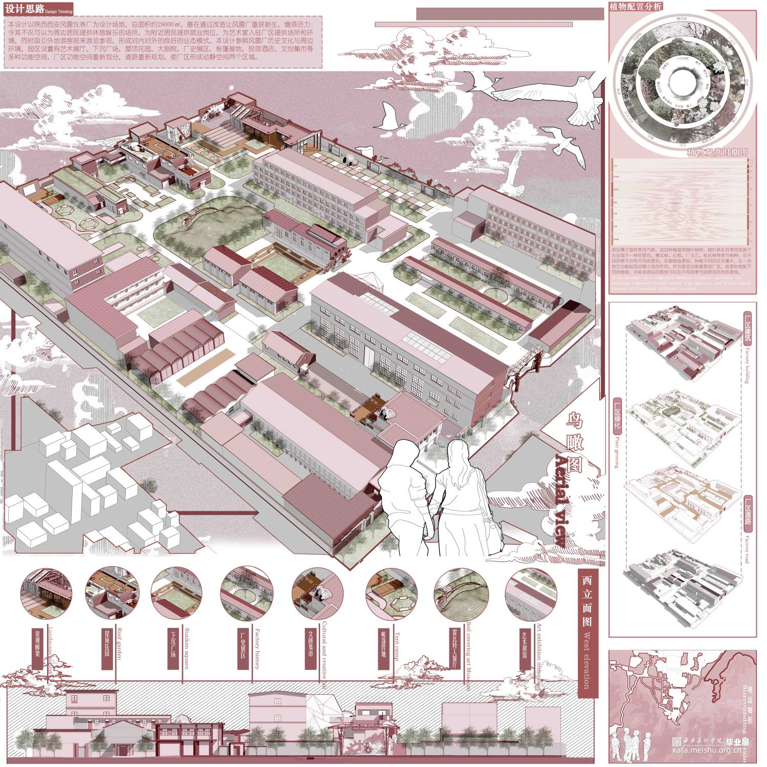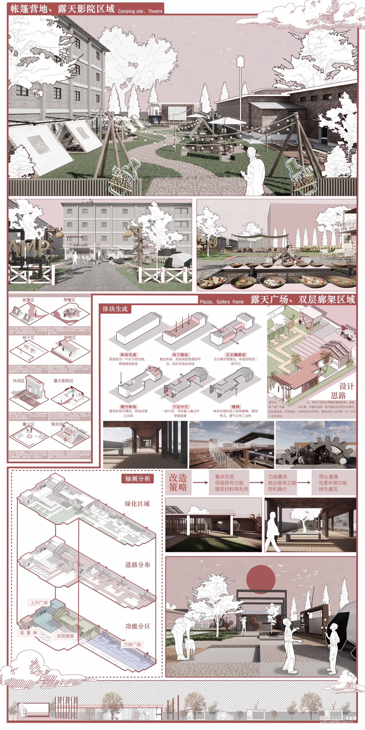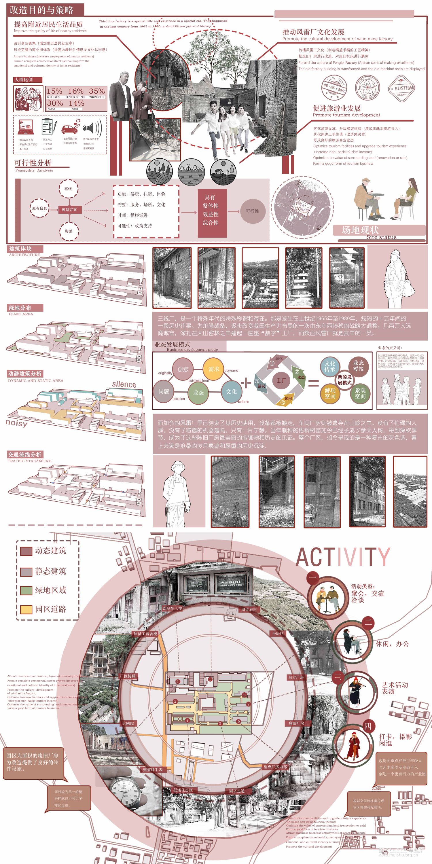 本设计以陕西西安风雷仪表厂为设计场地,总面积约29000㎡,意在通过改造让风雷厂重获新生,增添活力:令其不仅可以为周边居民提供休息娱乐的场所,为附近居民提供就业岗位,为艺术家入驻厂区提供场所和环境,同时吸引外地游客前来游览参观,形成对内对外的良好的业态模式,本设计参照风雷厂历史文化与周边环境,园区设置有艺术展厅,下沉广场,屋顶花园,大剧院,厂史展区,帐篷营地,民宿酒店,文创集市等多种功能空间,厂区功能空间重新划分,道路重新规划,使厂区形成动静空间两个区域。