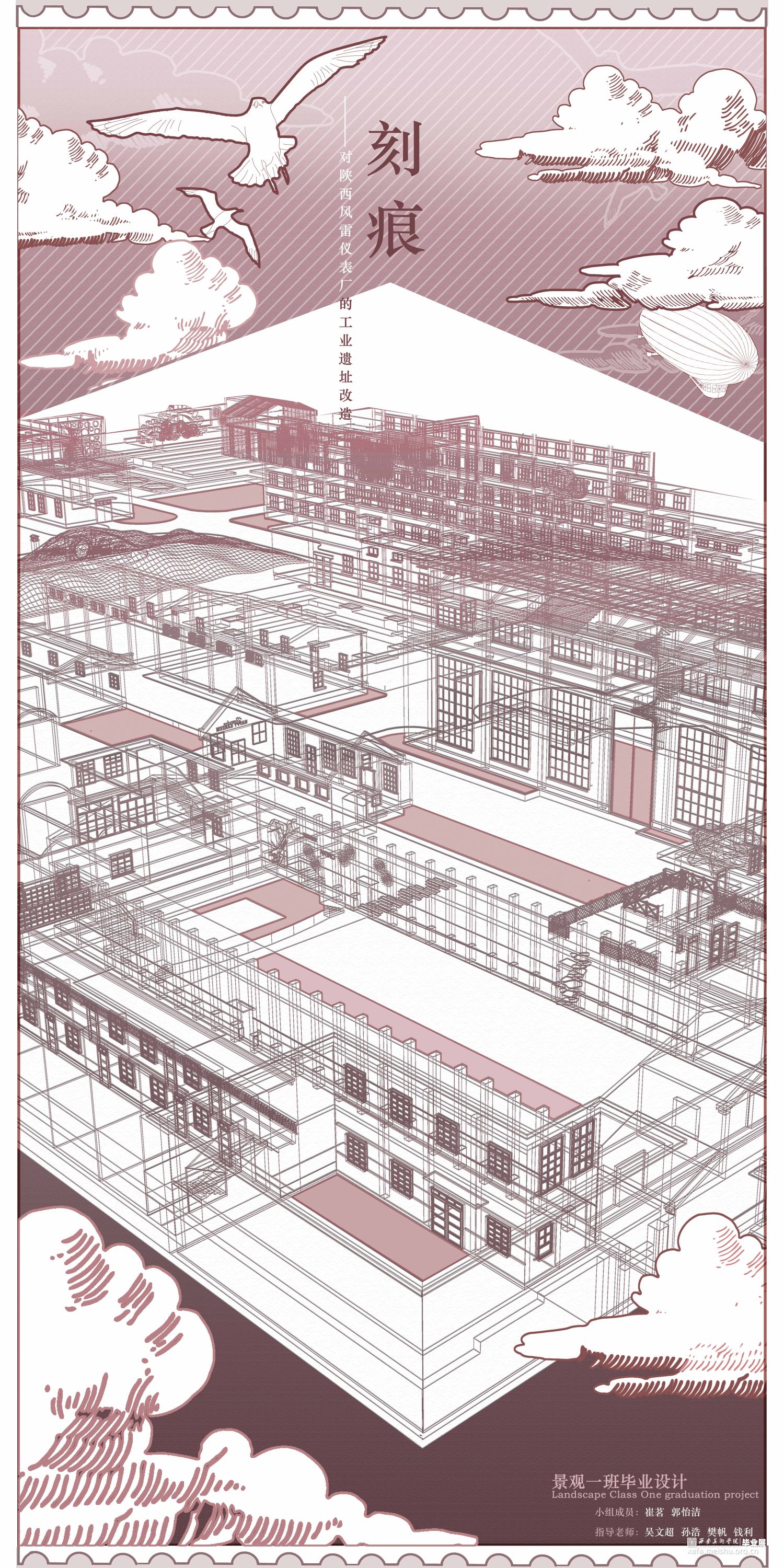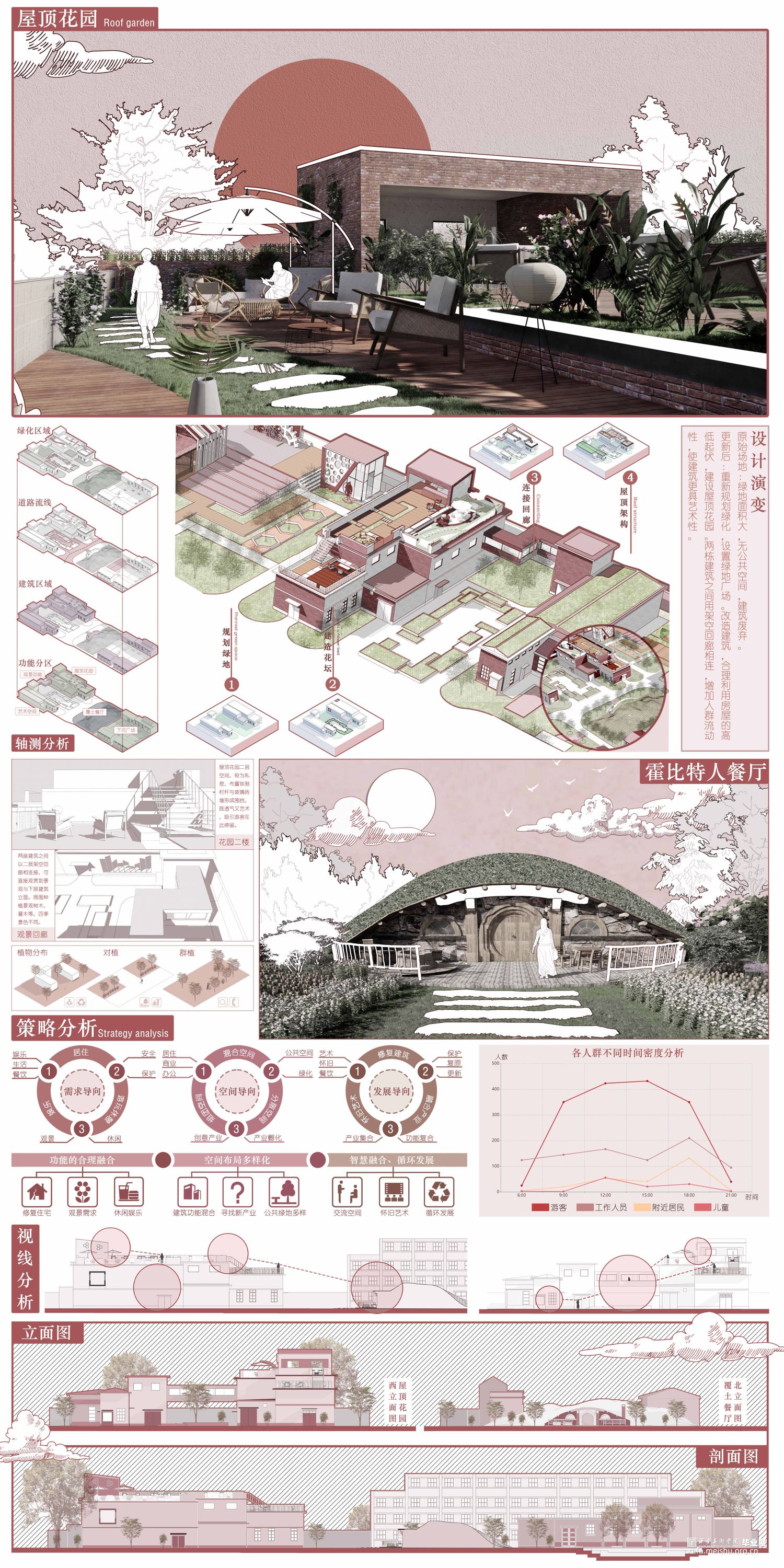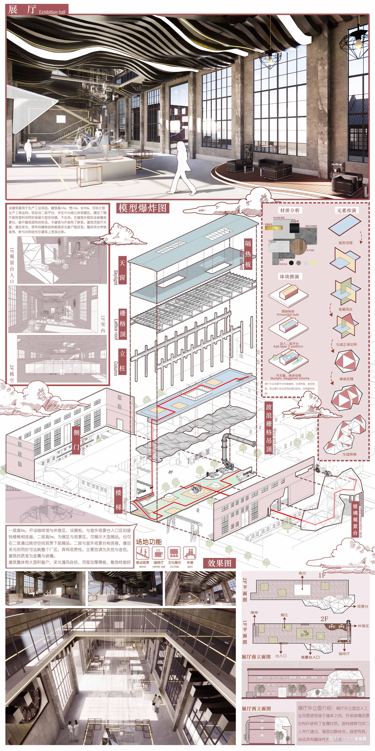 本设计以陕西西安风雷仪表厂为设计场地,总面积约29000㎡,意在通过改造让风雷厂重获新生,增添活力:令其不仅可以为周边居民提供休息娱乐的场所,为附近居民提供就业岗位,为艺术家入驻厂区提供场所和环境,同时吸引外地游客前来游览参观,形成对内对外的良好的业态模式,本设计参照风雷厂历史文化与周边环境,园区设置有艺术展厅,下沉广场,屋顶花园,大剧院,厂史展区,帐篷营地,民宿酒店,文创集市等多种功能空间,厂区功能空间重新划分,道路重新规划,使厂区形成动静空间两个区域。